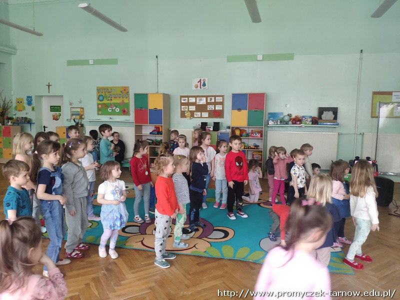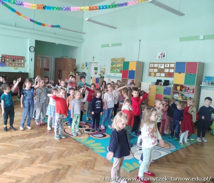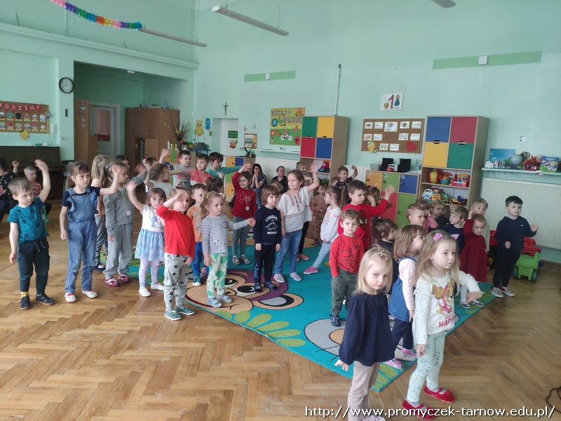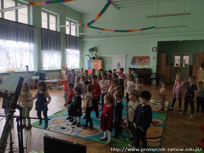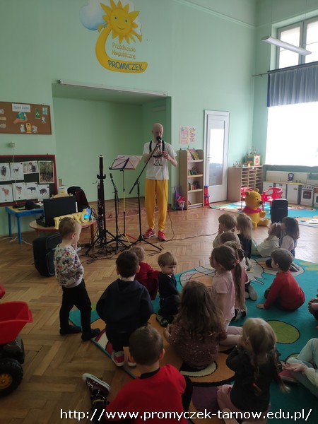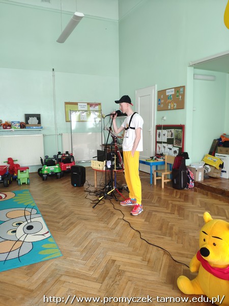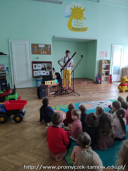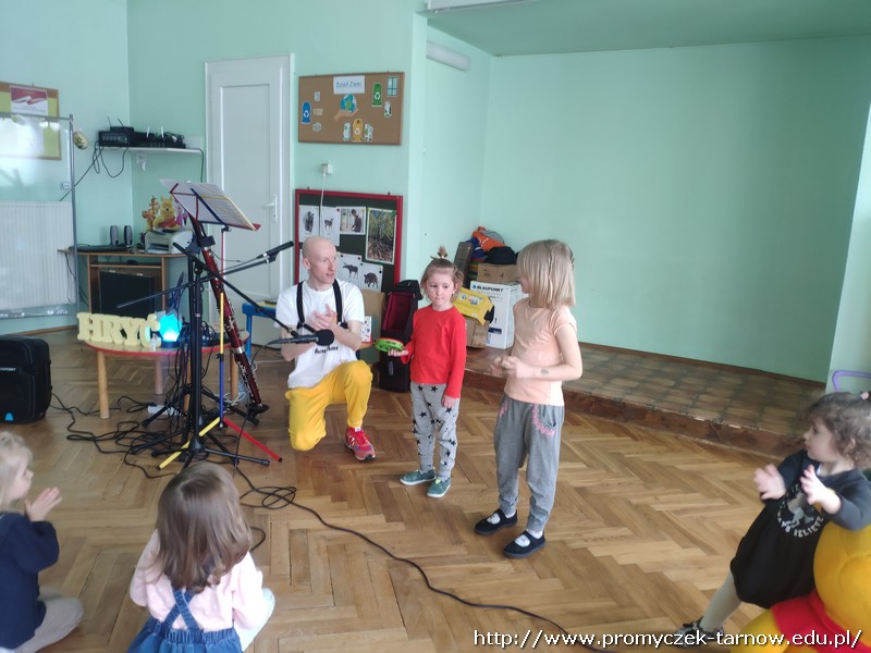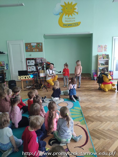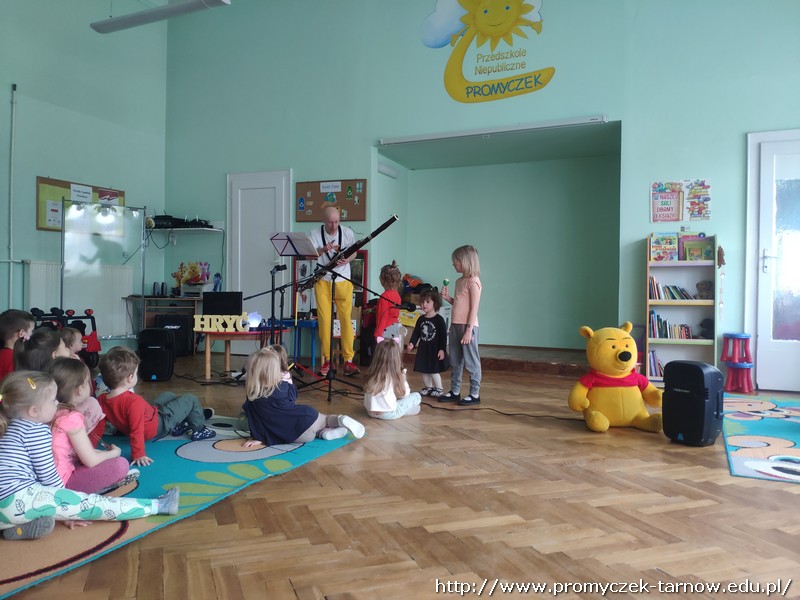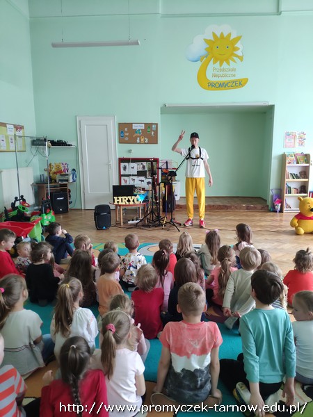 W poniedziałek 25.04. odwiedził nas gość jakiego jeszcze nie mieliśmy. Hryć to raper, który zaprezentował dzieciom tajniki rapu i hip hopu, ale także pokazał jak można łączyć w tym gatunku różne klasyczne instrumenty. Dzieci podjęły próbę rozpoznania słynnych motywów z bajek, próba była udana wiec posypały się nagrody. Na koniec spotkania dzieci zrobiły wielki "hałas" i wzięły udział w finale - były publicznością dla artysty podczas wykonania jego autorskiego przeboju.