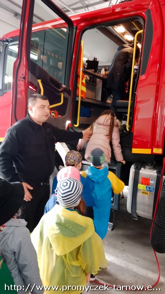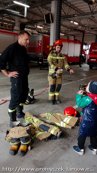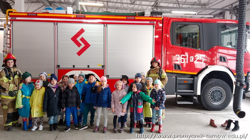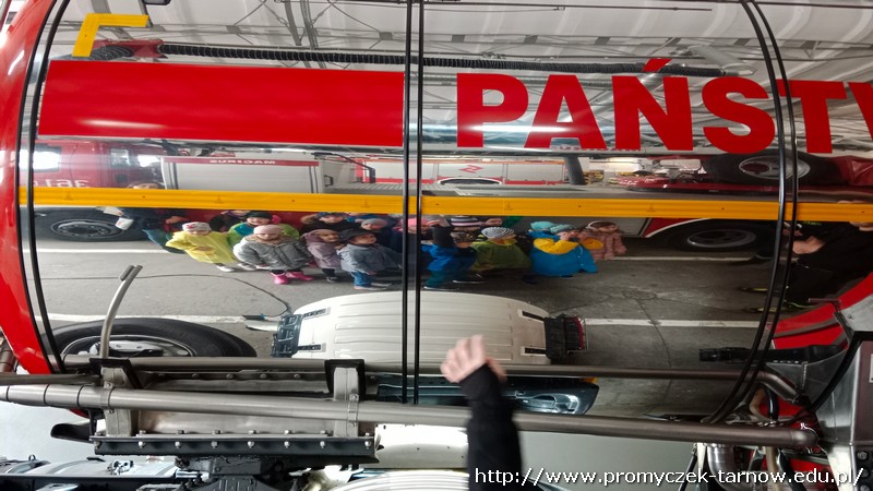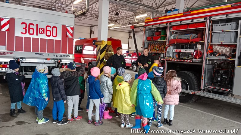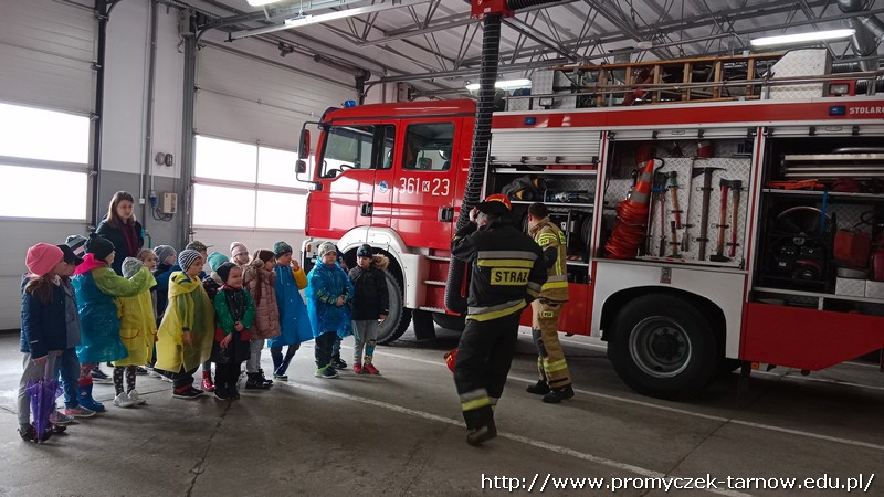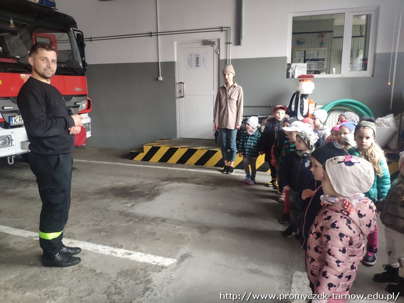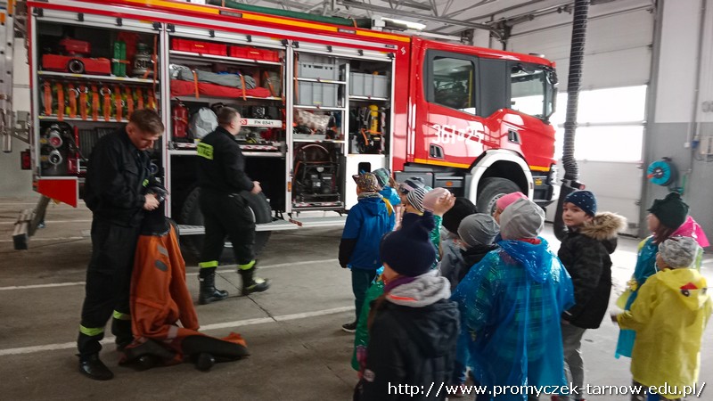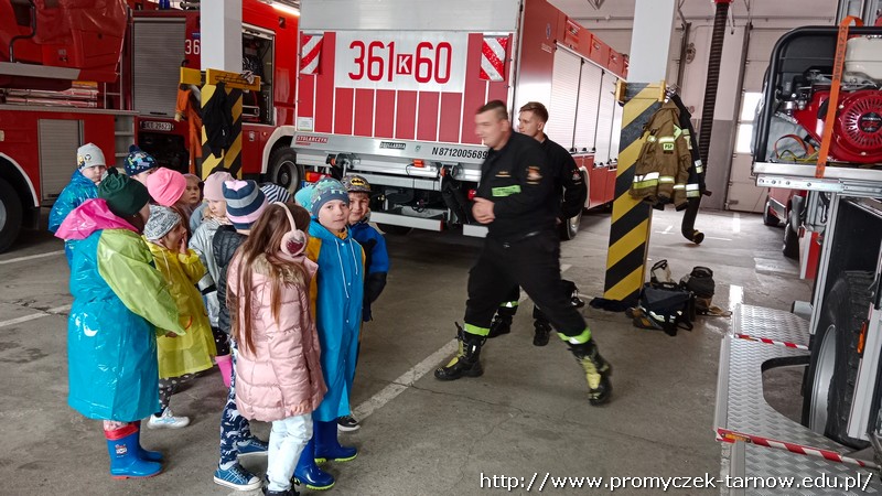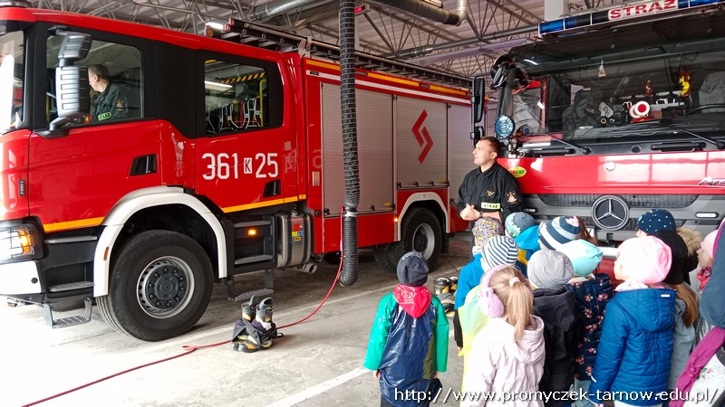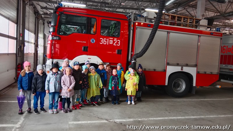 26 kwietnia promyczki udały się na małą wycieczkę do Państwowej Straży Pożarnej. Pierwszą atrakcją był przejazd autobusem miejskim, następnie dzieci udały się do budynku Straży Pożarnej, gdzie zobaczyły wozy strażackie. Pan strażak przypomniał dzieciom, że można do niego zadzwonić w razie pożaru, powodzi, wypadku, lub utknięcia wysoko na drzewie. Asy i Zuchy również wykazały się wiedzą na temat telefonu alarmowego do Straży. Później nastąpił najlepszy punkt programu czyli zwiedzanie wozu strażackiego od środka – promyczki zobaczyły jak wyglądają kaski, krótkofalówki oraz latarki strażackie. Pan strażak opowiedział również o sprzęcie jaki używają podczas akcji – wężach, gaśnicach, aparatach tlenowych, kocach, pachołkach itp. Dzieci miały okazję przymierzyć mundur strażaka, buty oraz kask, na sam koniec strażak zjechał po rurze udając się na akcję ratowniczą - dzięki temu promyczki miały okazję usłyszeć również strażackie syreny. Ta wycieczka na długo zapadnie w pamięć naszym przedszkolakom.
