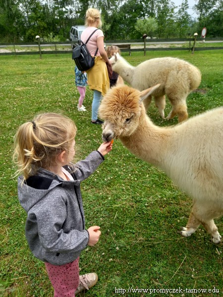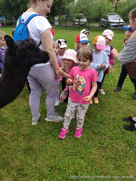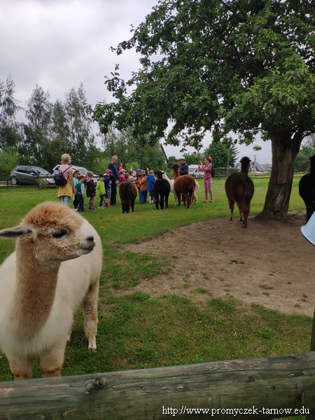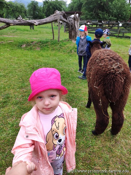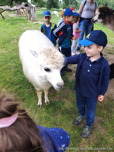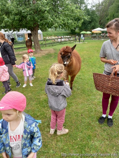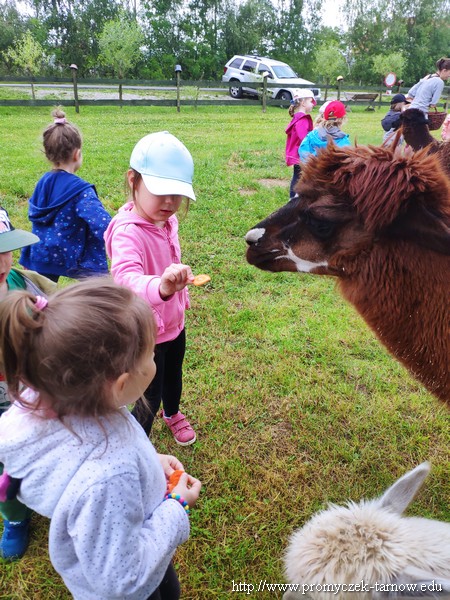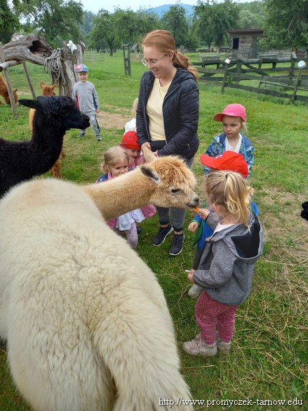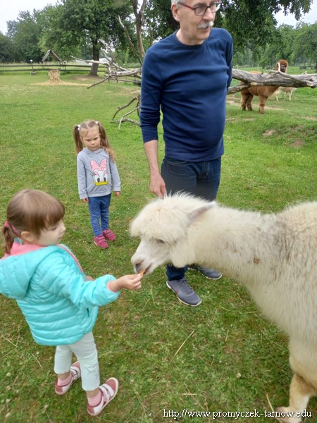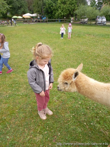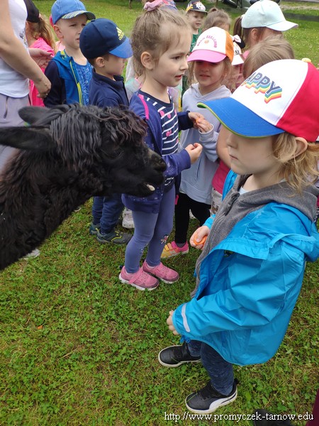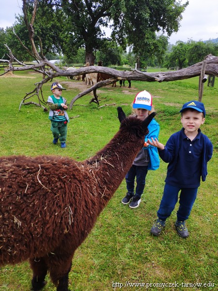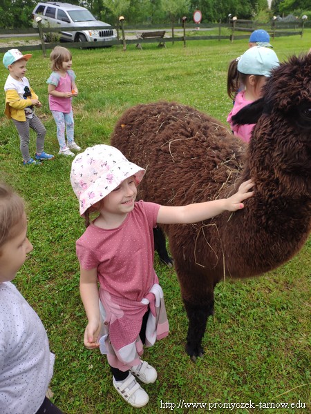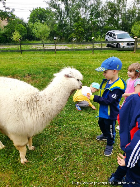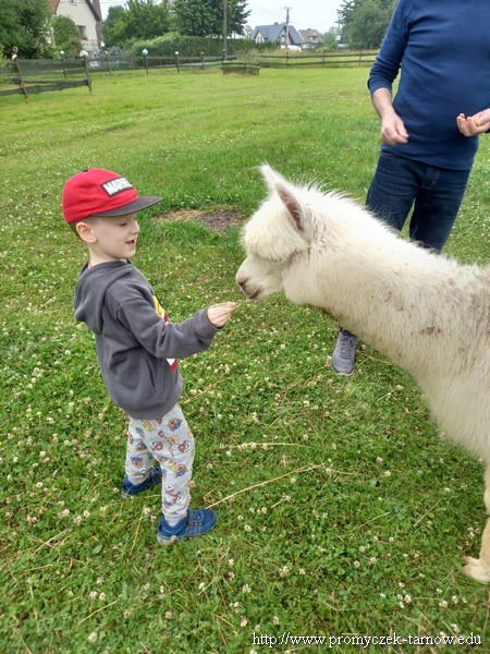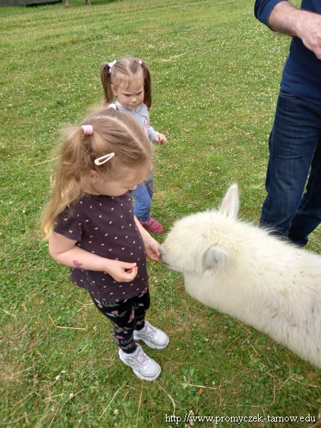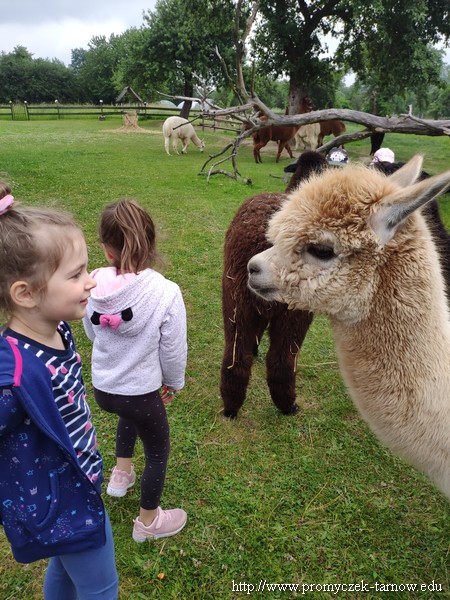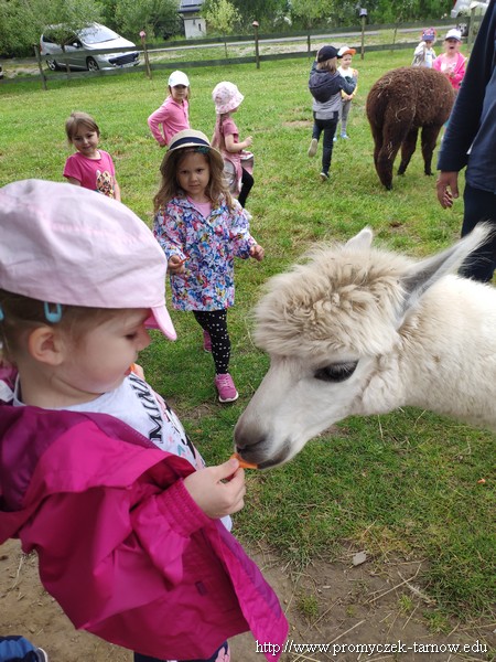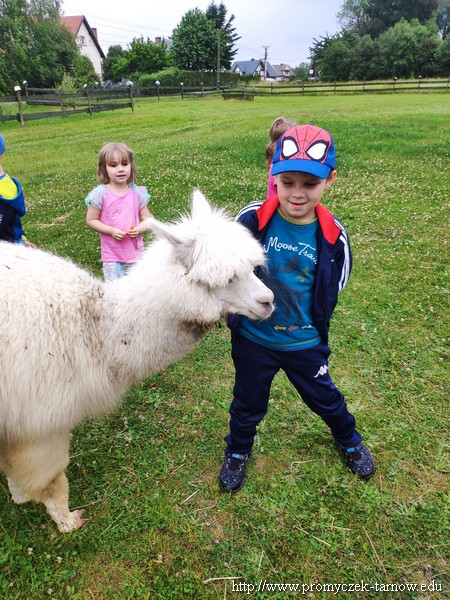 Dnia 10 czerwca, odbyła się wycieczka przedszkolna do pięknego miejsca Jaśkowy sad w miejscowości Czchów. Wszystkie promyczki ochoczo przybyły rano do przedszkola, aby zaraz po śniadaniu udać się autokarem na wycieczkę. Niecierpliwe przedszkolaki wypatrywały przez okno gdzie jedziemy. Po dojechaniu na miejsce przywitał nas miły Pan, który opowiedział o alpakach -skąd pochodzą, jakie mają zwyczaje i jak trzeba się przy nich zachować. Po wysłuchaniu krótkiego przemówienia promyczki zostały zaproszone na poczęstunek - pyszna lemoniadę oraz babeczkę z czekoladą. gdy juz wszystkie promyczki miały silę na spotkanie z alpakami pan gospodarz wziął pod rękę koszyk z marchewkami i zaprosił dzieci do zwierząt. Wszystkie przedszkolaki ochoczo karmiły alpaki oraz głaskały ich miękkie futerko. Na zakończenie każdy dostał mały kaktusik oraz naklejkę z alpaką. Wszystkie dzieci szczęśliwe i zmęczone udały się z paniami do przedszkola. Mamy nadzieje, że za rok wycieczka będzie równie udana :)