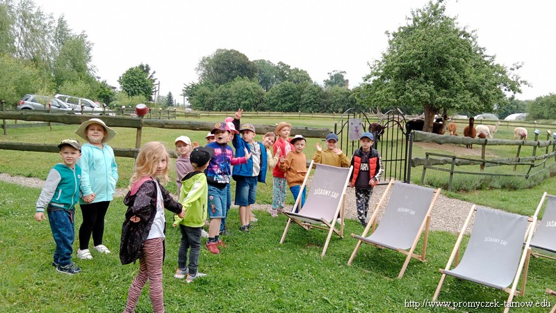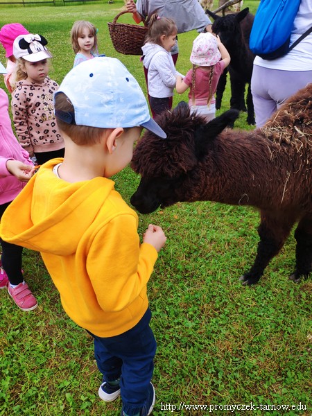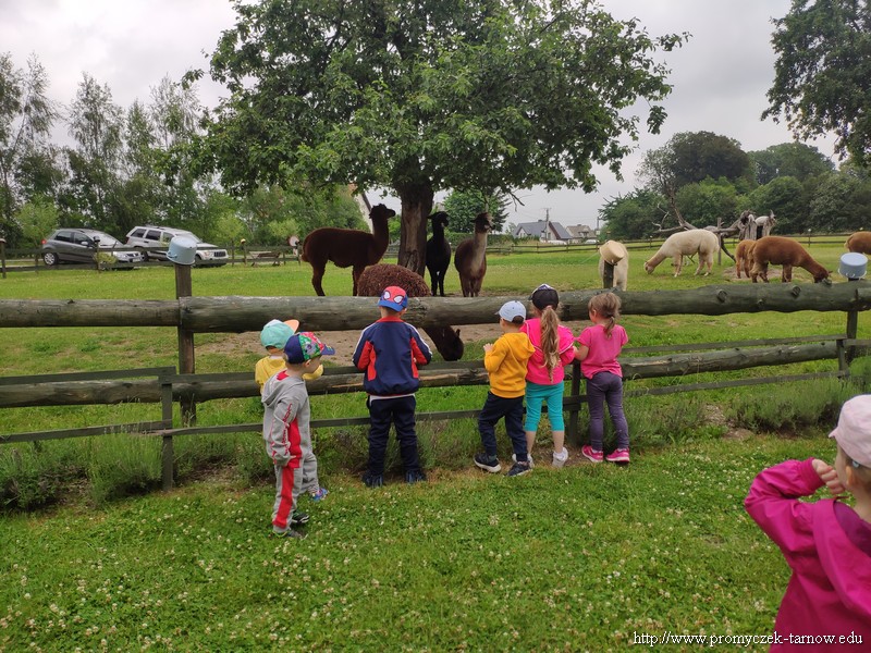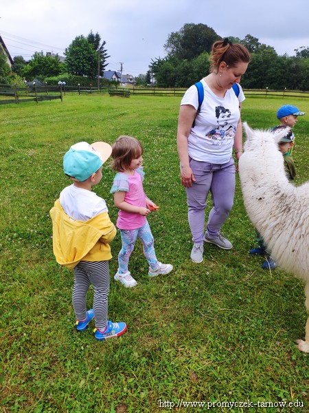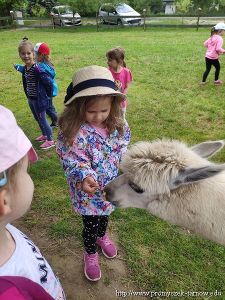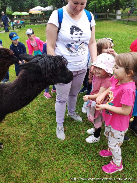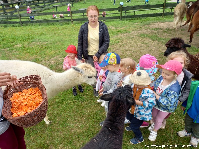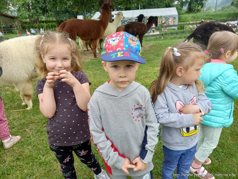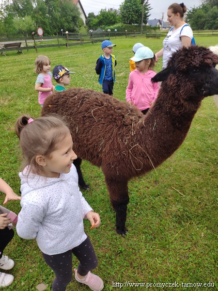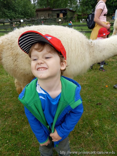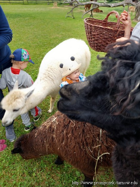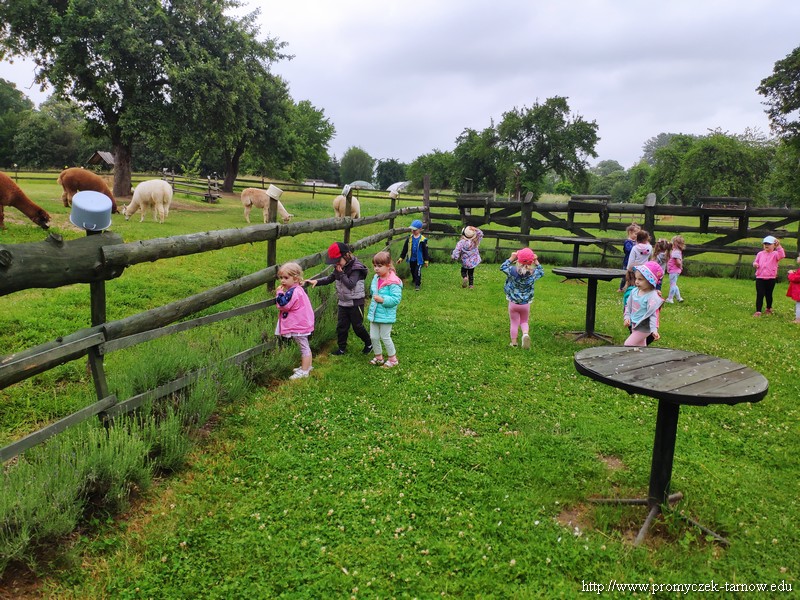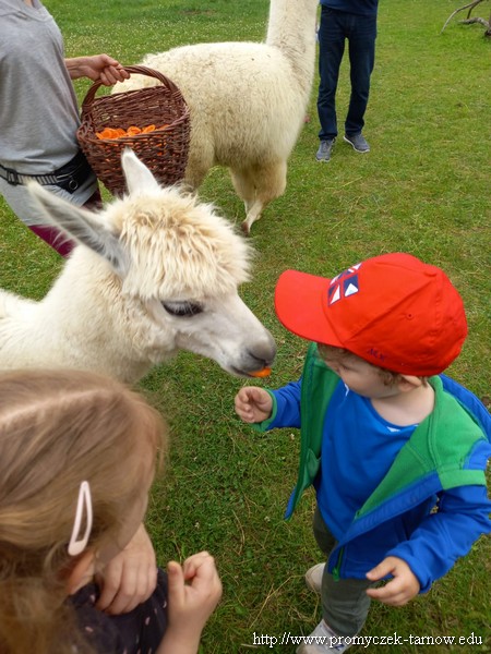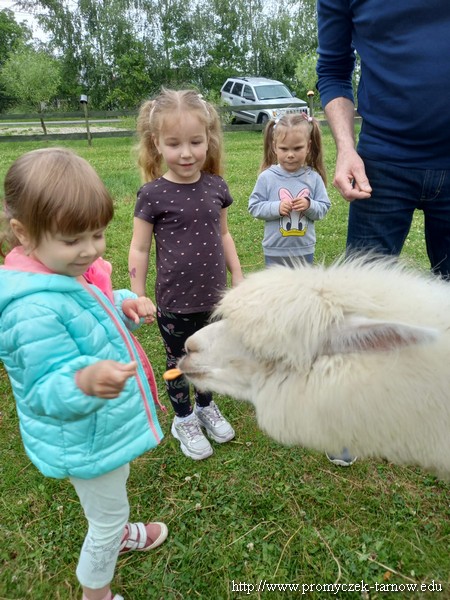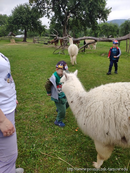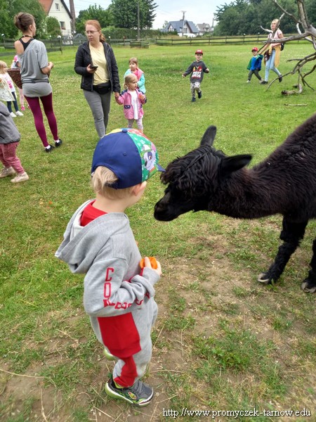 Dnia 10 czerwca, odbyła się wycieczka przedszkolna do pięknego miejsca Jaśkowy sad w miejscowości Czchów. Wszystkie promyczki ochoczo przybyły rano do przedszkola, aby zaraz po śniadaniu udać się autokarem na wycieczkę. Niecierpliwe przedszkolaki wypatrywały przez okno gdzie jedziemy. Po dojechaniu na miejsce przywitał nas miły Pan, który opowiedział o alpakach -skąd pochodzą, jakie mają zwyczaje i jak trzeba się przy nich zachować. Po wysłuchaniu krótkiego przemówienia promyczki zostały zaproszone na poczęstunek - pyszna lemoniadę oraz babeczkę z czekoladą. gdy juz wszystkie promyczki miały silę na spotkanie z alpakami pan gospodarz wziął pod rękę koszyk z marchewkami i zaprosił dzieci do zwierząt. Wszystkie przedszkolaki ochoczo karmiły alpaki oraz głaskały ich miękkie futerko. Na zakończenie każdy dostał mały kaktusik oraz naklejkę z alpaką. Wszystkie dzieci szczęśliwe i zmęczone udały się z paniami do przedszkola. Mamy nadzieje, że za rok wycieczka będzie równie udana :)