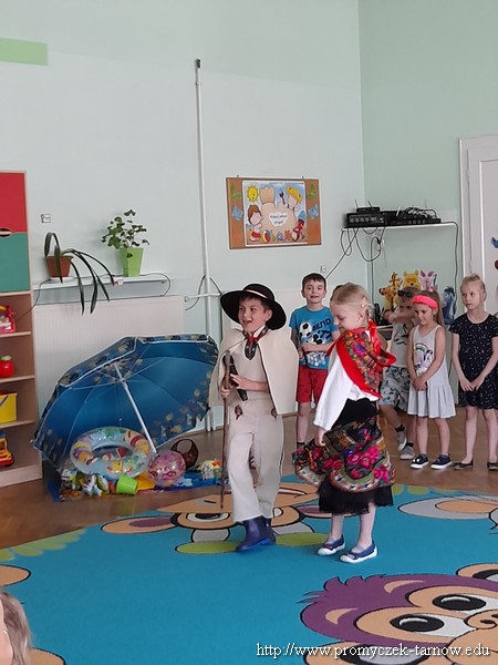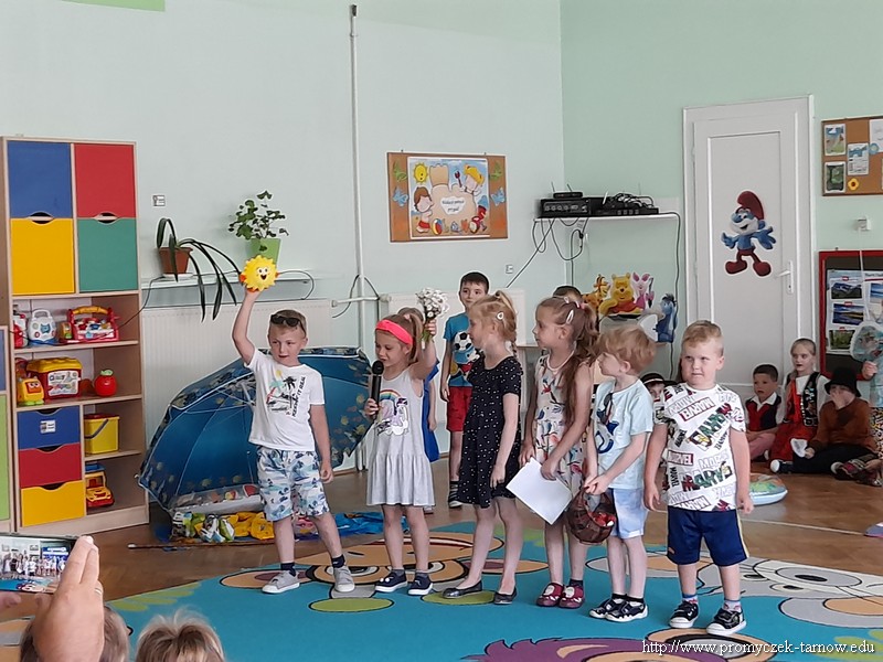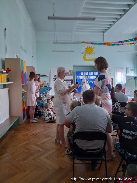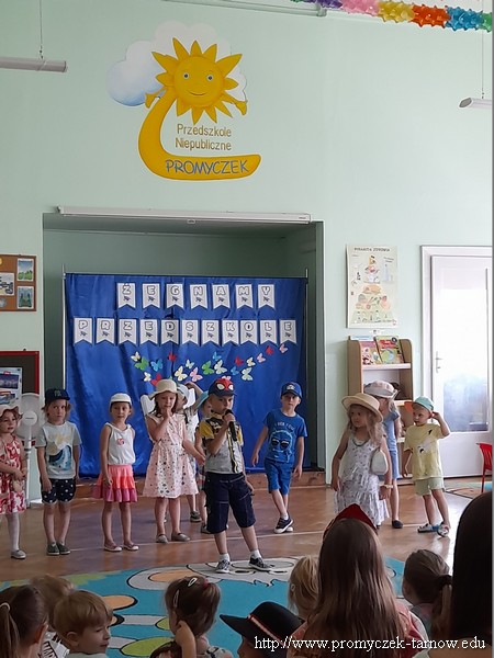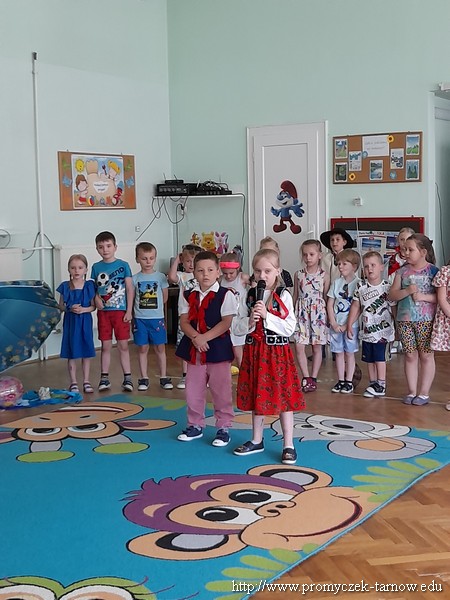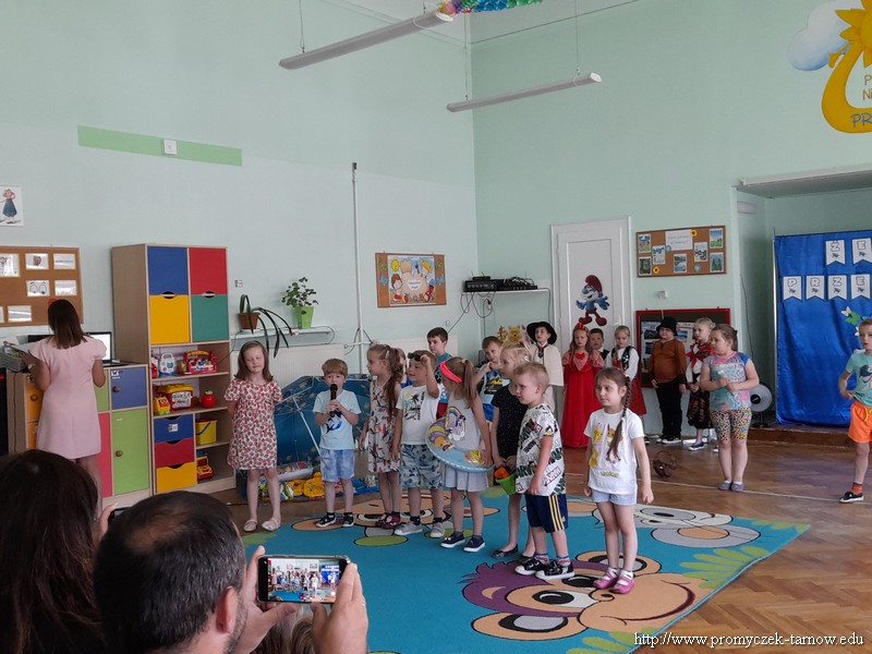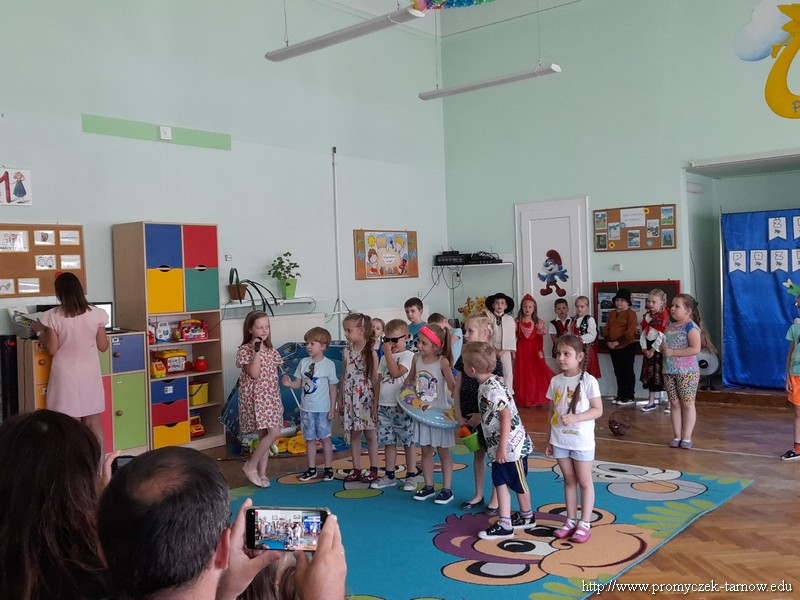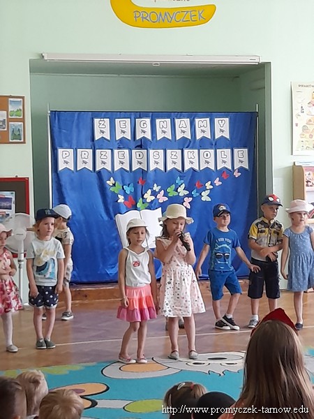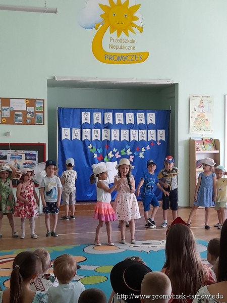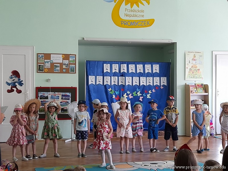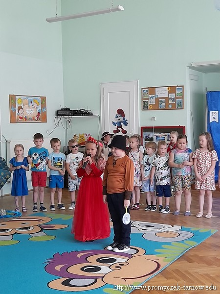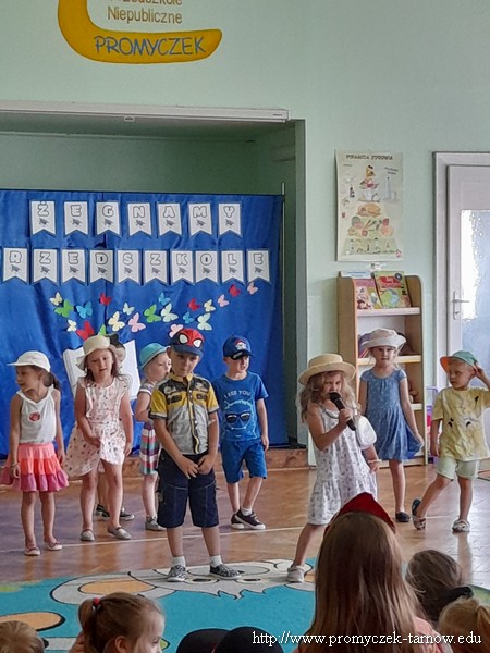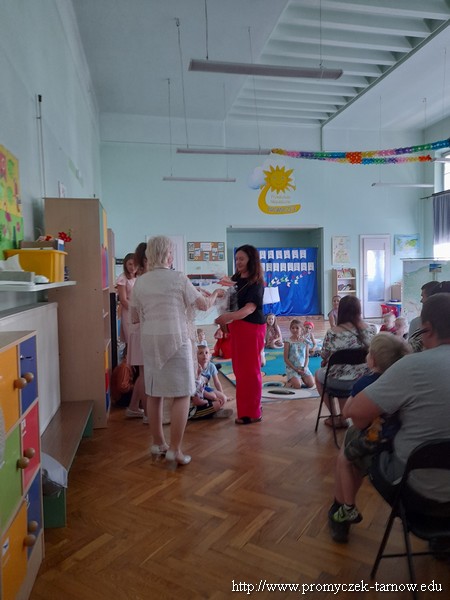 Na początku wystąpiły dzieci z grup Smyki i Asy. Dzieci zaśpiewały piosenki, wierszykiem pożegnały starszych kolegów kończących przedszkole oraz popisały się tańcem. Na zakończenie najważniejszy punkt uroczystości- występ 6 latków.Starszaki dostojnie prezentowały swoje umiejętności artystyczne, recytatorskie i taneczne.