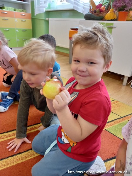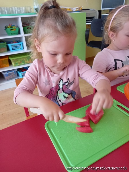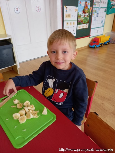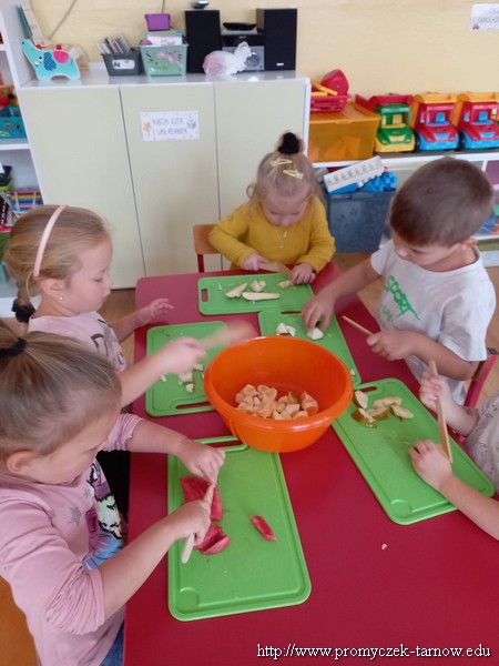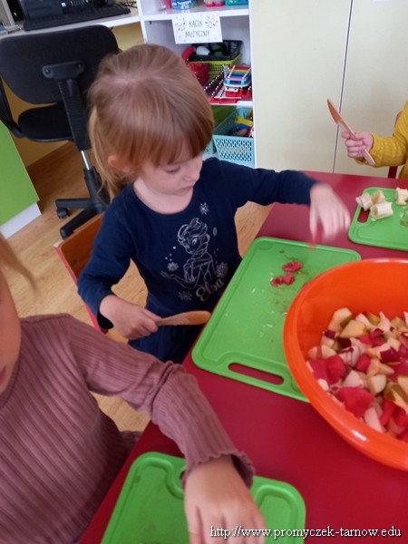 W ostatnim tygodniu września w przedszkolu królowała tematyka przybyłej do nas jesieni. Dzieci poznawały i utrwalały informacje o darach tej pory roku, próbowały ją scharakteryzować oraz posmakować. Asy przerabiając temat jesiennego sadu wykonały kompocik z jabłek z dodatkiem przypraw korzennych, takich jak goździki czy cynamon. Innym razem zaś dzieciaki przygotowały dla siebie słodki, ale bardzo zdrowy podwieczorek. Po przygotowaniu miejsc pracy, umyciu rąk, przypomnieniu zasad bezpieczeństwa w kuchni Asy rozpoczęły krojenie owoców na sałatkę owocową. Przysmak bardzo zasmakował przedszkolakom, nawet nasze niejadki pokusiły się o spróbowanie własnoręcznie wykonanego posiłku. Sałatka owocowa dostarczyła Asom wielu witamin, ale także dużo świetnej zabawy i satysfakcji z wykonanego zadania.
