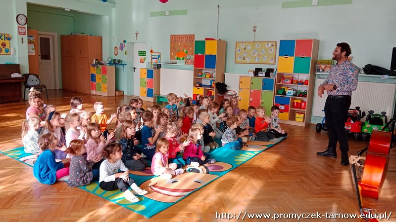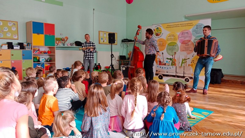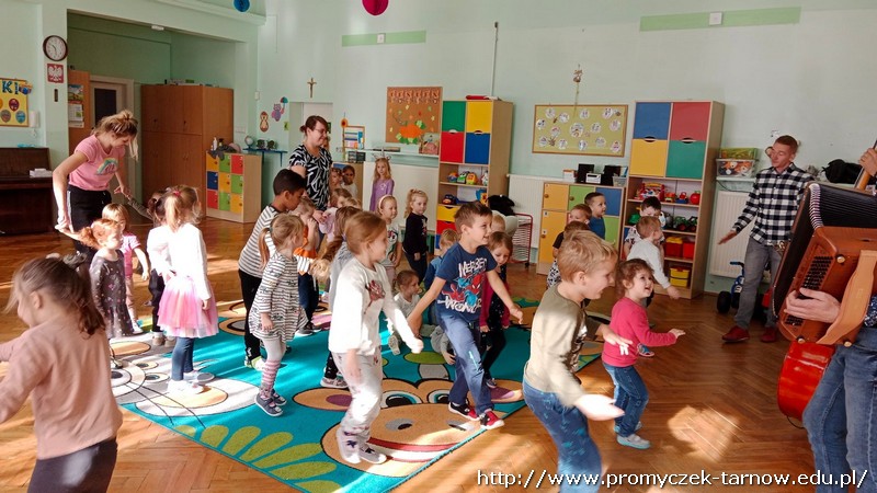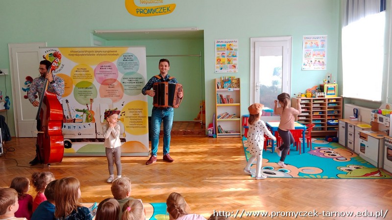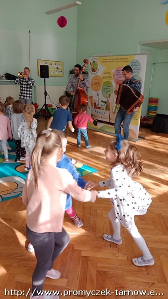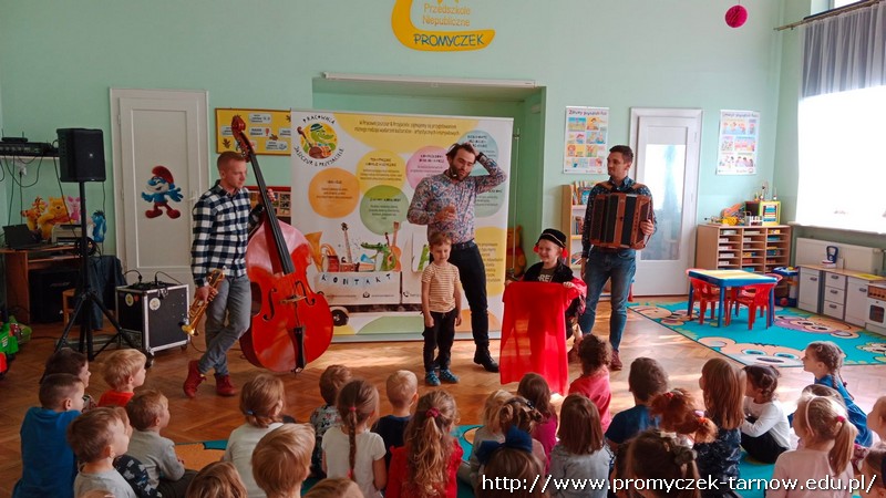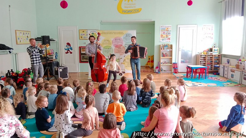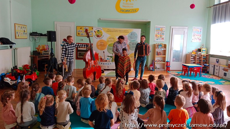 W dniu 21 października dzieci z przedszkola miały możliwość uczestniczenia w pierwszej audycji muzycznej w tym roku pt. „Podroż dookoła świata muzycznym samolotem” razem z grupą muzyczną Jaszczur& Przyjaciele. Dzieci odwiedziły takie kraje jak: Meksyk, Hiszpania, Kanada, Stany Zjednoczone, Ukraina i Polska, słuchając ciekawostek dotyczących muzyki oraz regionalnych strojów. Wysłuchały i zobaczyły takie instrumenty muzyczne jak: akordeon, kontrabas, czy trąbka . Podczas muzycznego spotkania dzieci angażowały się w wykonywanie różnych zadań.