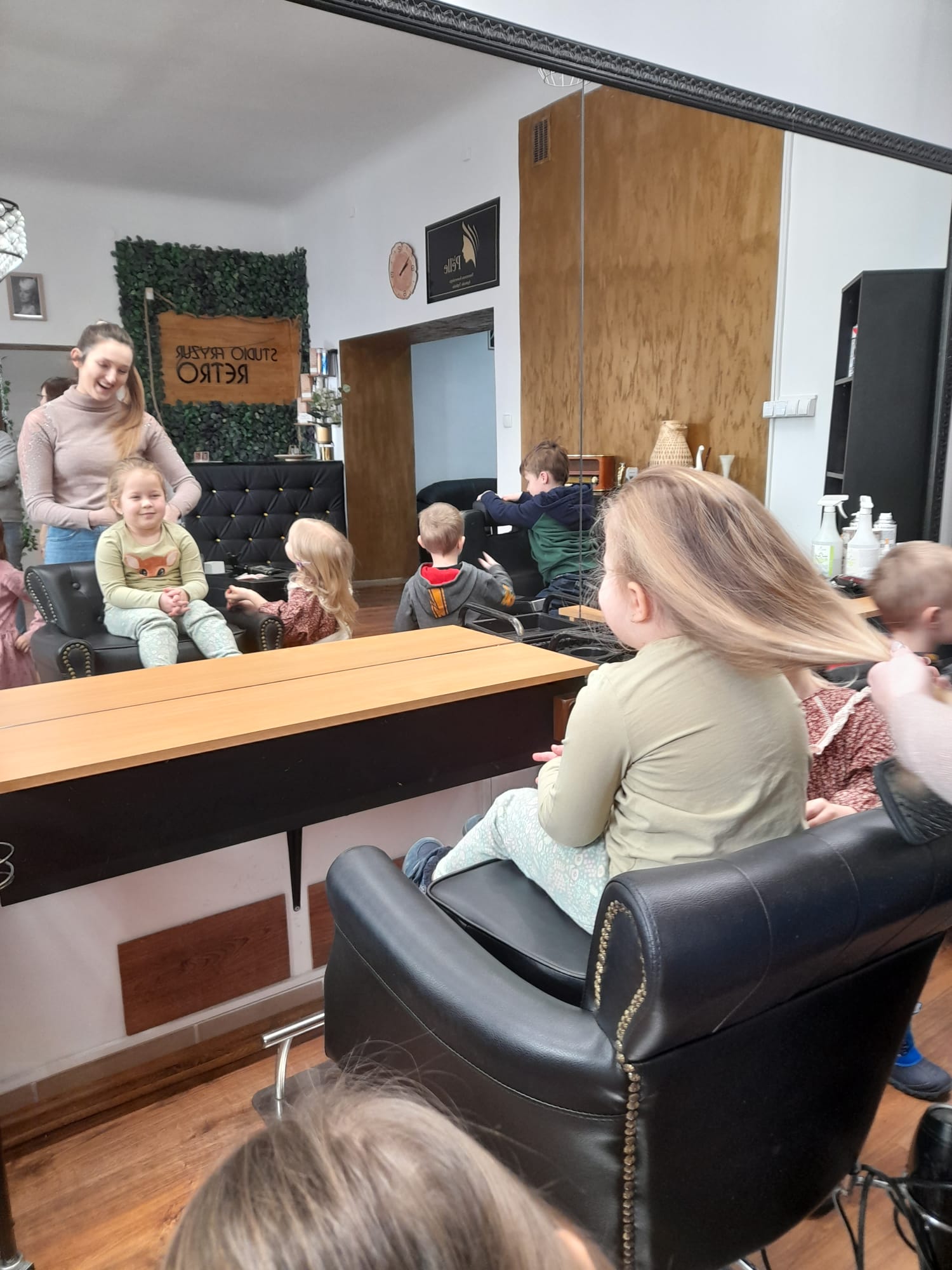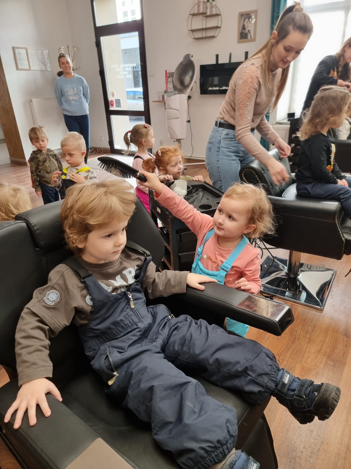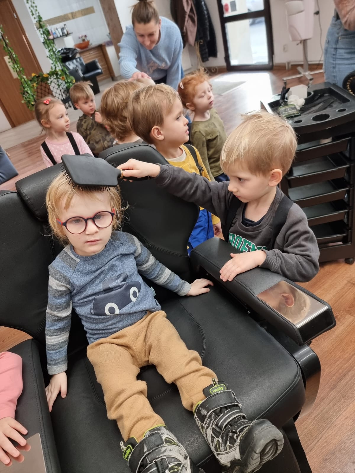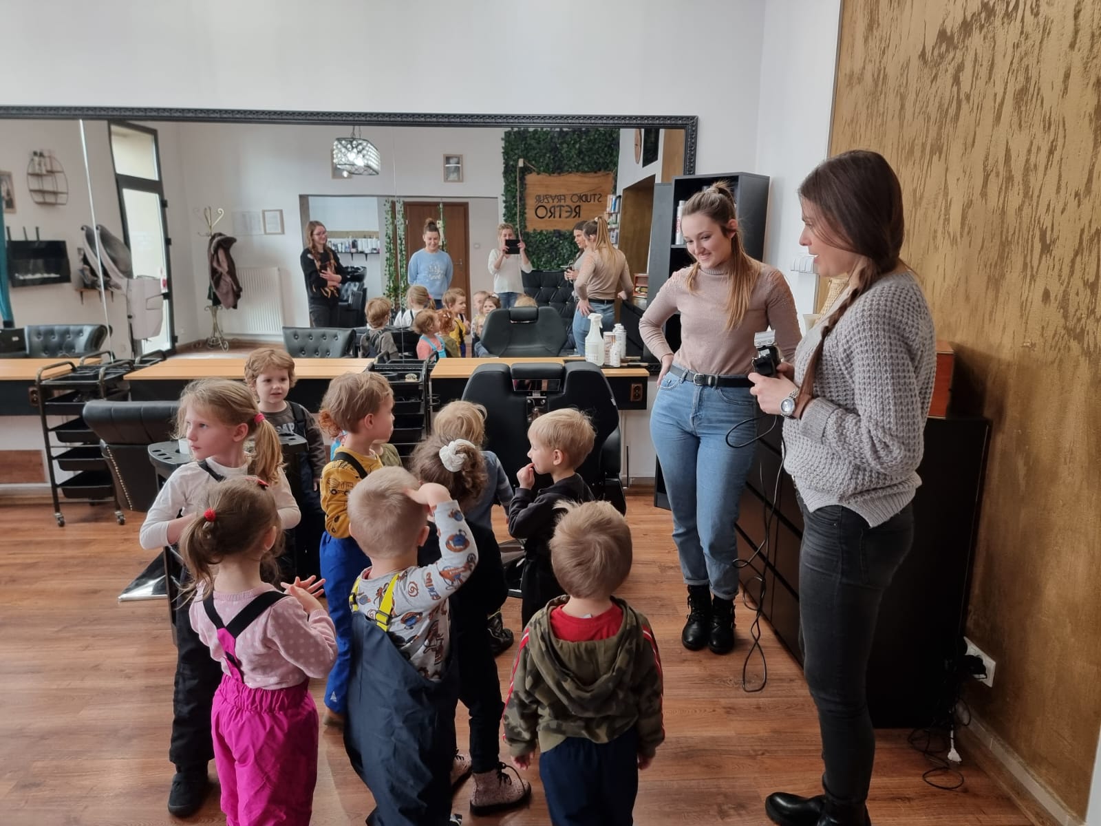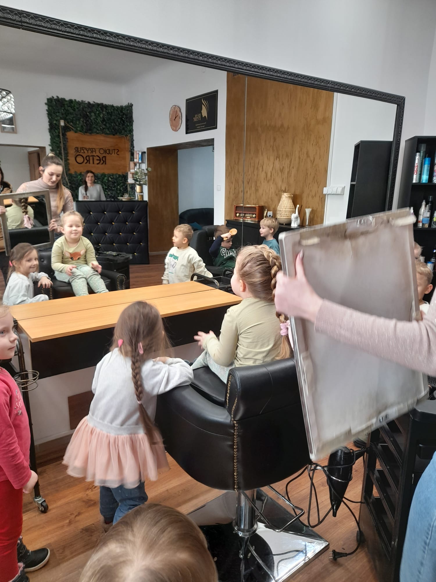 Czym zajmuje się fryzjer? Jak wygląda salon fryzjerski? Na te oraz wiele innych pytań nasze przedszkolaki usłyszały odpowiedzi podczas wycieczki do sąsiadującego z przedszkolem salonu fryzjerskiego. Celem naszego wyjścia było poznanie zawodu fryzjera, miejsca, w którym pracuje i jego atrybutów. Przemiłe panie fryzjerki przygotowały bardzo wartościową prelekcję, pokazały akcesoria, których używają w swojej codziennej pracy oraz uczesały chętne dzieci. Na włosach dziewczynek pojawiły się piękne warkocze, chłopcy próbowali swoich sił w tej profesji, a na koniec odbył się konkurs podsumowujący wizytę w salonie, w efekcie którego dzieci wróciły do przedszkola ze wzbogaconą wiedzą o fryzjerstwie oraz z nagrodami. Serdecznie dziękujemy Paniom ze Studio Retro za miłe przyjęcie Promyczków!