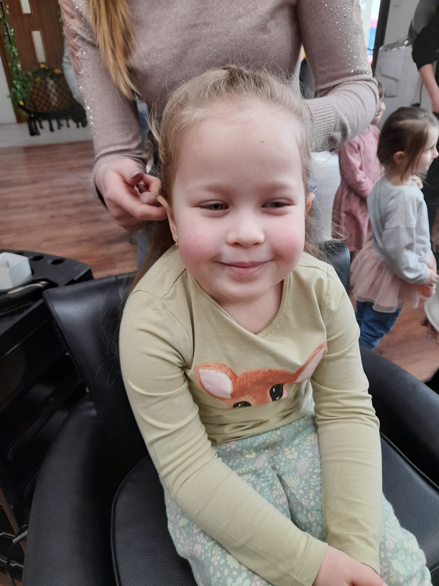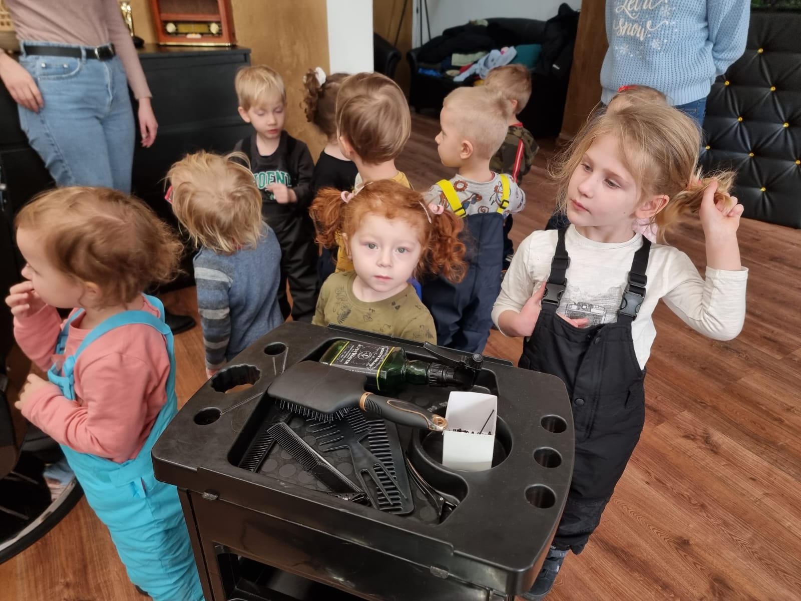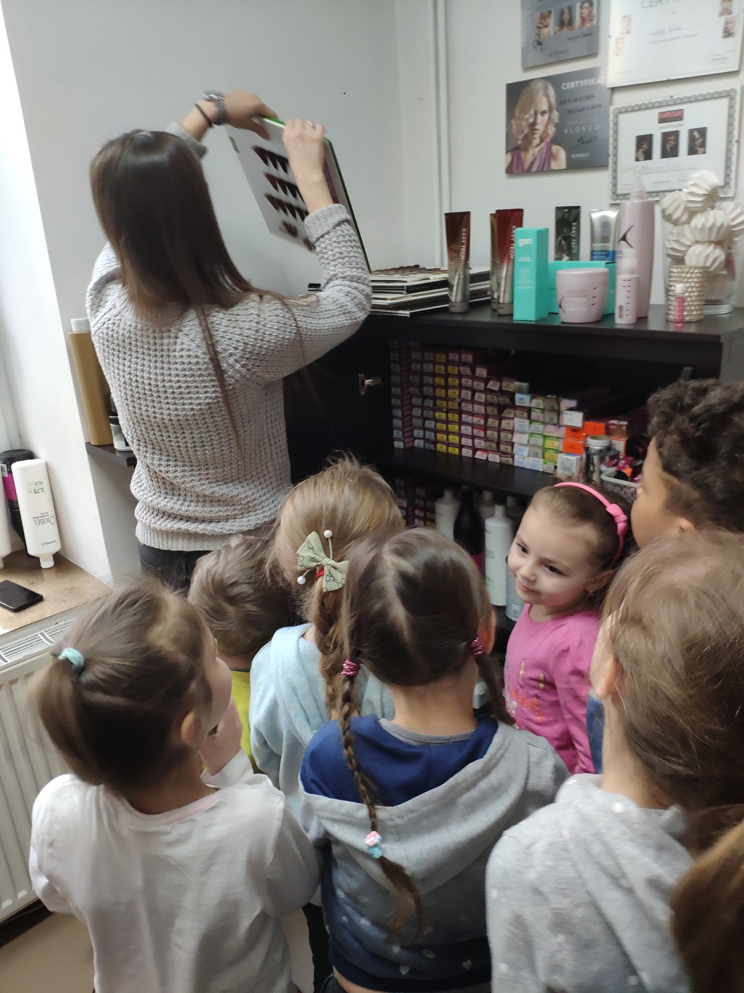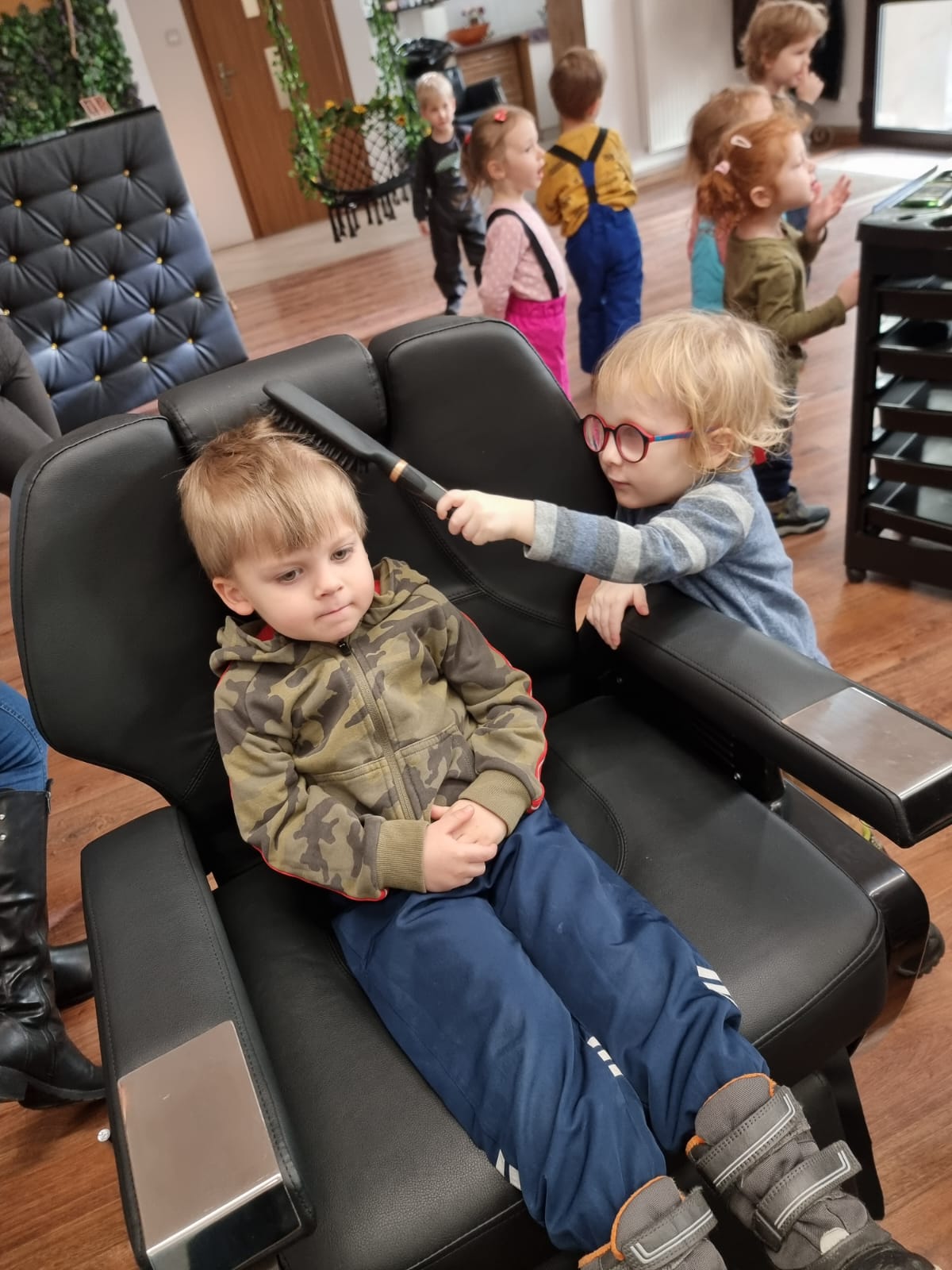 Czym zajmuje się fryzjer? Jak wygląda salon fryzjerski? Na te oraz wiele innych pytań nasze przedszkolaki usłyszały odpowiedzi podczas wycieczki do sąsiadującego z przedszkolem salonu fryzjerskiego. Celem naszego wyjścia było poznanie zawodu fryzjera, miejsca, w którym pracuje i jego atrybutów. Przemiłe panie fryzjerki przygotowały bardzo wartościową prelekcję, pokazały akcesoria, których używają w swojej codziennej pracy oraz uczesały chętne dzieci. Na włosach dziewczynek pojawiły się piękne warkocze, chłopcy próbowali swoich sił w tej profesji, a na koniec odbył się konkurs podsumowujący wizytę w salonie, w efekcie którego dzieci wróciły do przedszkola ze wzbogaconą wiedzą o fryzjerstwie oraz z nagrodami. Serdecznie dziękujemy Paniom ze Studio Retro za miłe przyjęcie Promyczków!