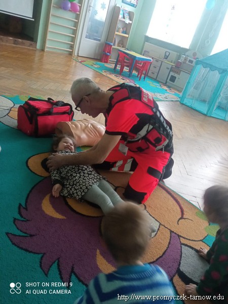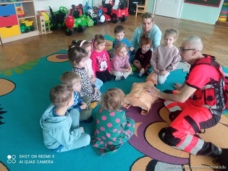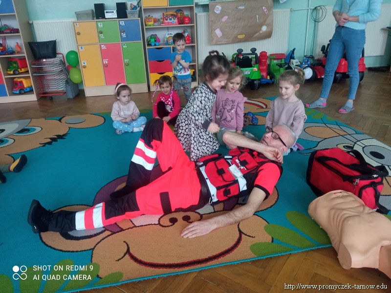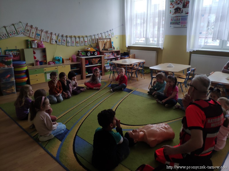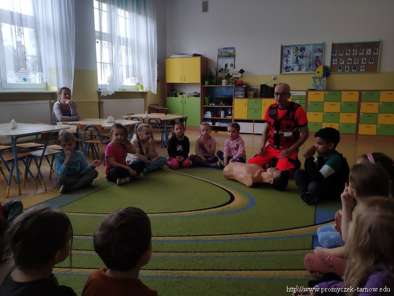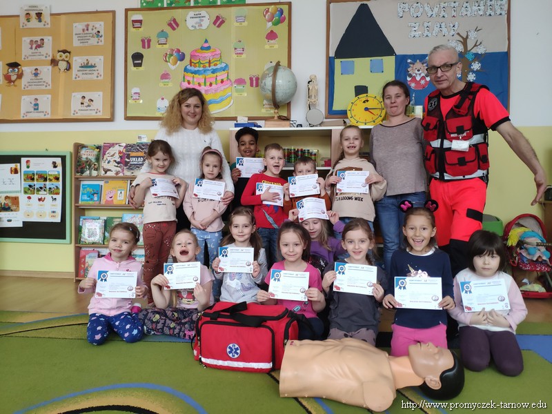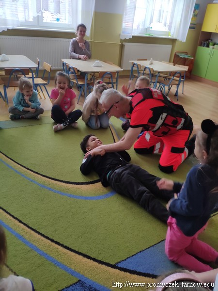 Dnia 15 lutego w Promyczku pojawił się wyjątkowy gość, przebrany w jaskrawe ubranie, z wielką torbą i dziwnym rekwizytem u boku. Starsze grupy od razu zgadły, że jest to pan ratownik, który nauczy ich jak zachowywać się w sytuacji zagrożenia życia i samemu stać się małym ratownikiem. Pan Przemek udł się do każdej z grup, aby pokazać jak wykonać masaż klatki piersiowej, jeżeli ktoś jest nieprzytomny i nieoddycha. Następnie promyczki zobaczyły jak należy ustawić osobę nieprzytomną ale oddychającą, w pozycji bocznej bezpiecznej. Wszystkie dzieci wykonały najpierw masaż serca na fantomie oraz pokazywały na sobie pozycję boczną. Ratownik nauczył ich również telefonów alarmowych, na które należy zadzwonić w sytuacji zagrożenia. Wszystkie przedszkolaki były bardzo zadowolone z odwiedzin i świetnie się spisały, dlatego też na każdego czekał pamiątkowy dyplom.