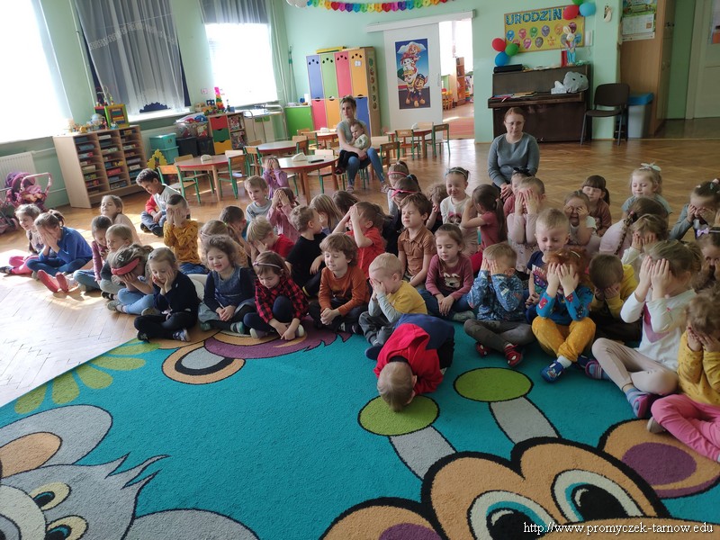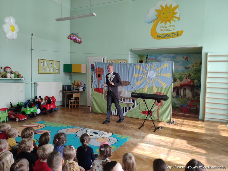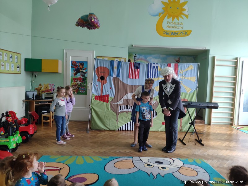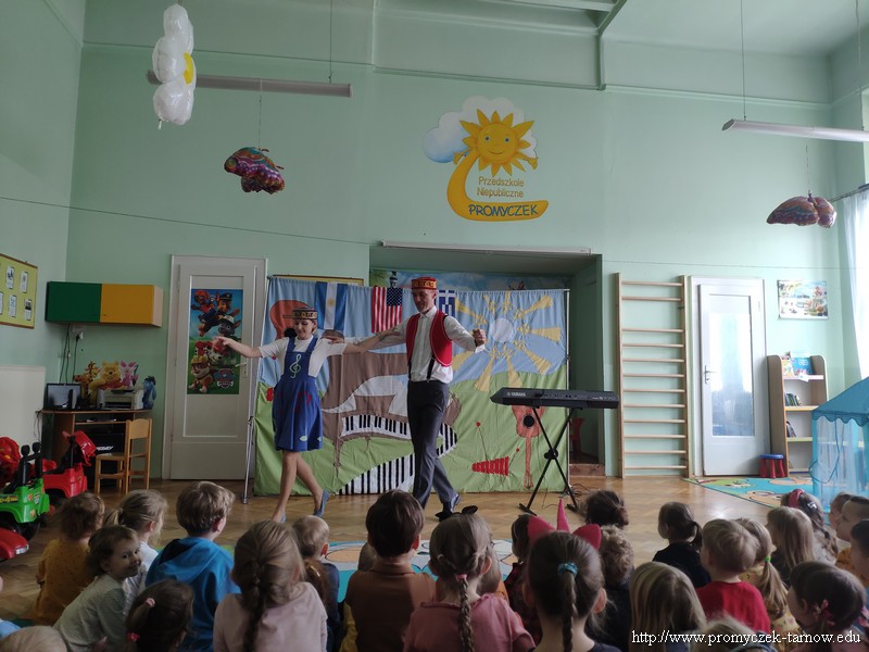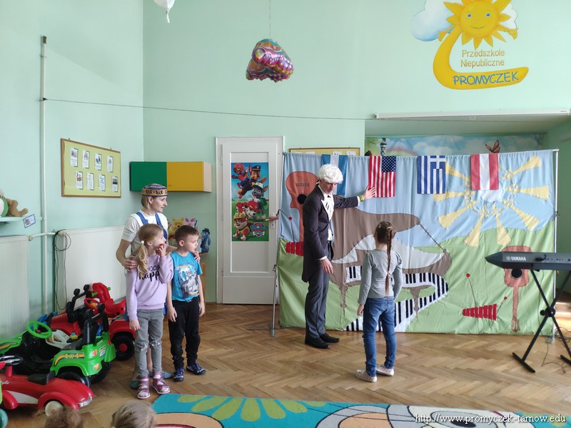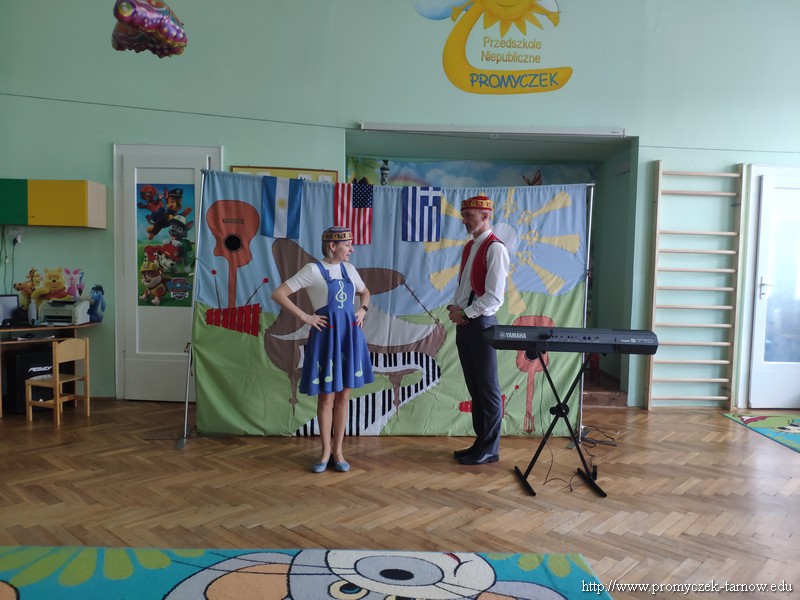 W ubiegłym tygodniu do Promyczka zawitali znani już bardzo dobrze przedszkolakom goście, czyli Wiolinka i Bemol. Tym razem zabrali nas w muzyczną podróż po różnych krajach. Pierwszym krajem jaki odwiedziliśmy była Argentyna - Wiolinka pokazała dzieciom jak się tańczy tango argentyńskie, następnie Bemol nauczył dzieci piosenki "Kaczor Donald farmę miał" i wybrane dzieci udawały różne zwierzęta, oraz grały na instrumencie guiro - pochodzącym z USA. Kolejnym odwiedzonym krajem była Grecja. Dzieci nauczyły się witać w języku greckim oraz pooglądały jak tańczy się zorbe. Ostatnim wybranym krajem była Austria. Wszystkie dzieci na zakończenie zaśpiewały wspólnie piosenkę i pożegnały się z Wiolinką i Bemolem. Czekamy z niecierpliwością na kolejne spotkanie :)