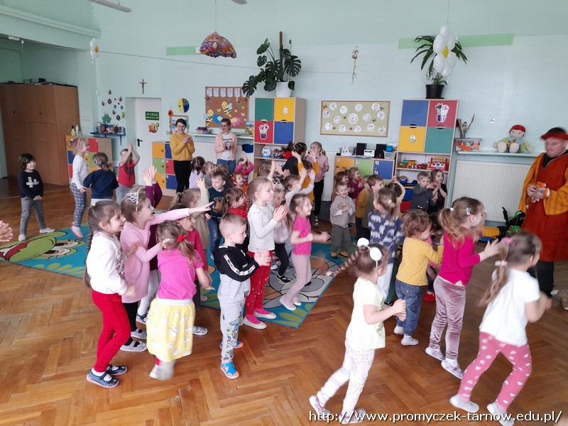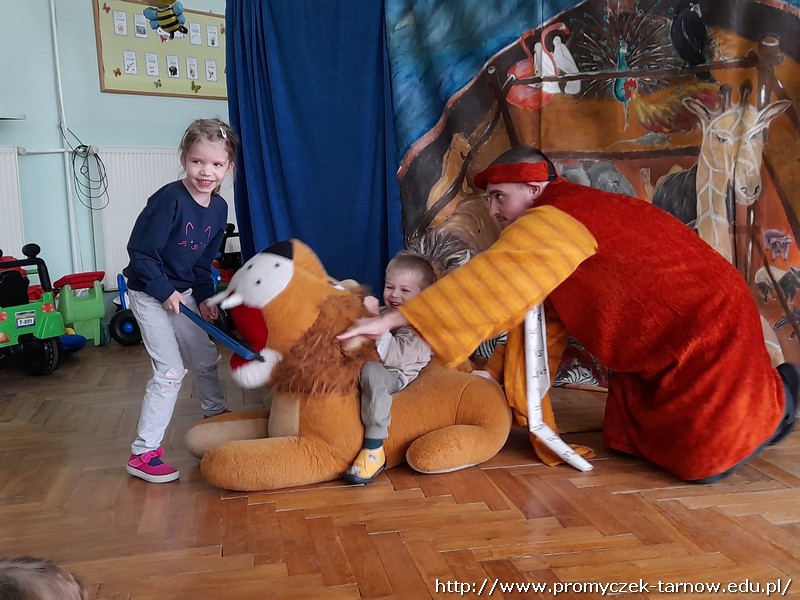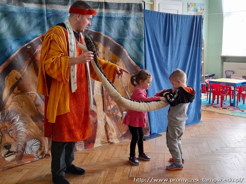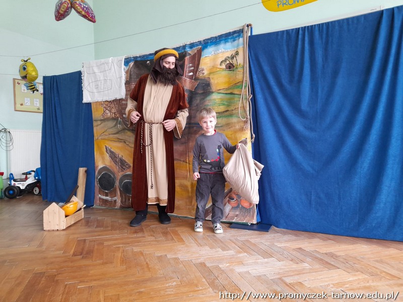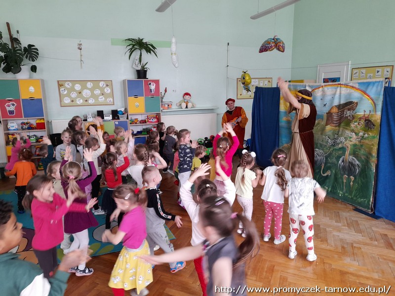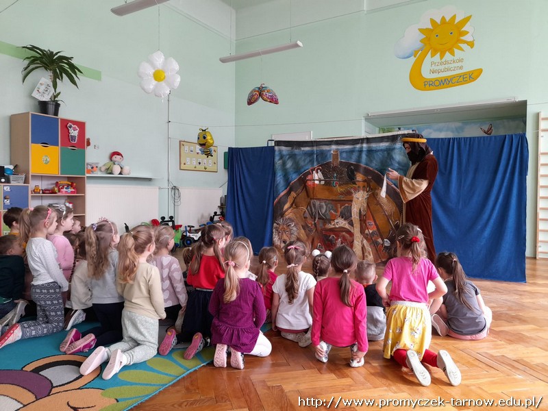 W Wielkim Tygodniu, w czasie kiedy myślimy o tym co dobre a co złe, kiedy zastanawiamy się nad swoim zachowaniem, do przedszkola zawitał Teatr Eden z przedstawieniem, którego głównym celem było pokazanie najmłodszym na czym polegają dobre uczynki oraz nauka szacunku wobec innych. „Arka Noego”, bo taki był tytuł opowieści, przedstawiona została w bardzo humorystycznym stylu, aktorzy w spektakl angażowali także widzów. Promyczki chętnie odpowiadały na zapytania oraz pomagały w rozwiązywaniu kłopotów budowniczego statku, za co zostały obdarowane pochwałami aktorów. Po gromkich brawach wszyscy zgodnie stwierdzili, że nie mogą doczekać się kolejnych spotkań z aktorami Teatru Eden!