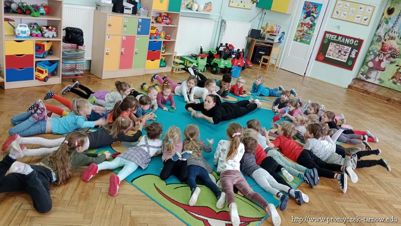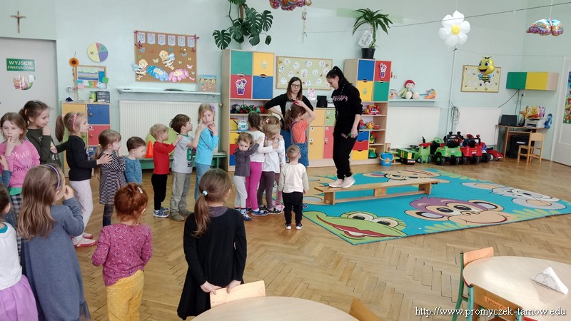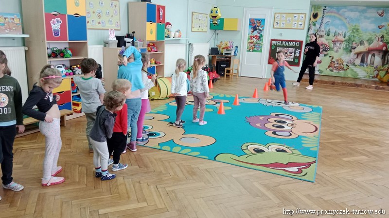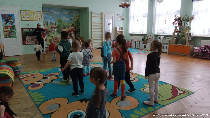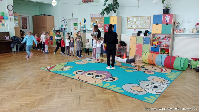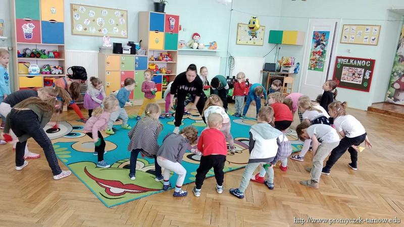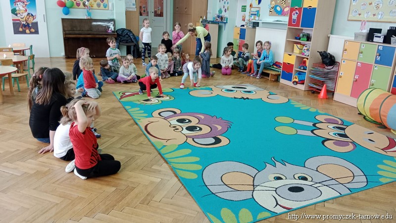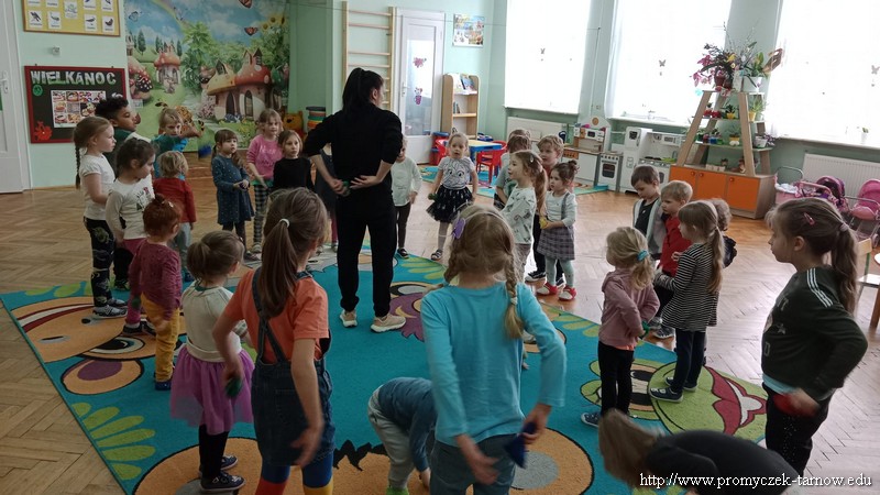 W Wielki Czwartek tuż przed Świętami Wielkanocnymi, po podwieczorku nasze przedszkole powitało gościa, który przeprowadził dla Promyczków zajęcia z lekcji w-fu. Pani Karolina, mama Natalki z grupy Smyki dostosowała ćwiczenia i zabawy pod wszystkie grupy wiekowe. Nie zabrakło rozgrzewki na samym początku, ćwiczeń na ławce oraz zabaw rywalizacyjnych. Dzieci świetnie się bawiły a pani Karolina w cudowny sposób umiliła czas oczekiwania dzieciom na odbiór przez rodziców z przedszkola. Serdecznie dziękujemy za poświęcony czas i miłą atmosferę.