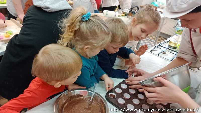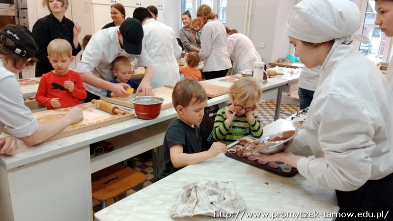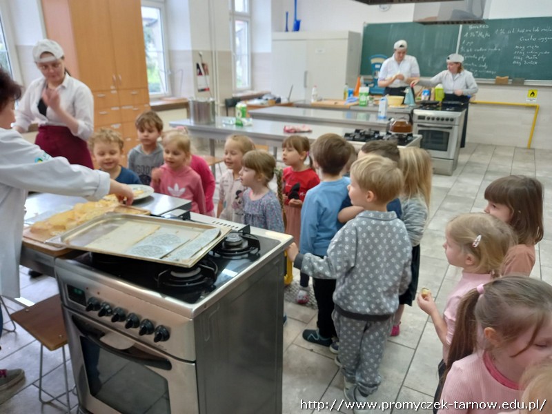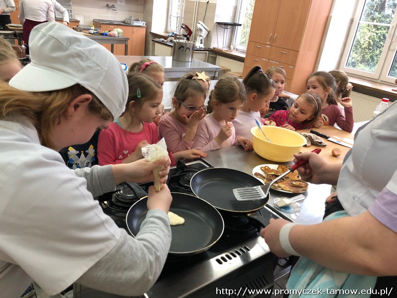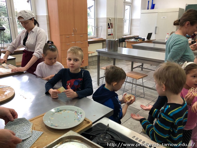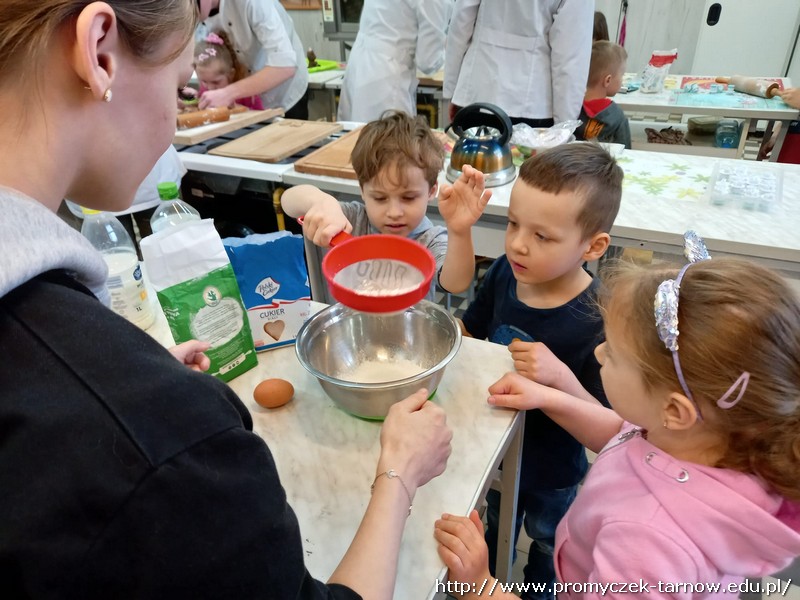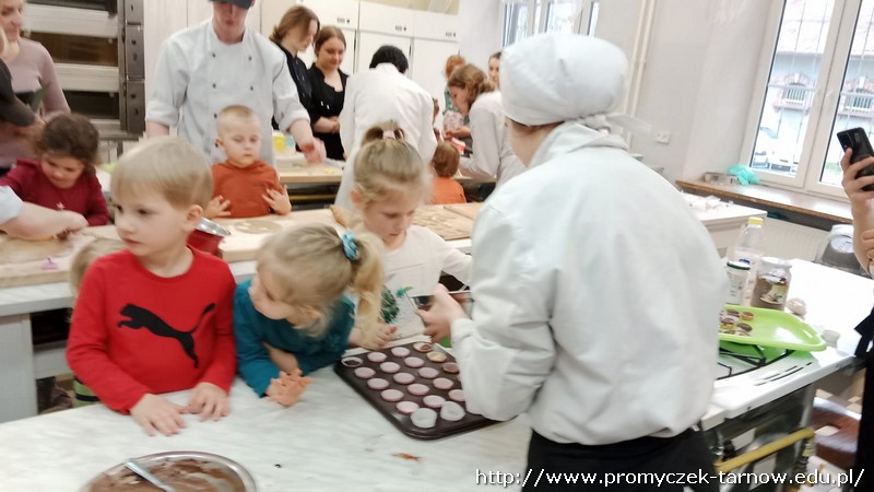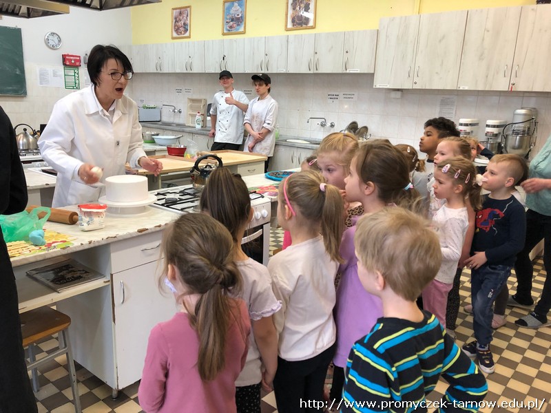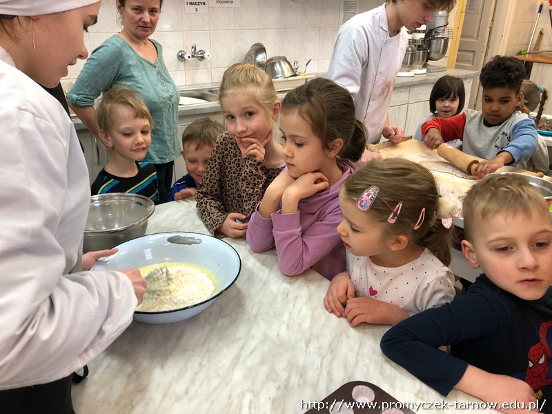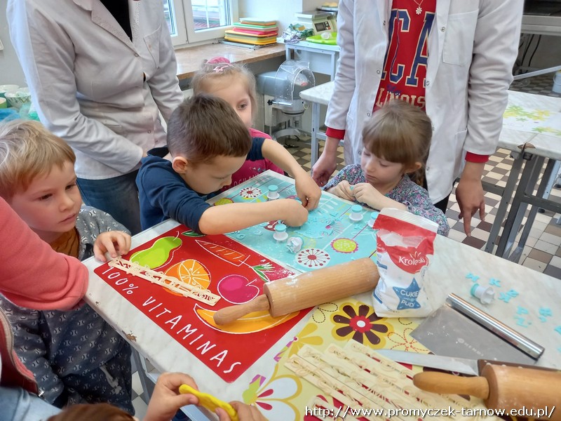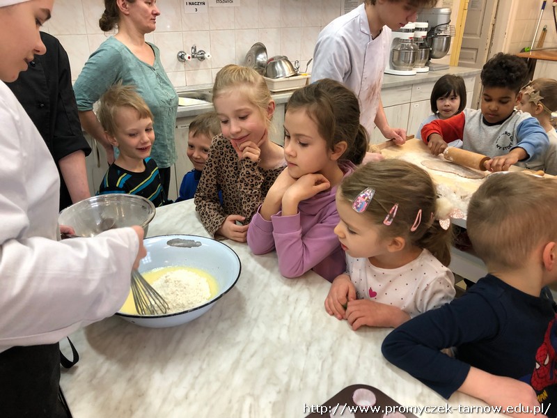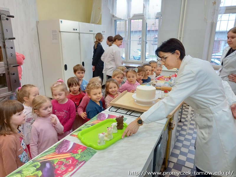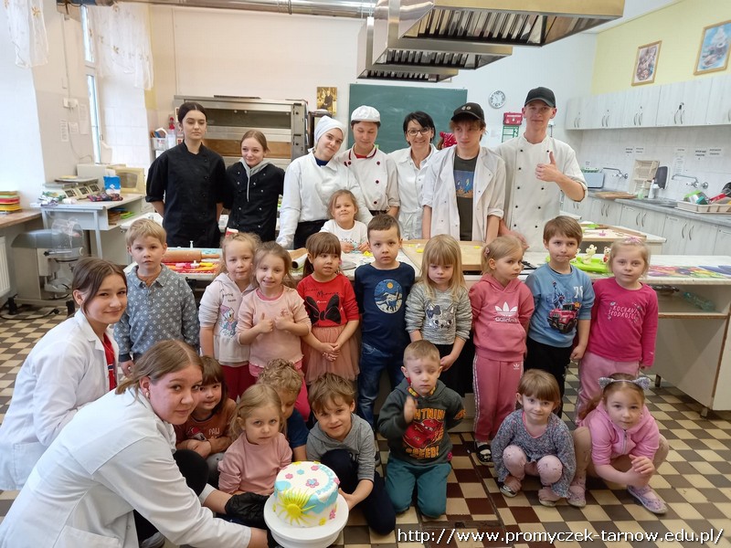 W ubiegłym tygodniu Promyczki udały się do ZSEG na warsztaty cukiernicze pod okiem uczniów i nauczycieli z klasy o profilu cukierniczym. Po przypomnieniu zasad bezpieczeństwa oraz higieny w kuchni smyki, asy i zuchy przystąpiły do działania. W ruch poszł wałki, foremki, ubijaczki, łyżki oraz rękawy uckiernicze. Niektóre dzieci miał okazję po raz pierwszy zobaczyć i posmakować niektórych produktów. Podczas warsztatów powstał robiący duże wrażenie wizualne tort oraz babeczki, naleśniki i cygaretki. Najbardziej przedszkolakom podobał się ostatni punkt wizyty, czyli konsumpcja wyrobów. Promyczki serdecznie dziękują starszym kolegom i koleżankom, a także opiekunom za fachowe słowo porady i opiekę przy kuchennym blacie.