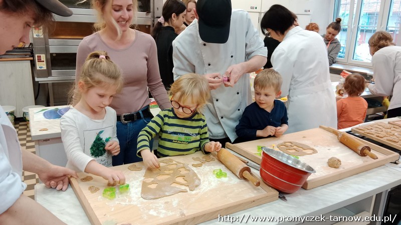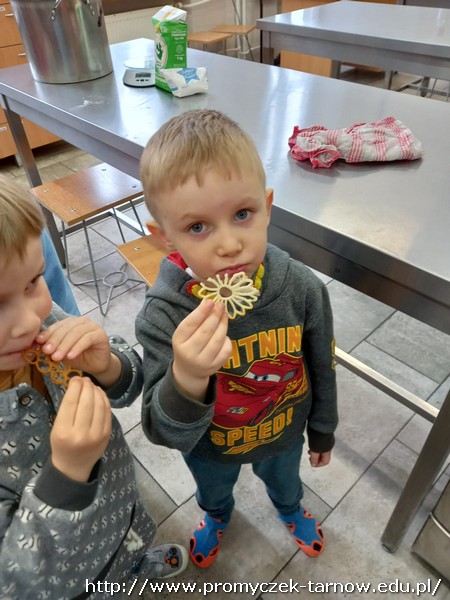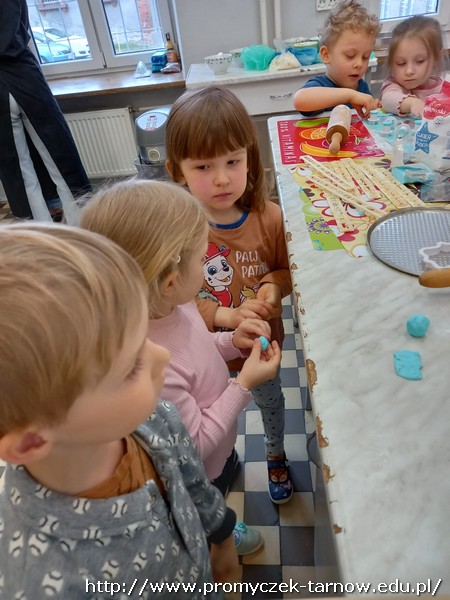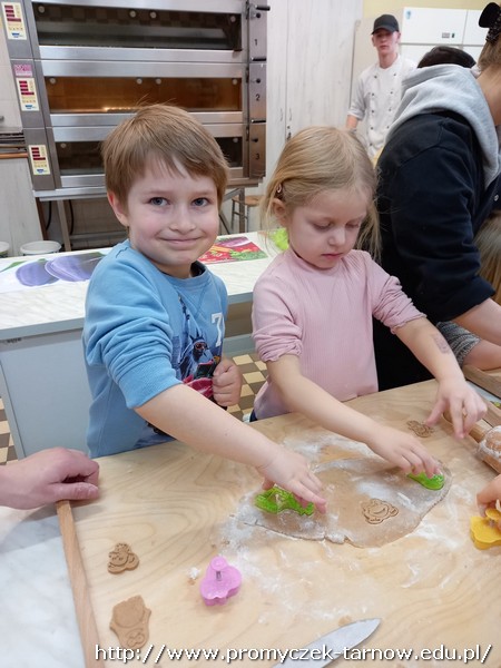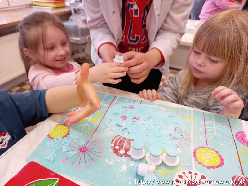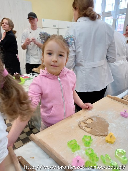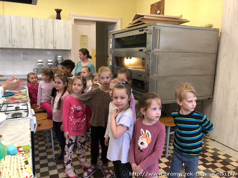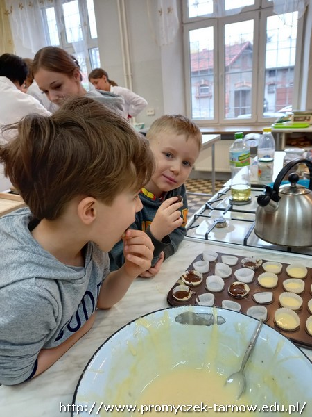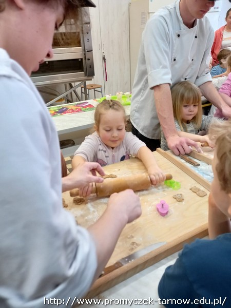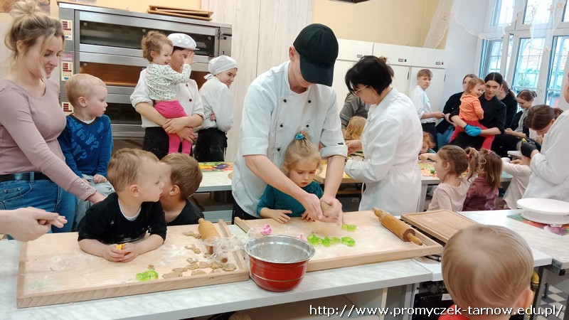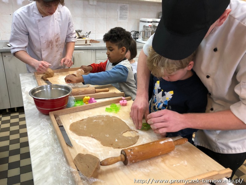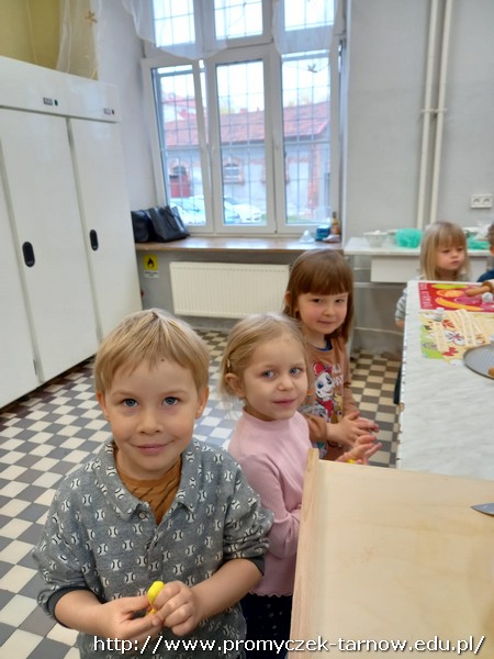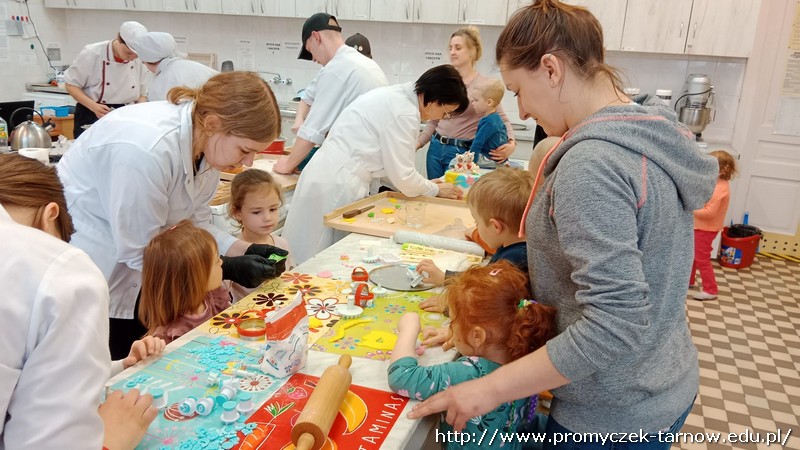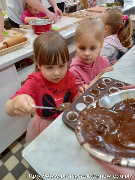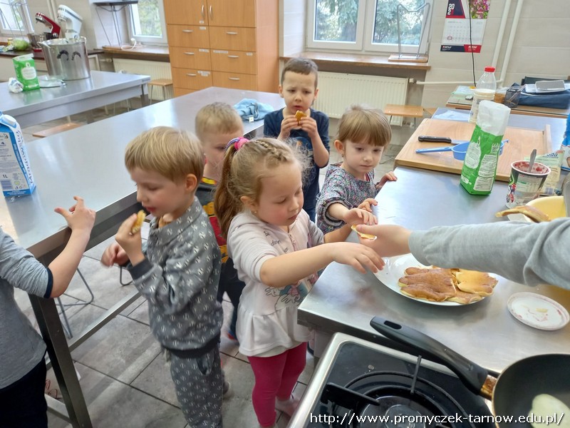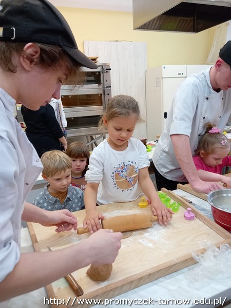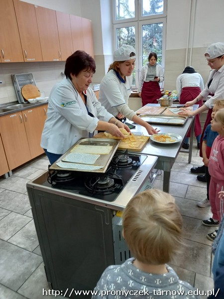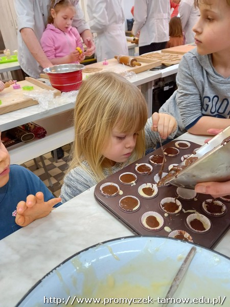 W ubiegłym tygodniu Promyczki udały się do ZSEG na warsztaty cukiernicze pod okiem uczniów i nauczycieli z klasy o profilu cukierniczym. Po przypomnieniu zasad bezpieczeństwa oraz higieny w kuchni smyki, asy i zuchy przystąpiły do działania. W ruch poszł wałki, foremki, ubijaczki, łyżki oraz rękawy uckiernicze. Niektóre dzieci miał okazję po raz pierwszy zobaczyć i posmakować niektórych produktów. Podczas warsztatów powstał robiący duże wrażenie wizualne tort oraz babeczki, naleśniki i cygaretki. Najbardziej przedszkolakom podobał się ostatni punkt wizyty, czyli konsumpcja wyrobów. Promyczki serdecznie dziękują starszym kolegom i koleżankom, a także opiekunom za fachowe słowo porady i opiekę przy kuchennym blacie.
