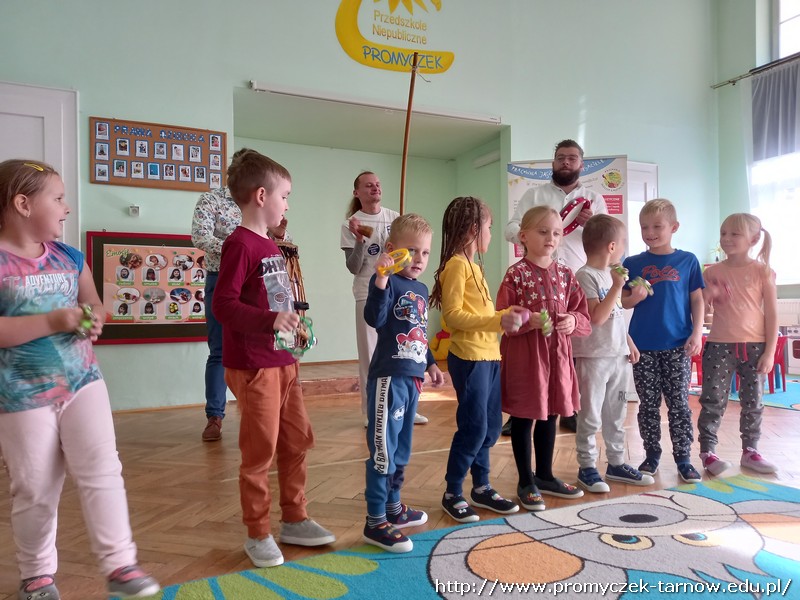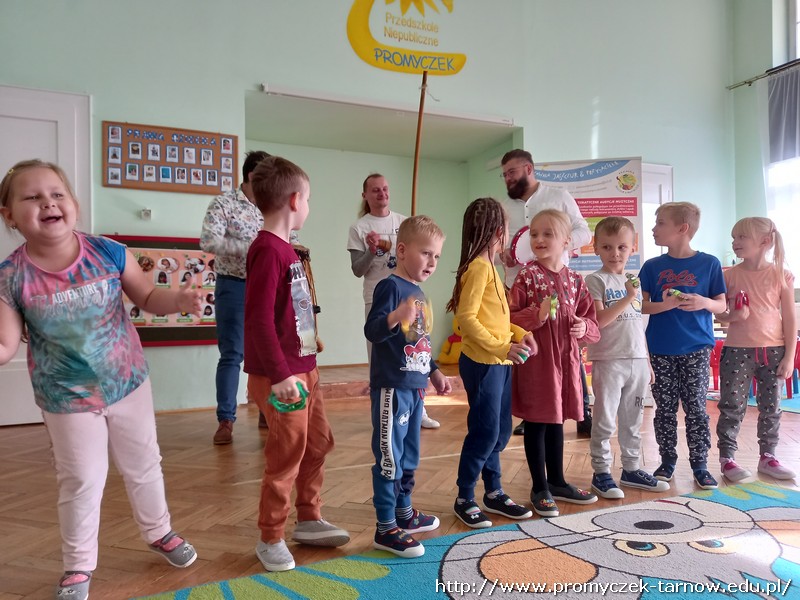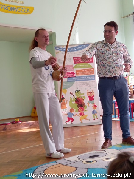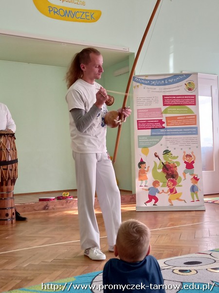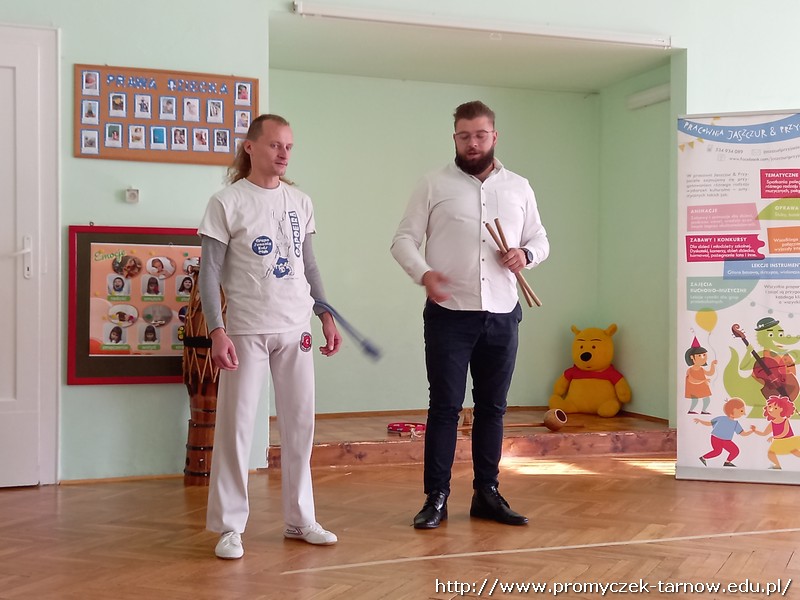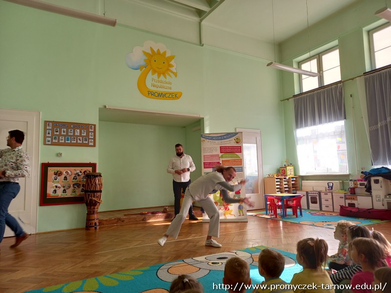 We wtorkowe przedpołudnie do naszego przedszkola zawitali panowie z pracowni Jaszczur i przyjaciele. Tym razem pojawił się również wyjątkowy gość - pan Dawid, który zaprezentował dzieciom brazylijski taniec wojowników Capoeira. Dzieci miały okazję dowiedzieć się o genezie tańca, poznały brazylijskie nazwy instrumentów oraz nauczyły się prostej przyśpiewki. Wszystkim bardzo podobał się występ, uśmiechom nie było końca.
