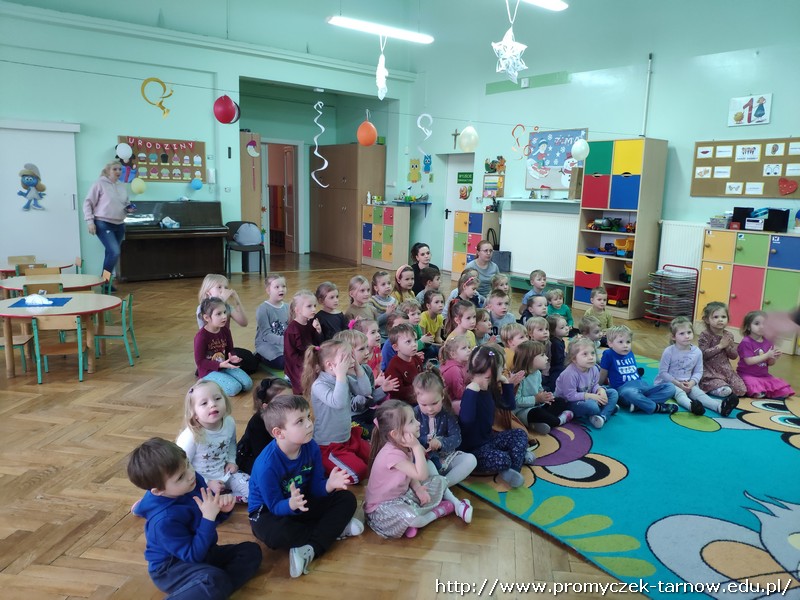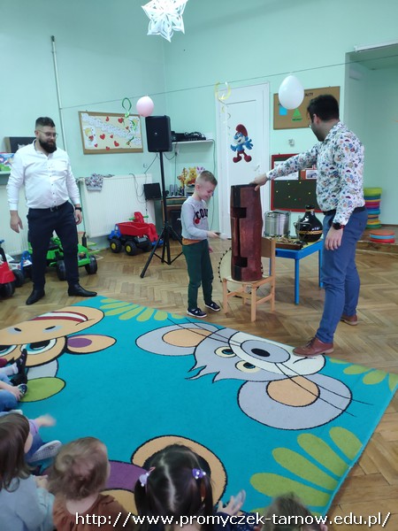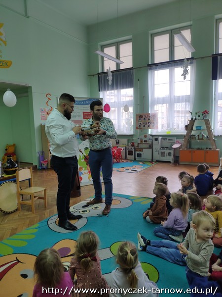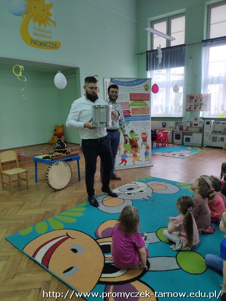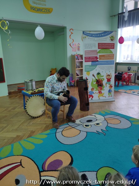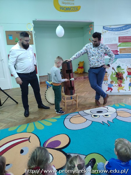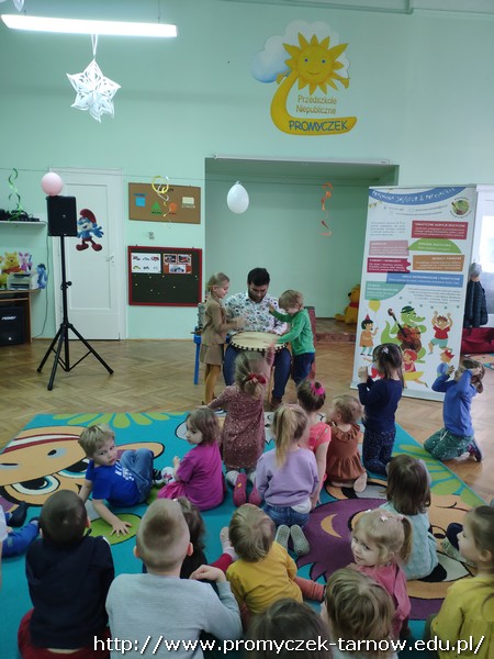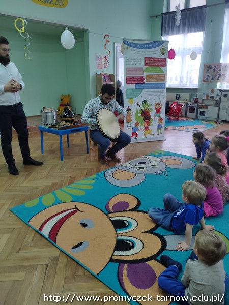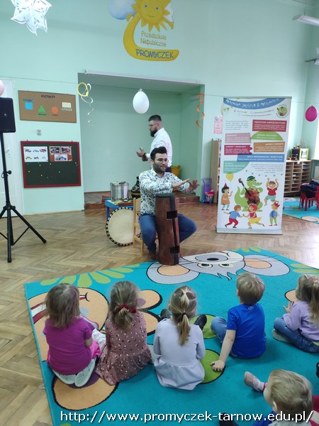 W piątek 25 lutego odwiedziła nas ponownie Pracownia Jaszczur i Przyjaciele z programem Afryka dla małego smyka. Przywitali się oni piosenką o ptaszkach odlatujących na zimę. Następnie nasze przedszkolaki zapoznały się z wieloma instrumentami muzycznymi pochodzącymi z różnych krajów Afryki, były to m.in.: bęben szczelinowy, udu z Indii, Sprężyna, wodny ( płynny) trójkąt, kastaniety wykorzystywane przy tańcu flamenco, flet z Peru (sowa), strumyk wykonany z łupinek orzechów brazylijskich, bęben obręczowy, czurynga oraz diabeł brazylijski. Panowie przybliżyli promyczkom pochodzenie każdego z nich, a także pokazali w jaki sposób można wydobyć dźwięk z poszczególnych instrumentów. Kilka przedszkolaków zagrało nawet samodzielnie. Czekamy z niecierpliwością na kolejne spotkanie.