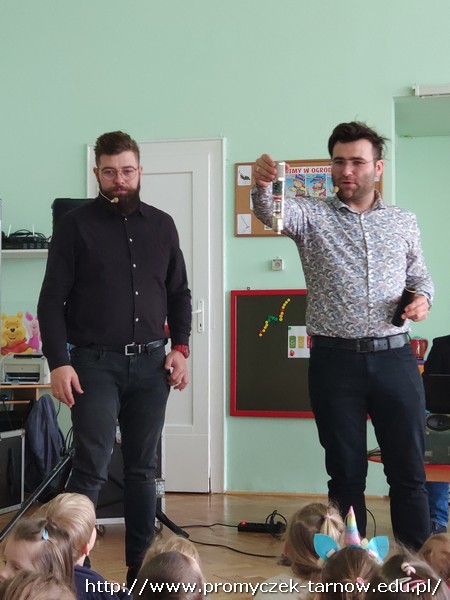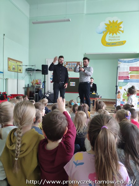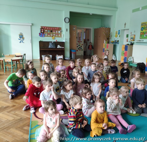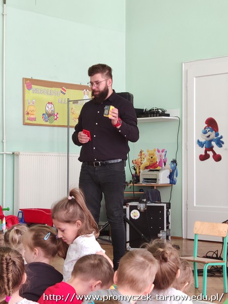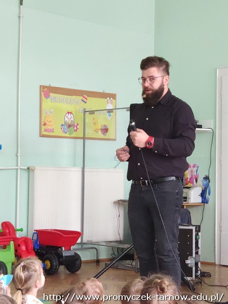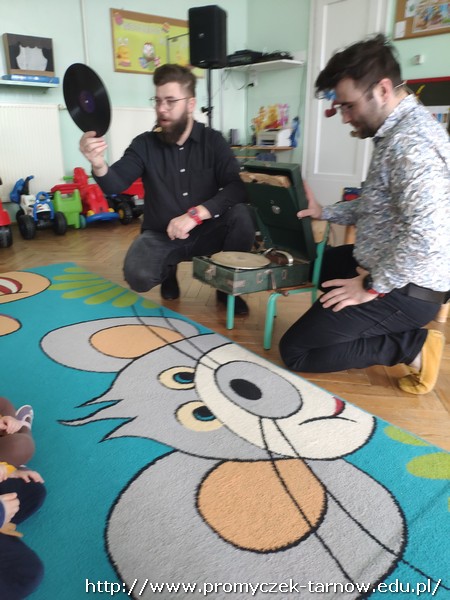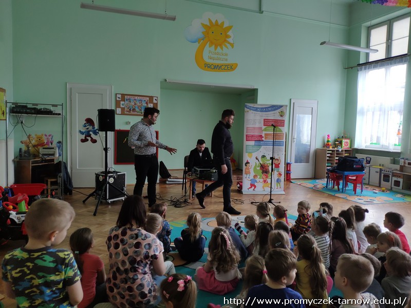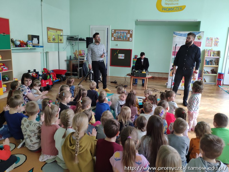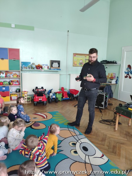 W piątek 8 kwietnia do naszych Promyczków ponownie zagościła grupa Jaszczur i Przyjaciele. Tym razem przedszkolaki dowiedziały się czegoś więcej o studiu nagraniowym. Na początku Panowie zapoznali dzieci z różnymi starymi nośnikami muzyki, pokazali im najstarszą płytę CD, gramofon, walkman oraz różne rodzaje mikrofonów. Później pan Paweł powiedział parę słów do mikrofonu, a Pan Radek odtworzył to nagranie podkładając głos smerfa, wiewiórki, a także odtworzył głos od tyłu – co było najśmieszniejsze dla naszych Promyczków. Na sam koniec Grupa Jaszczur i Przyjaciele nagrali krótki utwór, w którym dzieci też miały swój udział. Wszystkie przedszkolaki były bardzo zadowolone i z niecierpliwością czekają na kolejne spotkanie.