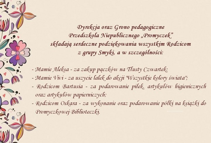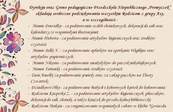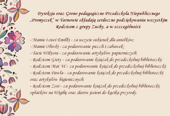Wszystkim tym, którzy włączyli się w życie Promyczka składamy serdeczne podziękowania. Cieszymy się, że są Państwo skłonni do pomocy i otwarci na potrzeby naszej placówki. Liczymy, że współpraca w kolejnych latach będzie równie owocna :)