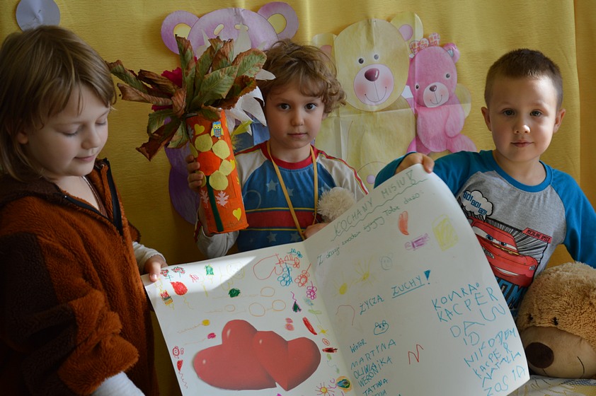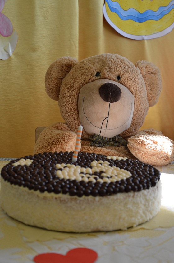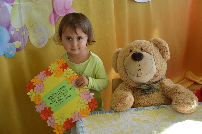 Pani Kinga rozpoczęła uroczystość wierszem pt. "Naprawimy misia" a następnie Promyczki brały udział w kilku zadaniach. Każda z grup przygotowała dla Solenizanta piękne prezenty, a na koniec czekał na nas pyszny urodzinowy tort. Wszyscy bawiliśmy się świetnie. ,
