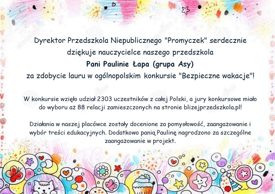 Chwalimy się, bo jest czym! :) Nasze przedszkole i jedna z naszych nauczycielek pani Paulina Łapa zostali laureatami ogólnopolskiego konkursu "Bezpieczne wakacje". Więcej informacji dostępnych na stronie: