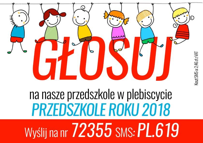 Kochani! Nasze Przedszkole zostało zgłoszone do plebiscytu "Przedszkole Roku"! Serdecznie dziękujemy za okazane zaufanie i prosimy o głosy. Wystarczy wysłać sms-a (koszt 2,46 zł z VAT) pod wskazany w grafice adres. Przy okazji zachęcamy także do głosowania na nasze wspaniałe nauczycielki panią Patrycję, panią Agnieszkę oraz panią Paulinę w plebiscycie "Nauczycielka Przedszkola roku 2018".