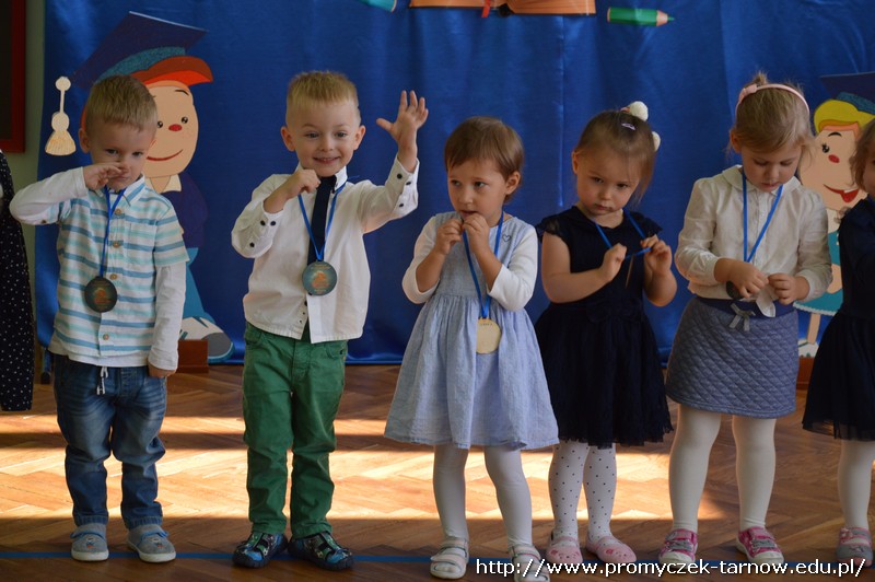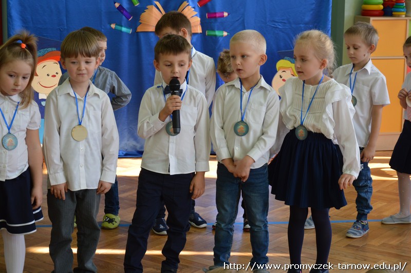 Jako pierwsze zaprezentowały się smyki. Zaśpiewały najpiękniej jak umiały piosenkę w języku angielskim „Baby shark”. Wyrecytowały wiersz a na końcu czekały na nich zadania przygotowane przez panią Agnieszkę z grupy Zuchy. Nasze „Asy” powiedziały wierszyki, zaśpiewały piosenkę a na koniec zatańczyły taniec. Zuchy- nasza najstarsza grupa również cos powiedziały,zaśpiewały i zatańczył taniec Belgijski. Po zakończonej uroczystości na wszystkie dzieci czekał słodki poczęstunek w sali.