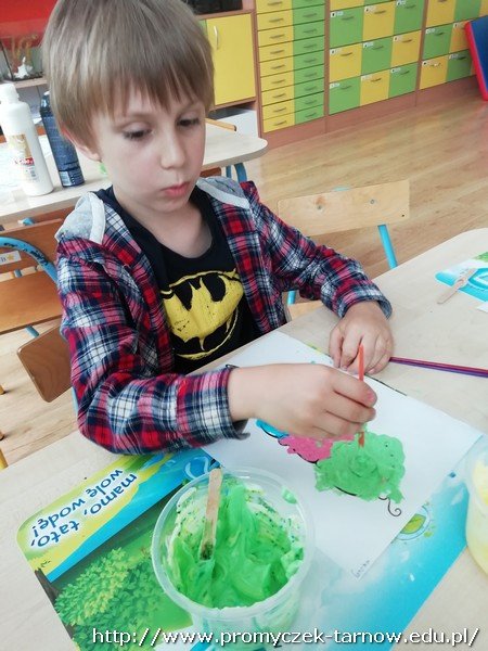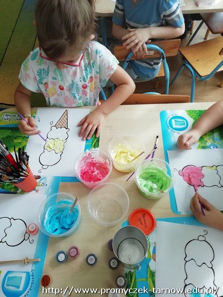 Co można zrobić z pianki do golenia, kleju i barwników? - OBRAZEK LODOWY :D A dokładnie, można zrobić "puchate" farby, którymi malujemy co tylko chcemy. Zuchy oczywiście wybrały lody, bo kto nie ma na nie ochoty, zwłaszcza gdy czuć już w powietrzu zbliżające się lato. I choć nie dało się ich zjeść, to zabawy było sporo, a obrazki wyszły naprawdę "smakowicie".