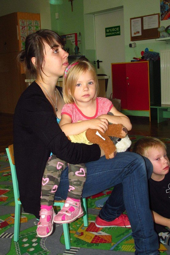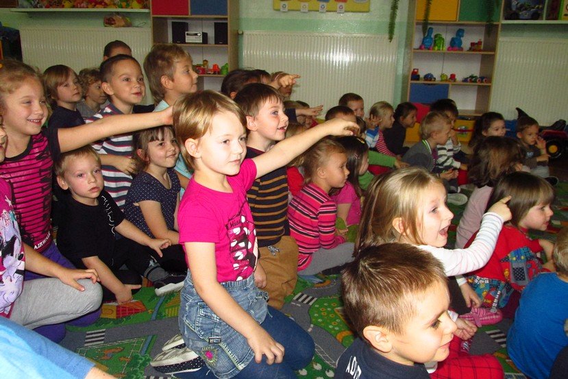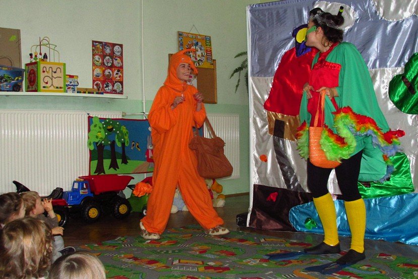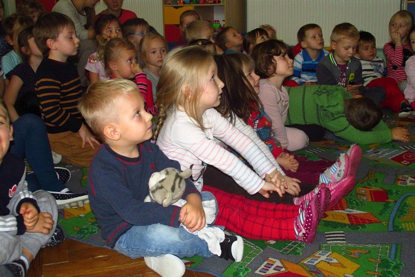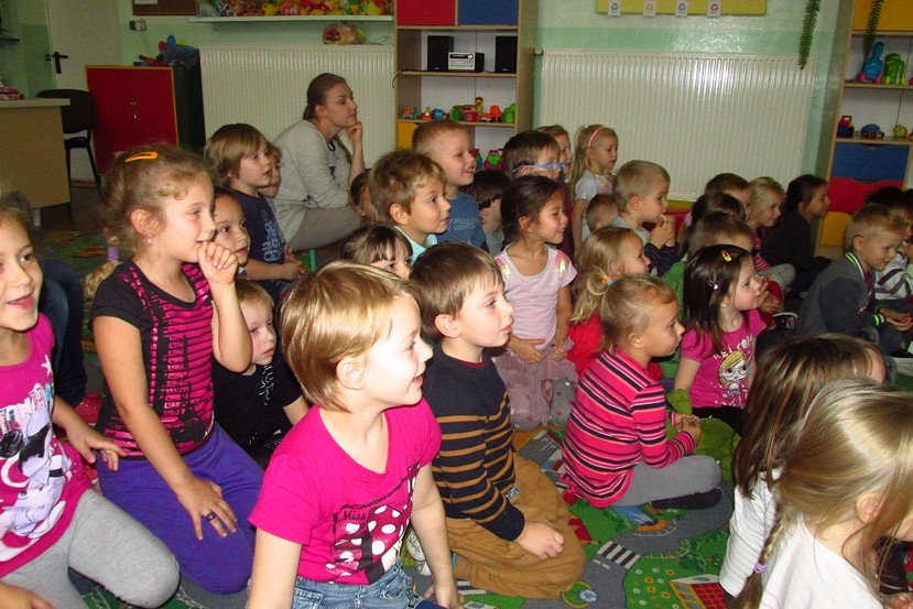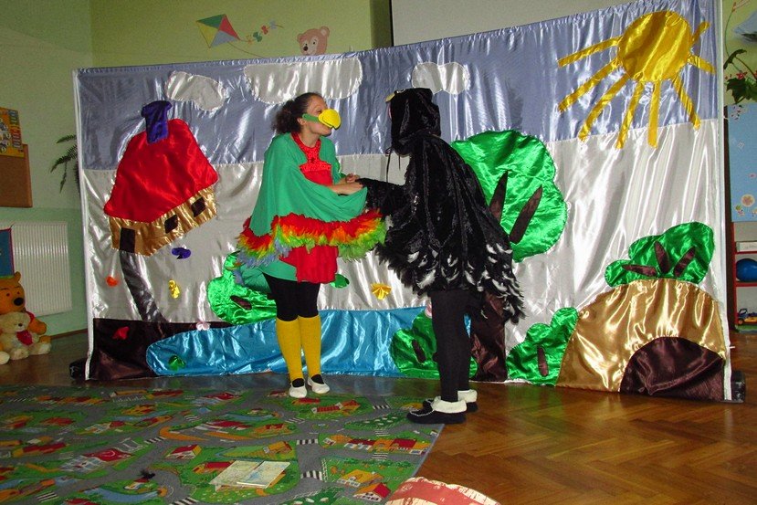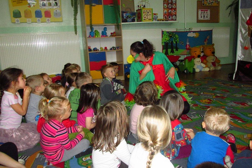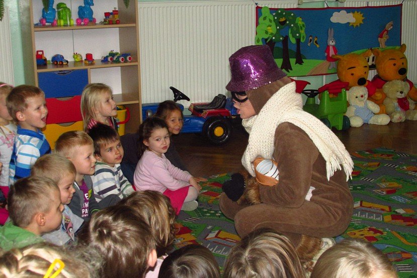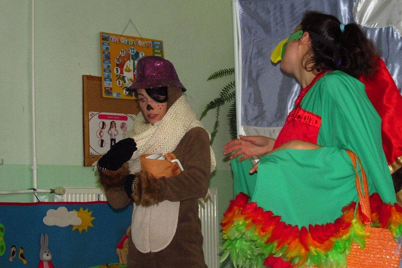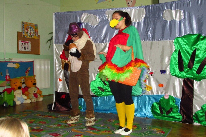 Dzieci miały okazję poznać Papużkę Okruszkę, Misia Zdzisia i Wiewiórkę Zosię. Mili goście opowiedzieli o zmianach, jakie niesie ze sobą aktualna pora roku, zadawali naszym Promyczkom zagadki, śpiewali piosenki.