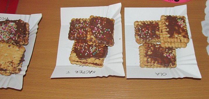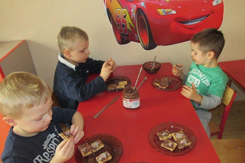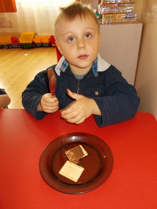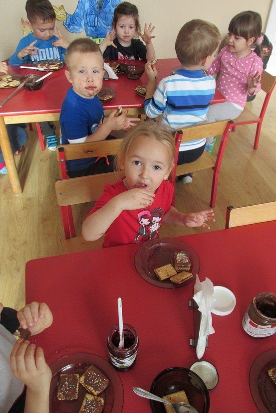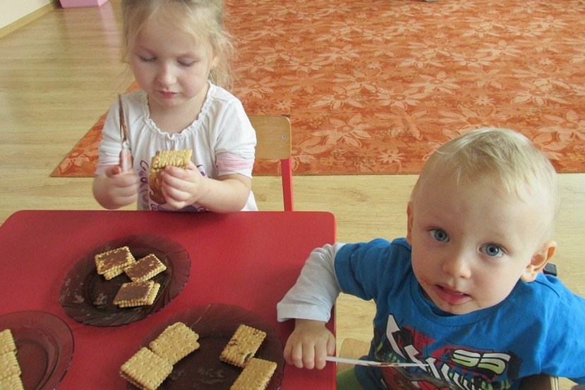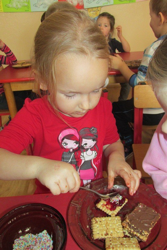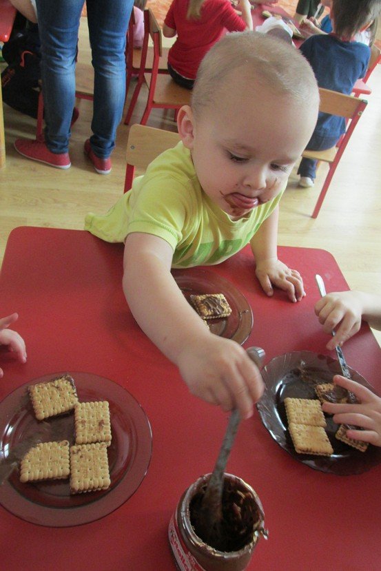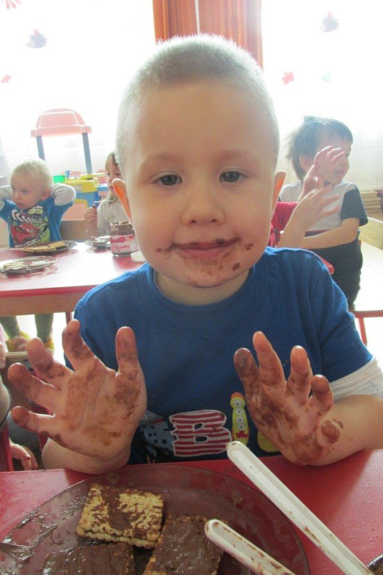 We środę 29 listopada 2014 Smyki i Asy połączyły siły i zabrały się za przygotowywanie wspaniałych ciasteczek z nutellą i kolorową posypką. Śmiechu było wiele, bo okazało się, że więcej pysznego kremu ląduje w buzi niż na ciasteczkach, o czym świadczyły czekoladowe uśmiechy naszych przedszkolaków. Zresztą nutella ozdobiła nie tylko buzie, ale również stoliki i koszulki. Wydaje się nam, że dziś wieczorem w każdym domu było wielkie pranie ciuszków i długie opowiadanie o interesującym dniu.