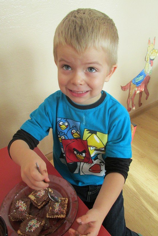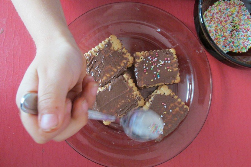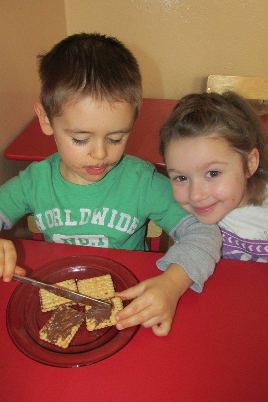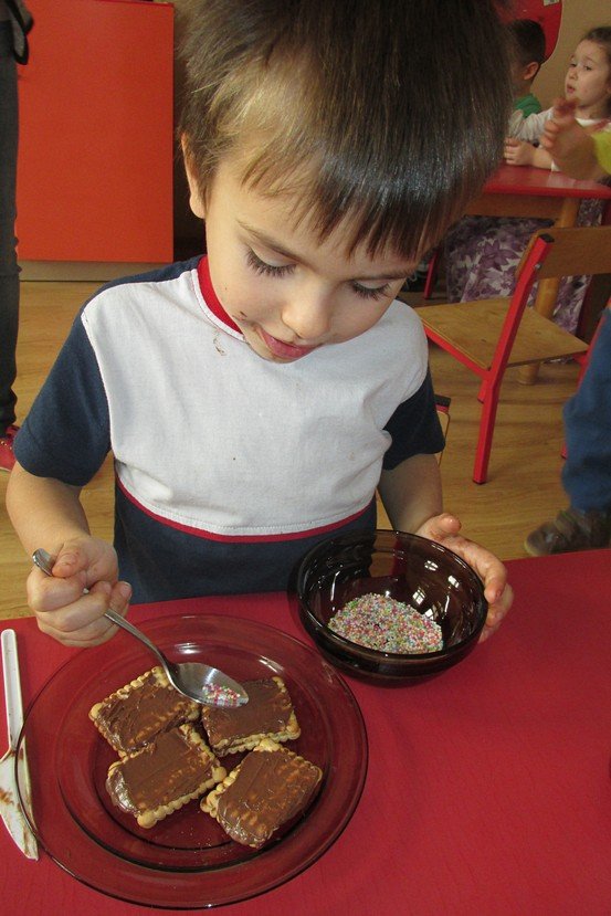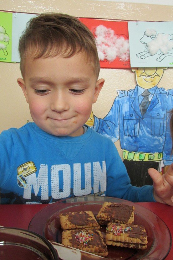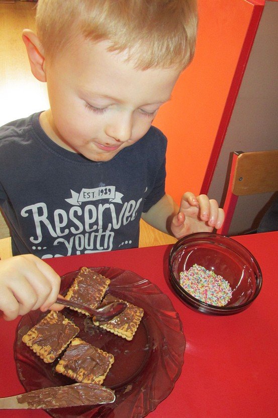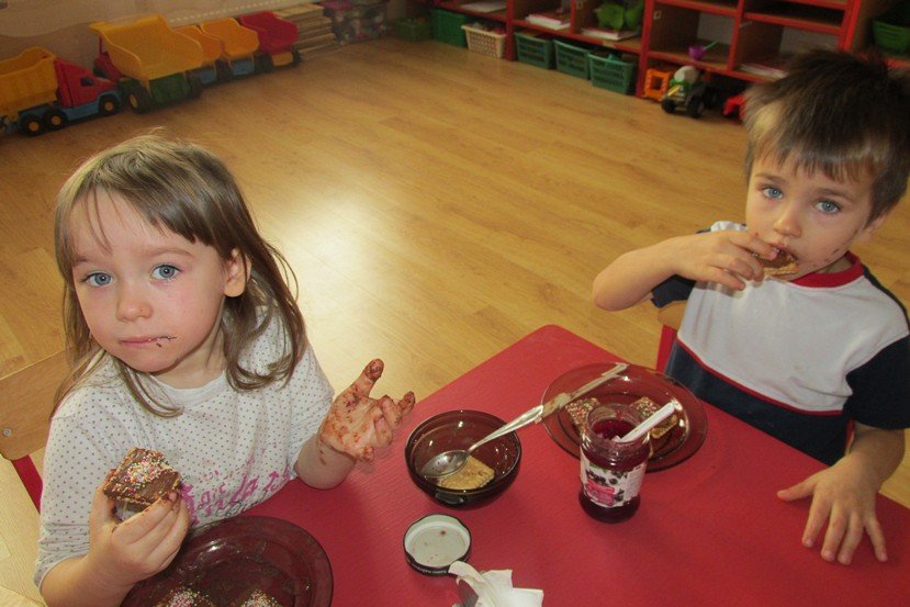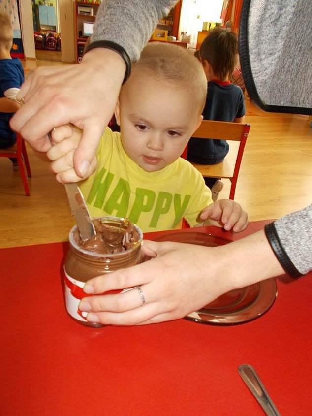 We środę 29 listopada 2014 Smyki i Asy połączyły siły i zabrały się za przygotowywanie wspaniałych ciasteczek z nutellą i kolorową posypką. Śmiechu było wiele, bo okazało się, że więcej pysznego kremu ląduje w buzi niż na ciasteczkach, o czym świadczyły czekoladowe uśmiechy naszych przedszkolaków. Zresztą nutella ozdobiła nie tylko buzie, ale również stoliki i koszulki. Wydaje się nam, że dziś wieczorem w każdym domu było wielkie pranie ciuszków i długie opowiadanie o interesującym dniu.