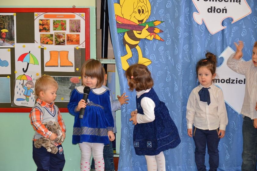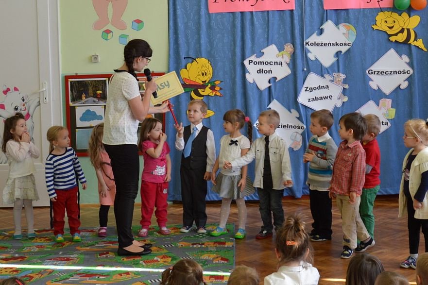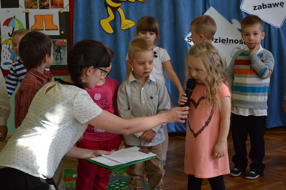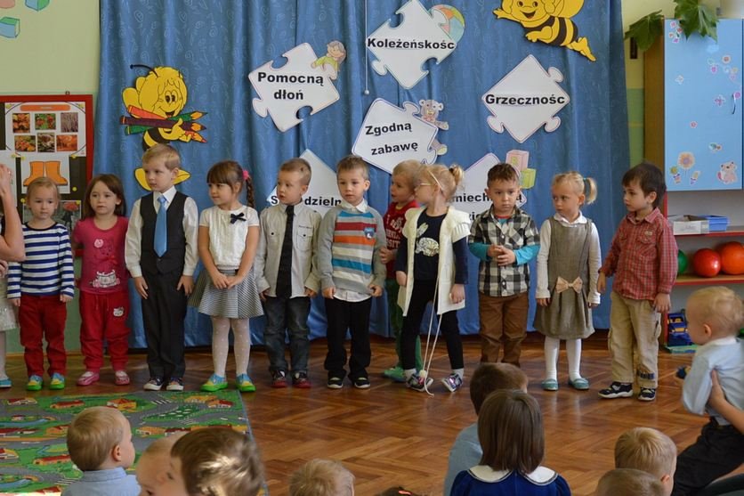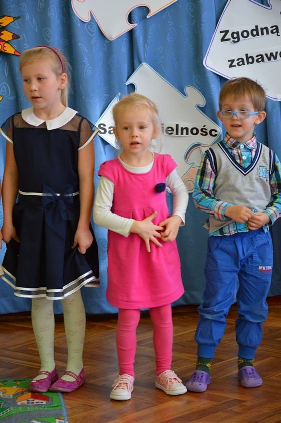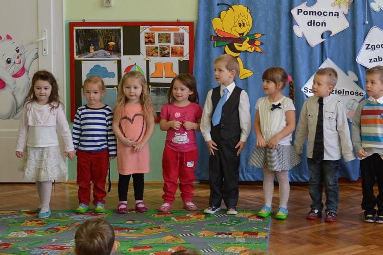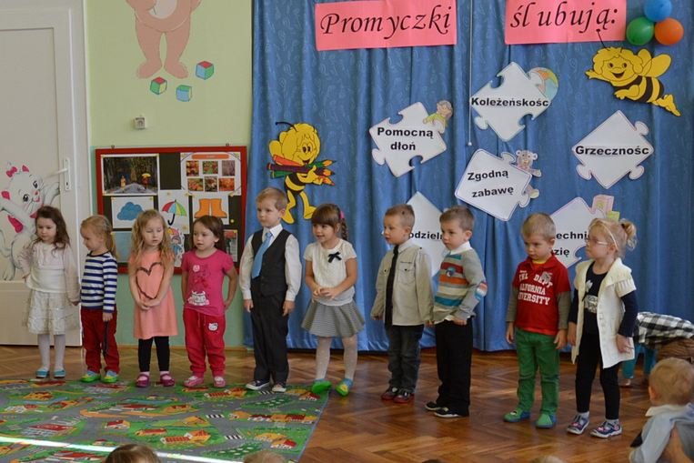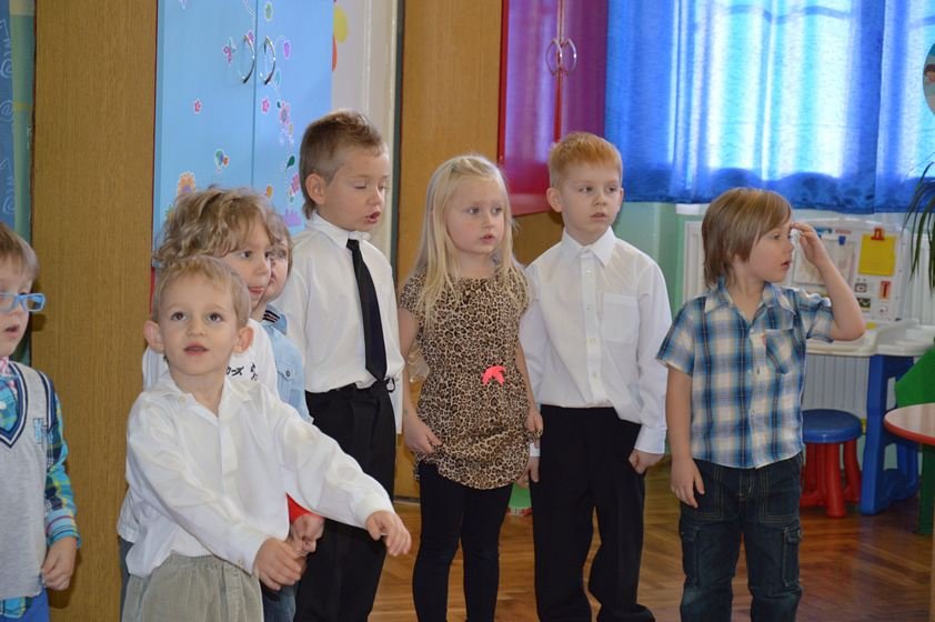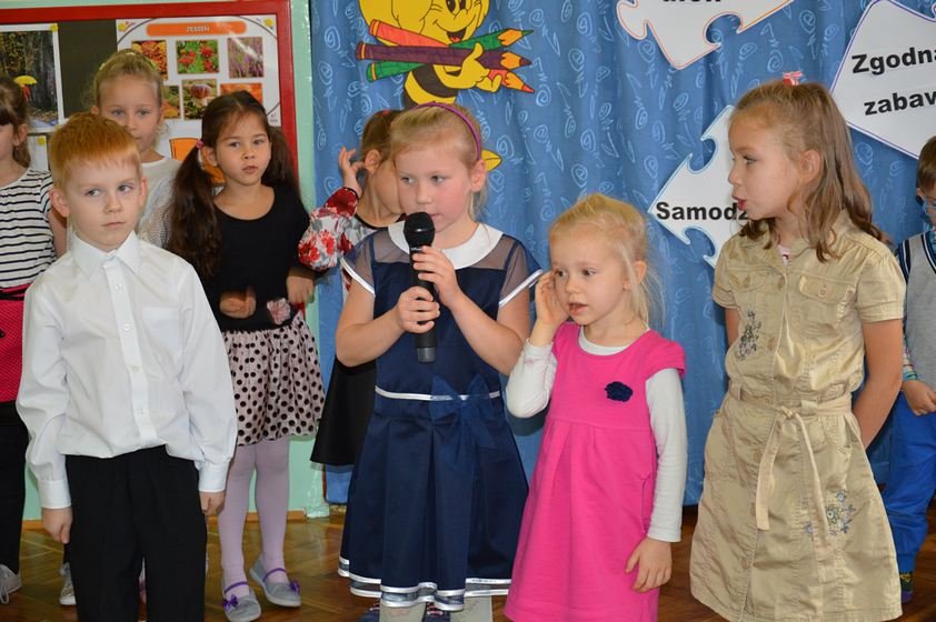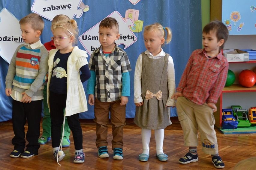 Uroczystość miała miejsce 5 listopada 2014 roku. Dzieci w odświętnych strojach zebrały się w sali Smyków. Po krótkim powitaniu przez panią dyrektor nadszedł czas na część artystyczną. Jako pierwsze na scenie pojawiły się najmłodsze dzieci. Brawurowo wykonały piosenkę połączoną z ilustracją ruchową. Jako drugie występowały nasze średniaki, które popisały się pięknym śpiewem i recytacją. Starszaki, chociaż ich występ był ostatni – zaprezentowały się pierwszorzędnie.