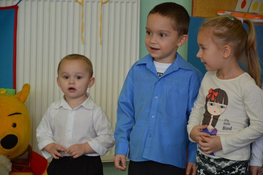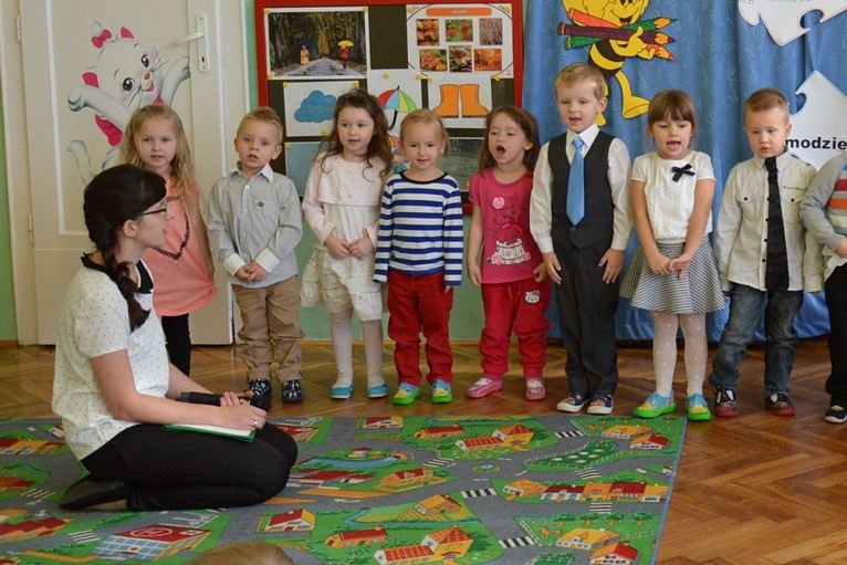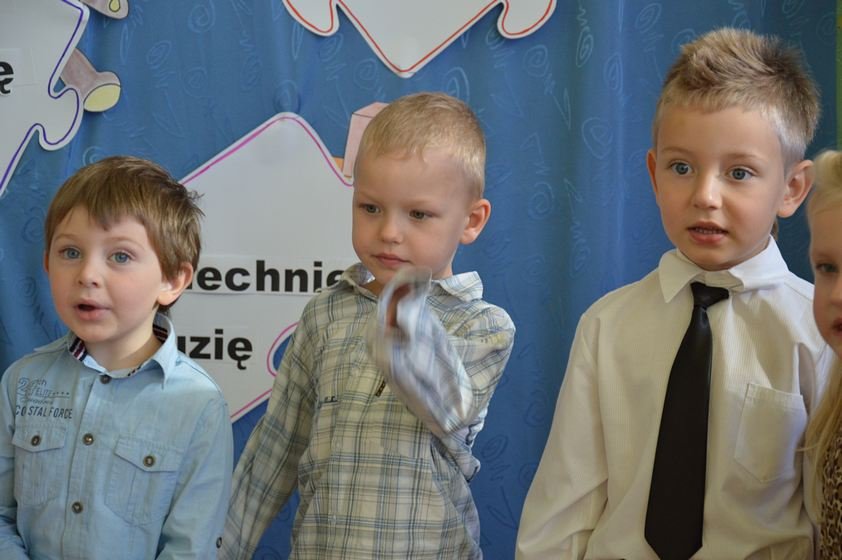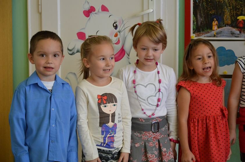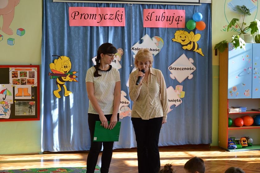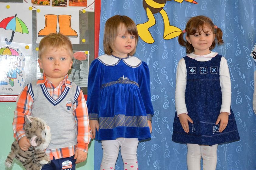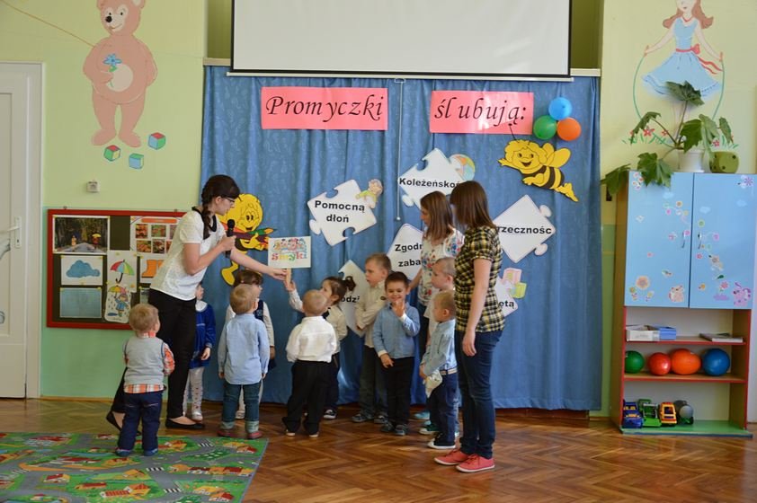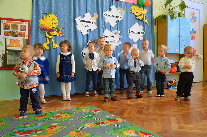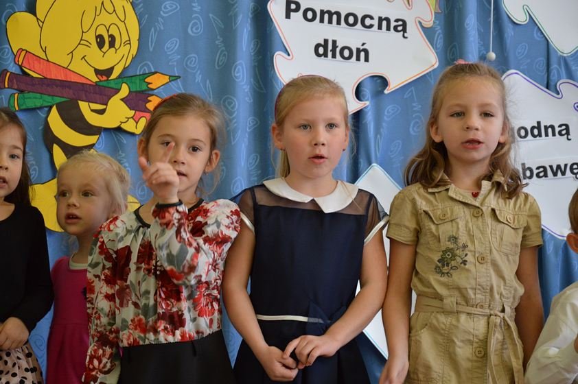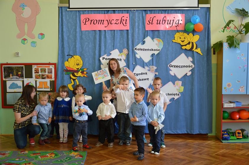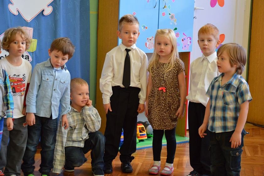 Uroczystość miała miejsce 5 listopada 2014 roku. Dzieci w odświętnych strojach zebrały się w sali Smyków. Po krótkim powitaniu przez panią dyrektor nadszedł czas na część artystyczną. Jako pierwsze na scenie pojawiły się najmłodsze dzieci. Brawurowo wykonały piosenkę połączoną z ilustracją ruchową. Jako drugie występowały nasze średniaki, które popisały się pięknym śpiewem i recytacją. Starszaki, chociaż ich występ był ostatni – zaprezentowały się pierwszorzędnie.