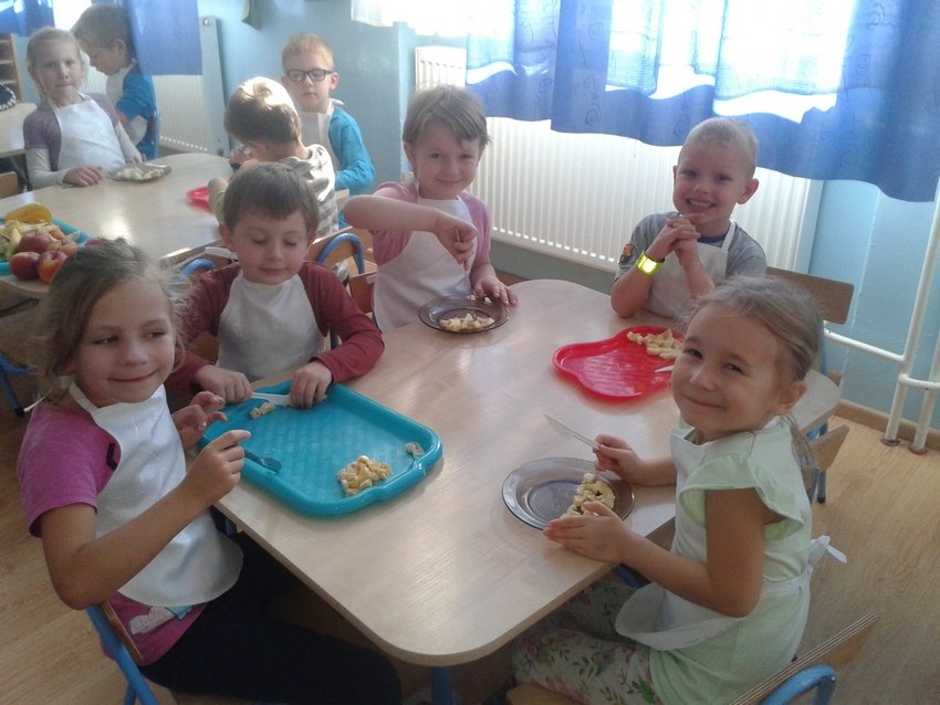 Samodzielnie pokroiliśmy umyte wcześniej owoce, przestrzegając zasad bezpieczeństwa przy posługiwaniu się nożem. Następnie nabiliśmy małe kosteczki na wykałaczki, a te z kolei umieściliśmy na połówkach jabłek, co wyglądało bardzo apetycznie. To było bardzo pyszne drugie śniadanie!