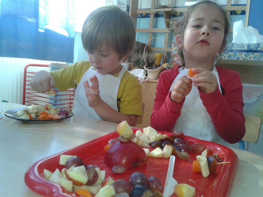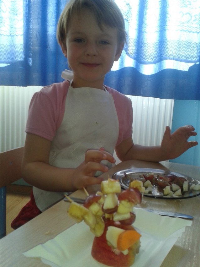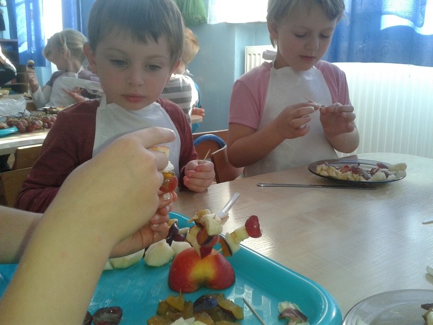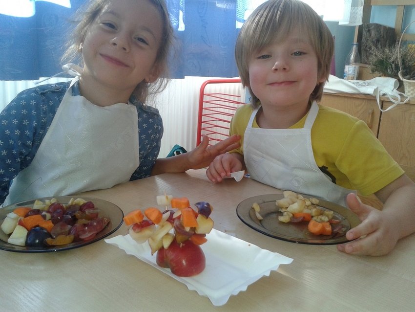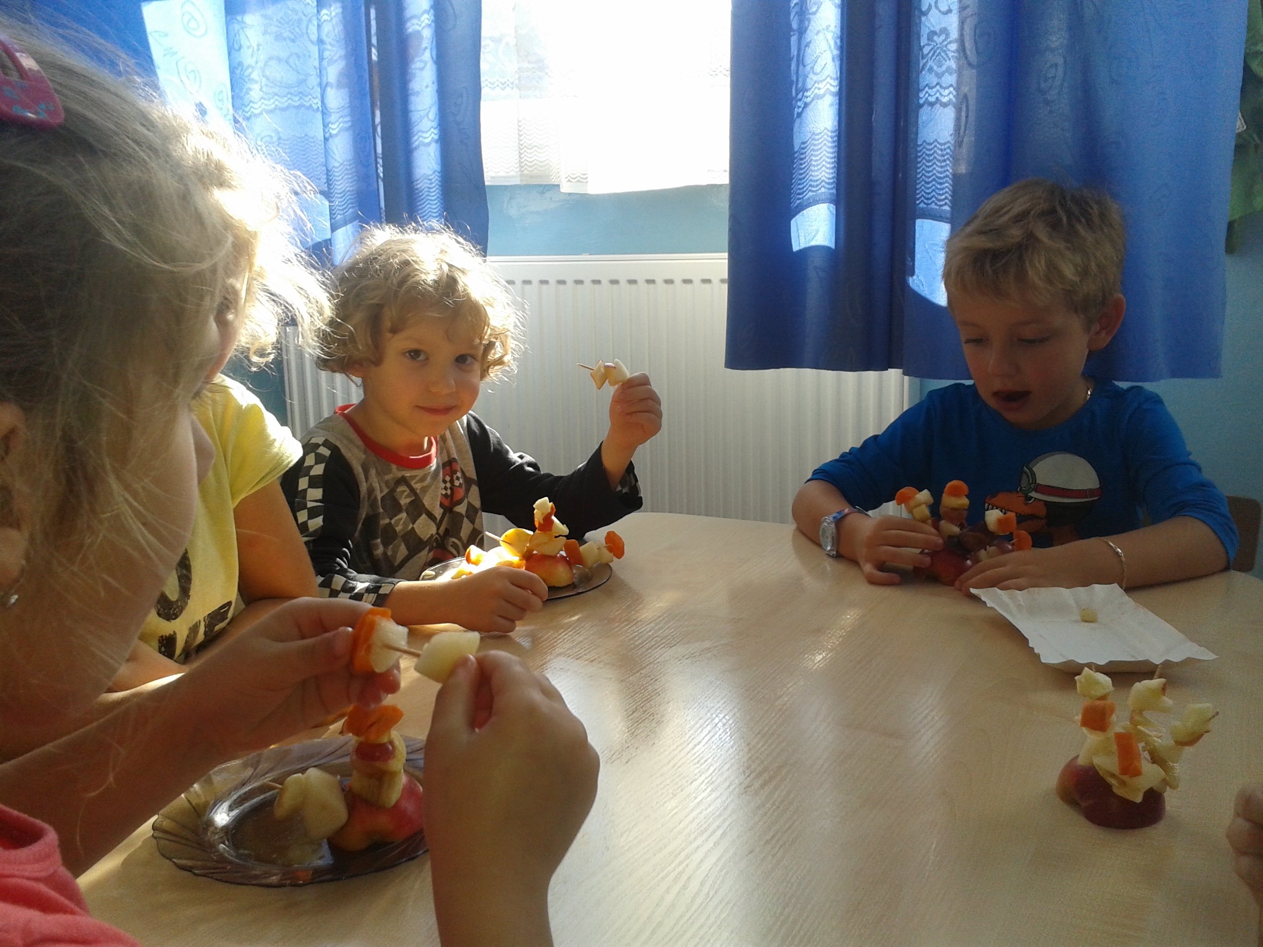 My, Zuchy wiemy, że owoce i warzywa mają dużo witamin i są bardzo zdrowe, dlatego postanowiliśmy wraz z Panią Kingą przygotować witaminowe koreczki z jabłek, gruszek, winogron, marchewek, śliwek oraz bananów.