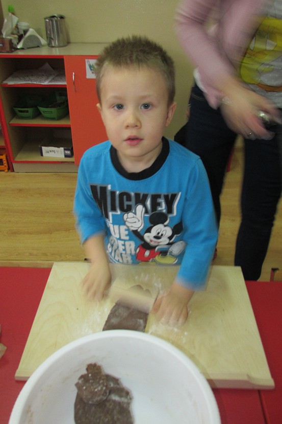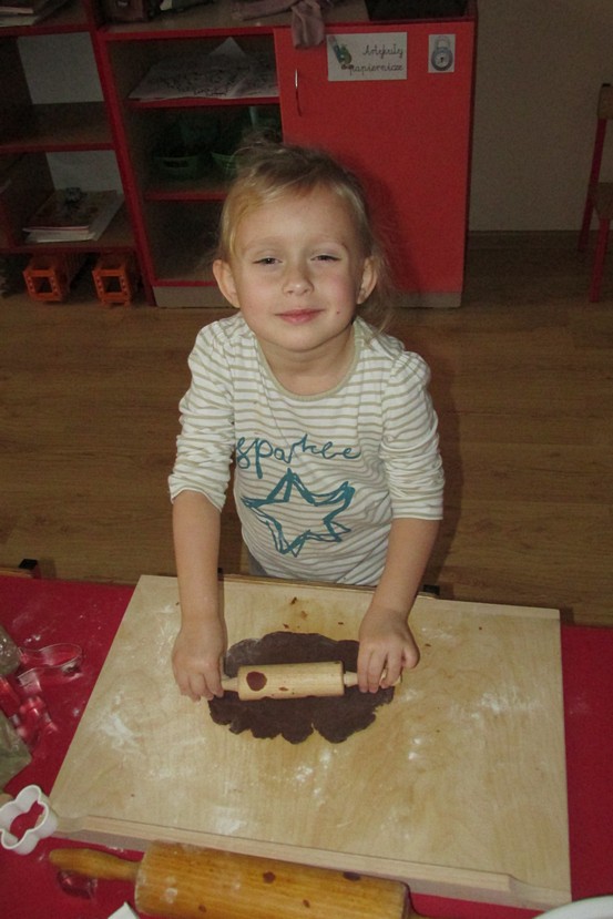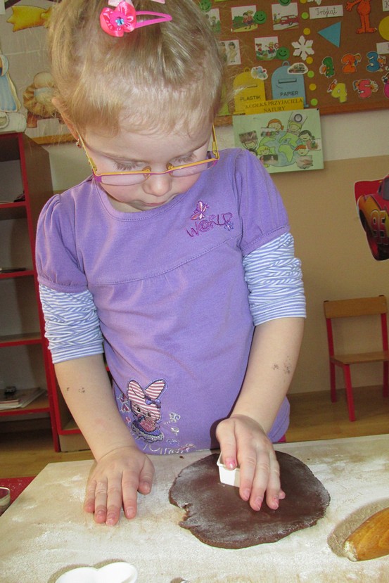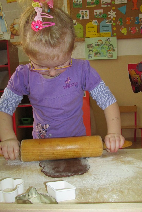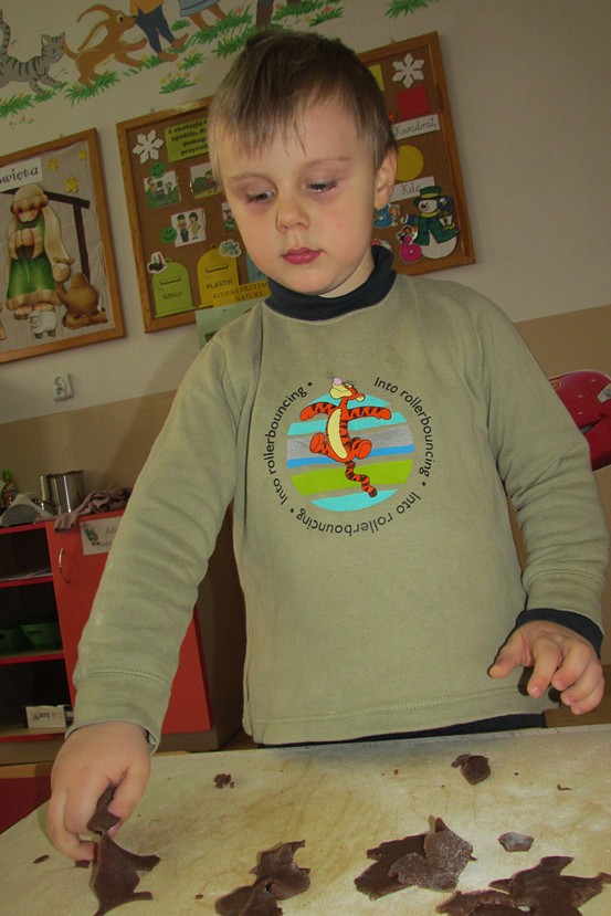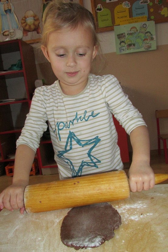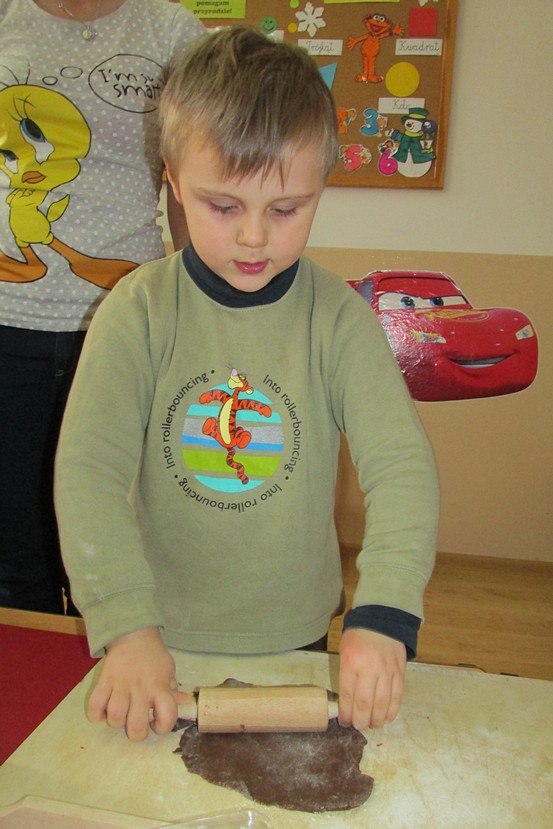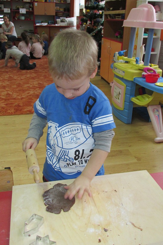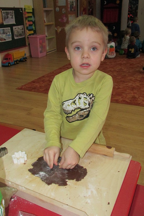 Każde dziecko otrzymało kawałek ciasta, które musiało na początku rozwałkować , a następnie wykrawać z niego świąteczne kształty. Pani Ania i pani Ula służyły swoją pomocą przy tych działaniach, jednak okazało się, że wszyscy poradzili sobie doskonale!