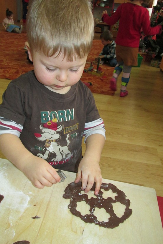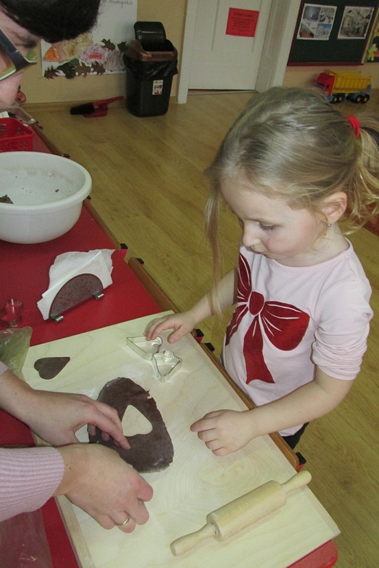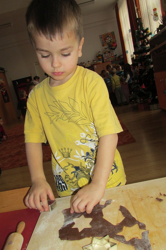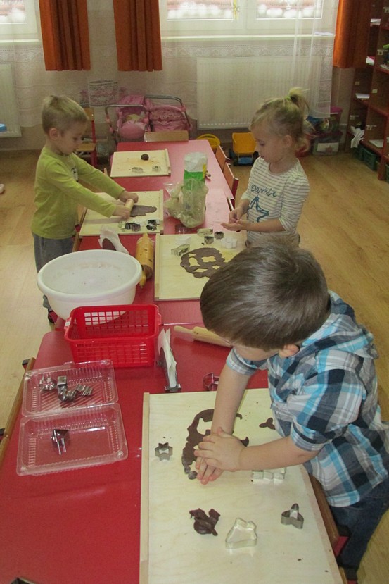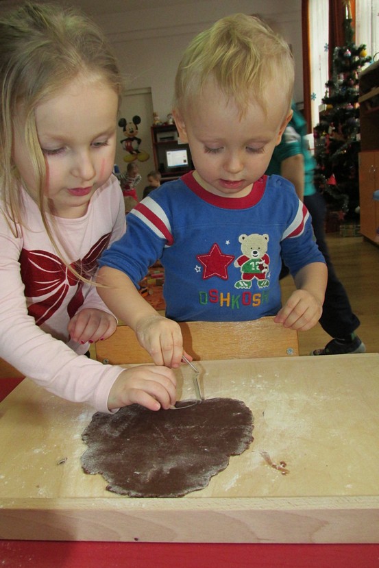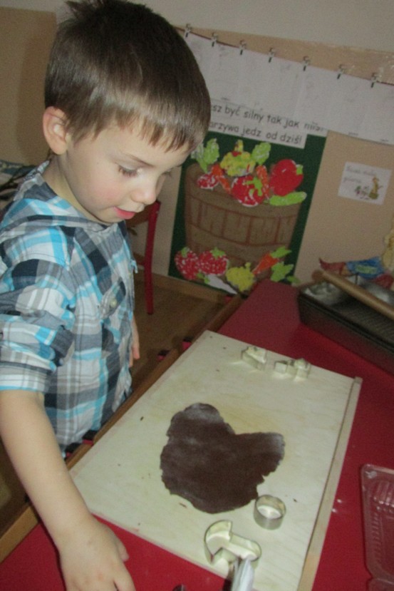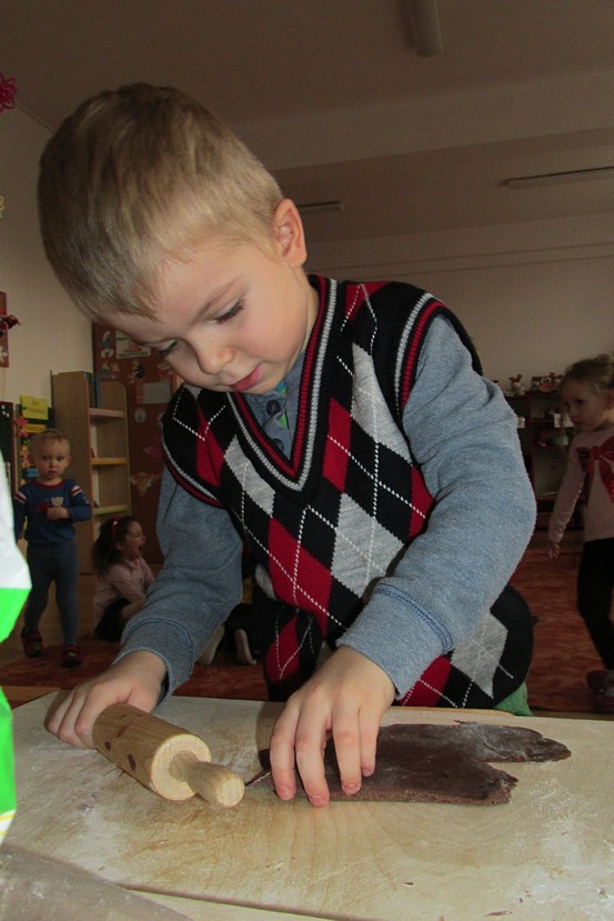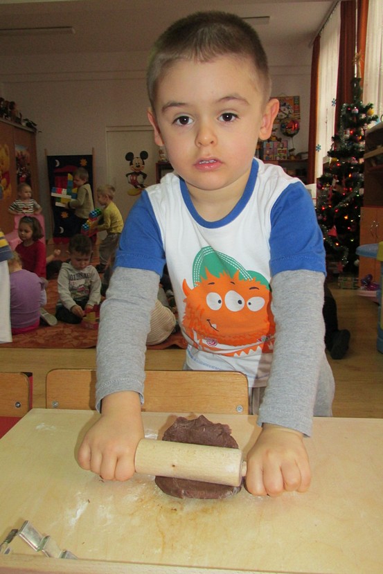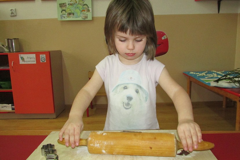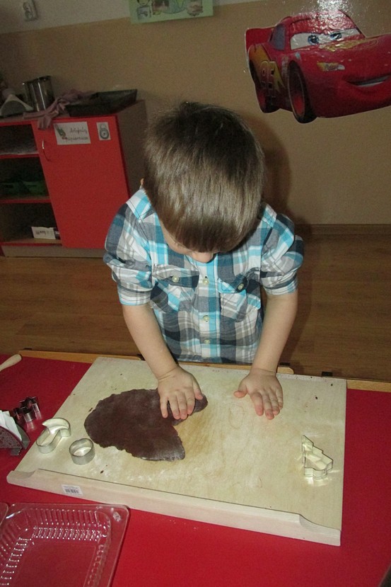 Każde dziecko otrzymało kawałek ciasta, które musiało na początku rozwałkować , a następnie wykrawać z niego świąteczne kształty. Pani Ania i pani Ula służyły swoją pomocą przy tych działaniach, jednak okazało się, że wszyscy poradzili sobie doskonale!