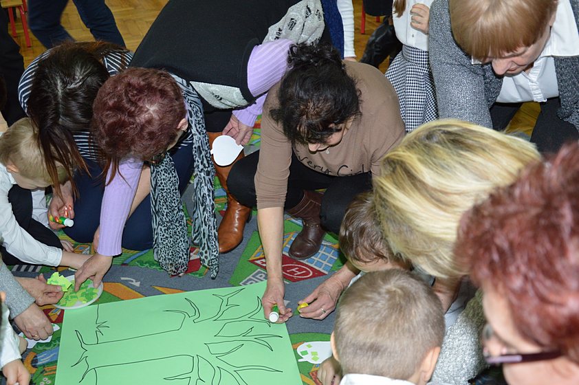 Po części oficjalnej nadszedł czas na chwilę wspólnej zabawy. Smyki i Asy zaprosiły swoich najbliższych do tańca, a także do wykonania zielonych drzewek, nawiązujących do tematu rocznego, który realizujemy w tym roku szkolnym. Zuchy wraz ze swoimi dziadkami udały się do swojej sali, by tak odpocząć i spędzić czas na radosnych rozmowach i zabawie.