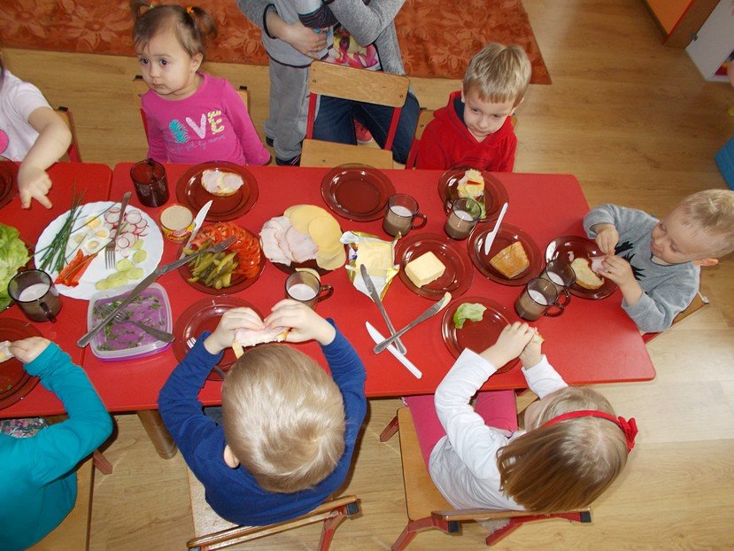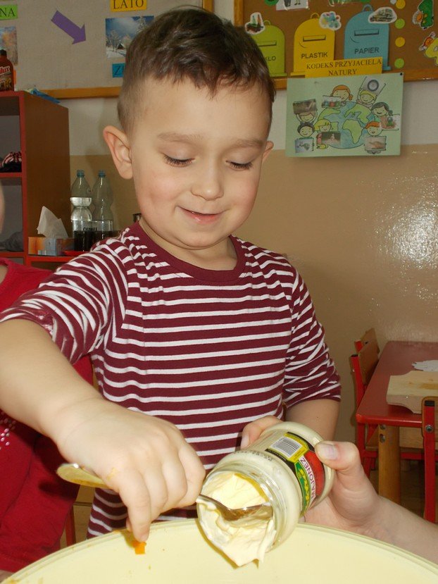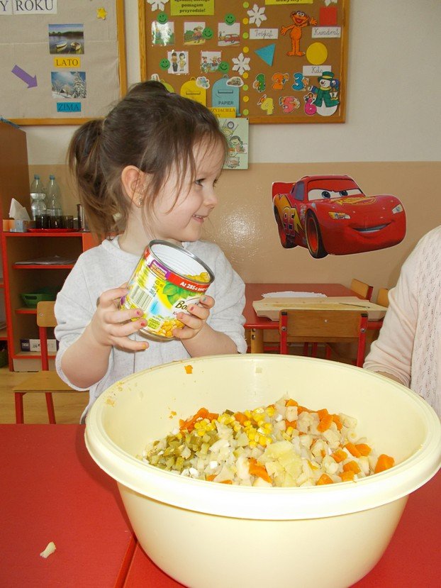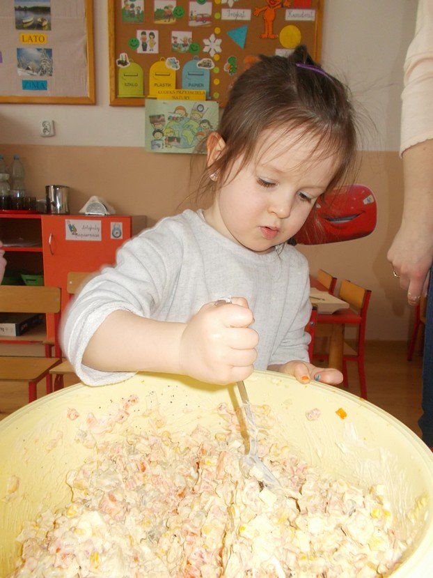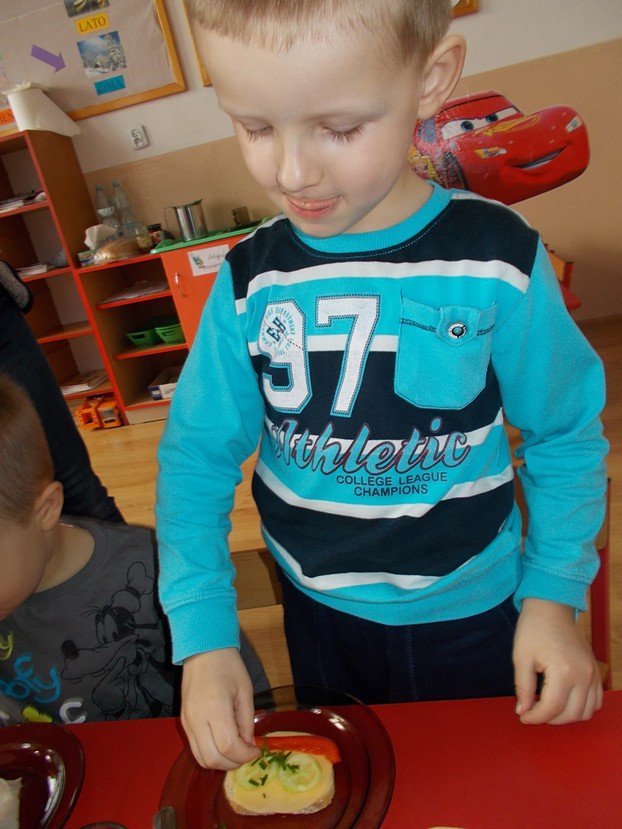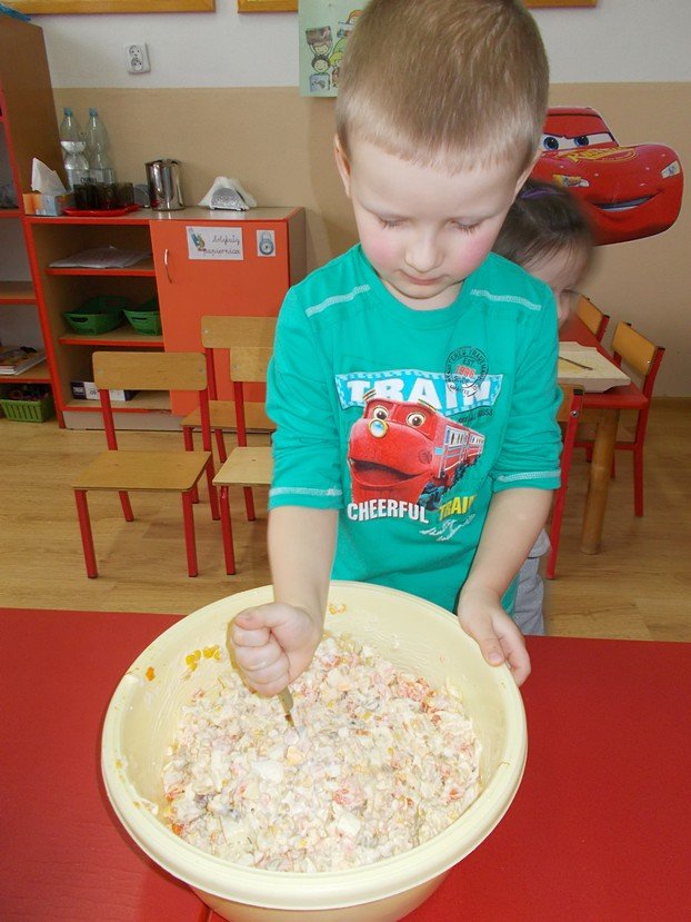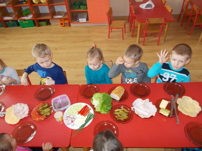 Oczywiście pani Ania i pani Paulina zadbały o to, by oprócz wiedzy teoretycznej, ich wychowankowie zdobyli również praktyczne umiejętności. Właśnie dlatego Promyczki przygotowały we środę – 4 lutego smakowite kanapki pełne witamin, natomiast w piątek 6 lutego – pyszną sałatkę jarzynową. Okazało się, że nawet największe niejadki mają smaczek na samodzielnie przygotowane specjały!