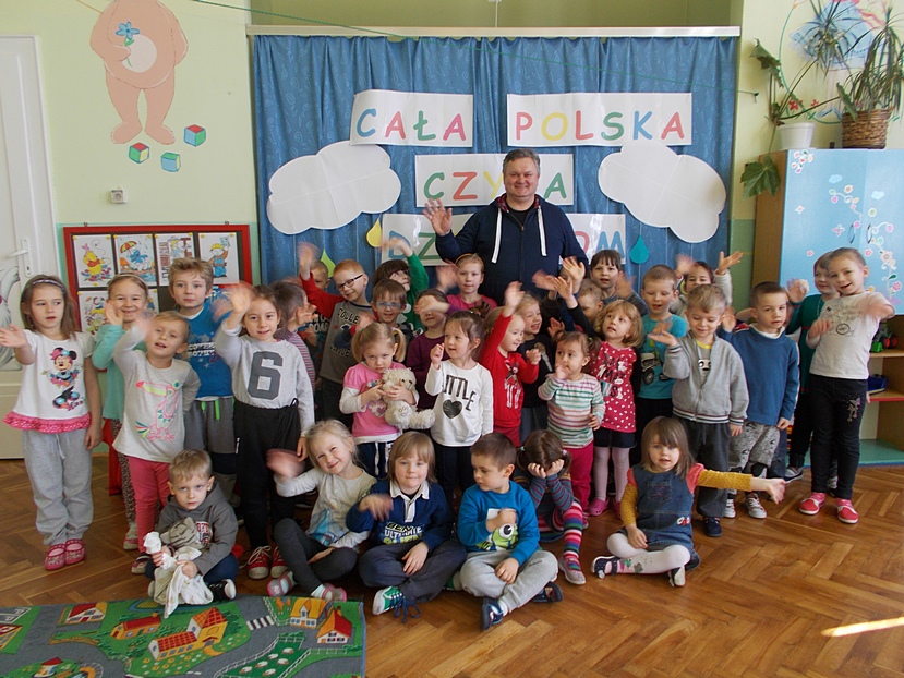 Wielkim zaskoczeniem dla dzieci była wizyta w naszym przedszkolu aktora teatru im. Ludwika Solskiego w Tarnowie - pana Jerzego Pala. Ten niezwykły gość odwiedził nas w poniedziałek - 9 marca 2015 roku na zaproszenie pani Pauliny. Spotkanie to wiązało się z uczestnictwem w kampanii "Cała Polska czyta dzieciom".