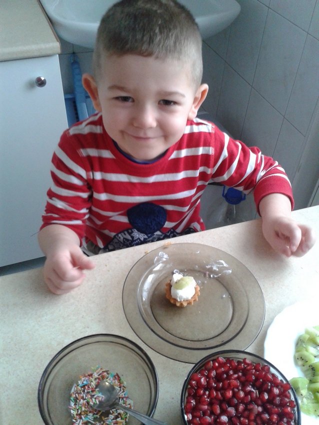W przedszkolnej kuchni obok, dzieci w ramach kółka kulinarnego przygotowały z pomocą pani Kingi pyszne babeczki z bitą śmietaną i owocami egzotycznymi. Po obiedzie mali kucharze poczęstowali smakołykami wszystkich kolegów i koleżanki.