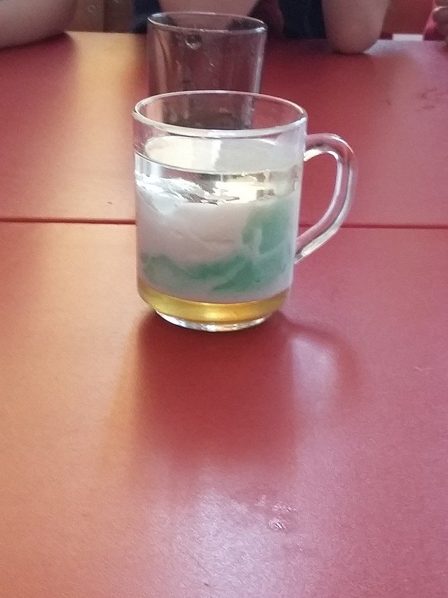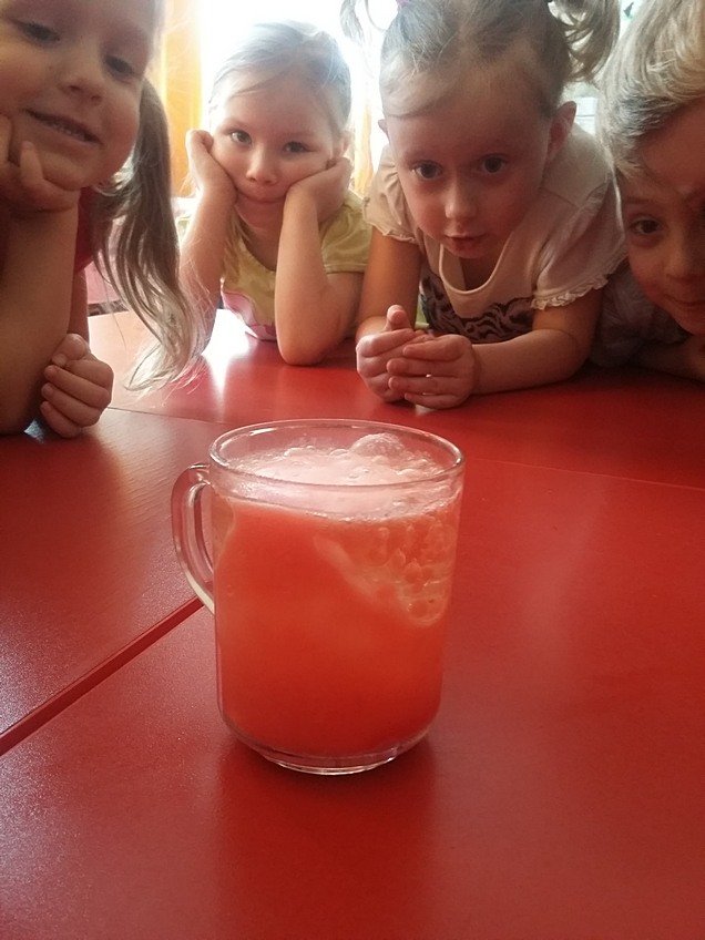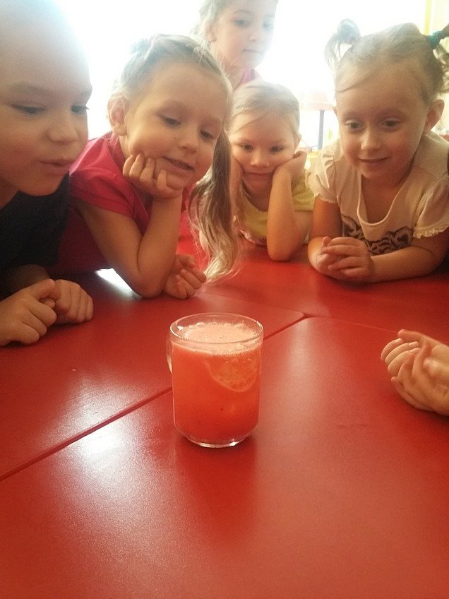 Dzieci wymyślały skojarzenia związane z gęstością, porównywały przedmioty znajdujące się w sali pod względem gęstości. Do wykonania doświadczenia wykorzystaliśmy wodę, mleko, miód, mydło w płynie, olej, kolorowe farby oraz tabletki musujące z których powstał kolorowy wulkan.