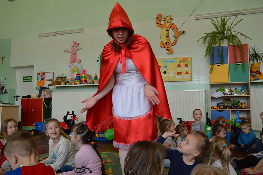 Pani Paulina wcieliła się w rolę Czerwonego Kapturka, kóry zagubił się idąc do swojej babci. Z pomocą dzieci, które napotkały wiele ciekawym zadań, udało się pomóc zagubionej dziewczynce, która mogła wrócić do swojej bajki i pójść do babci.