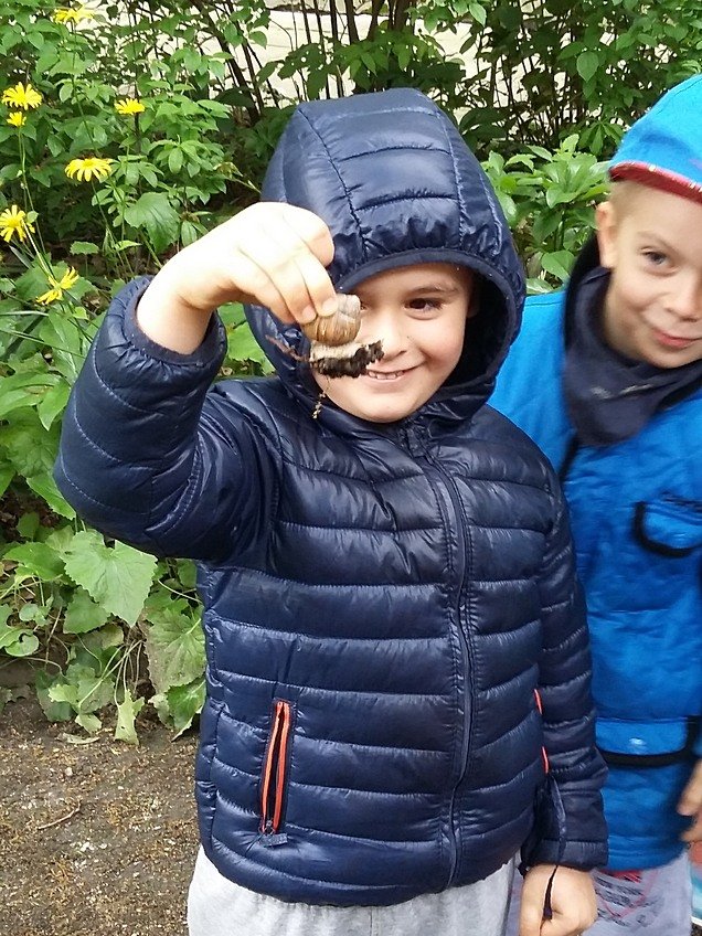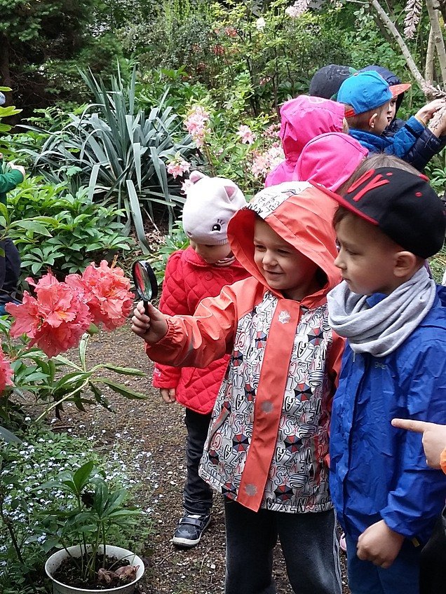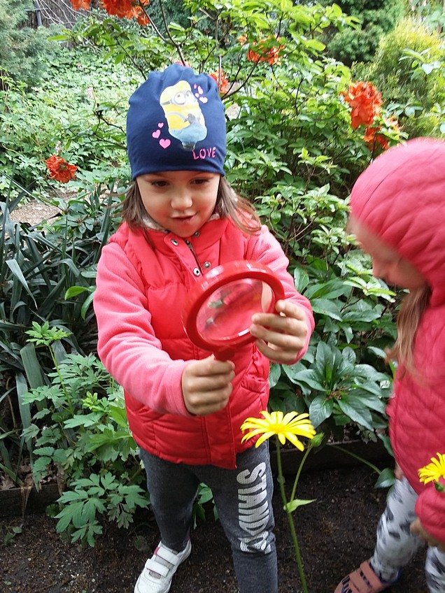 Tym razem postanowiliśmy z bliska obejrzeć rośliny, kwiaty oraz zwierzątka żyjące w naszym pięknym ogrodzie. Dzieci zaopatrzone w lupy z ogromną ciekawością obserwowały kwitnące kwiaty. Udało nam się również odnaleźć ślimaka- mieszkańca naszego ogrodu.