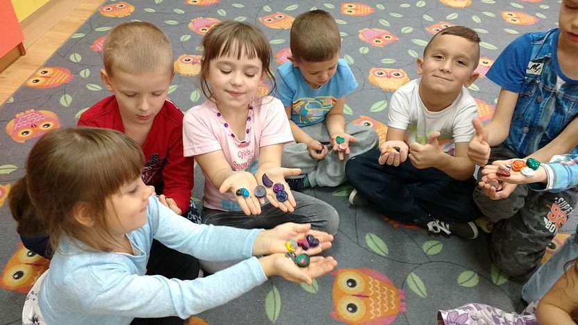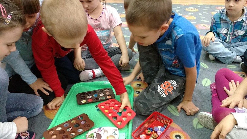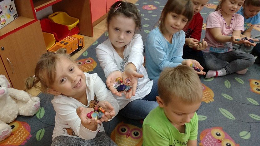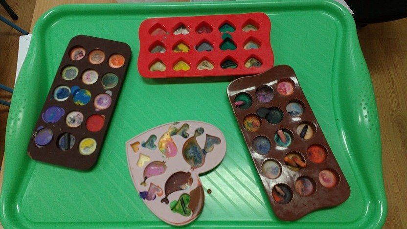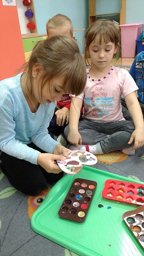 Po powrocie mogliśmy oglądać cudne kolorowe kredki, które stały się istnymi dziełami sztuki! Dzieci puściły wodze fantazji i mieszały kolory, dzięki czemu powstały ciekawe odcienie i mieszanki barw. Teraz czeka nas malowanie serduszkami, ptaszkami i innymi recyklingowymi cudami.