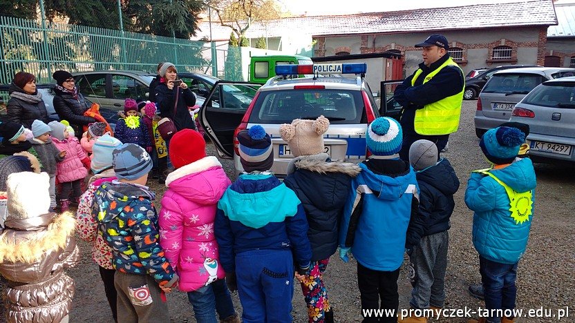 15 listopada gościliśmy w naszym Promyczku przemiłego gościa - sierżanta sztabowego Marcina Lamota. Pan policjant przybliżył nam nieco swoją profesję, a także zaprezentował atrybuty niezbędne do wykonywania działań policyjnych. Tradycyjnie już mogliśmy także obejrzeć z bliska radiowóz policyjny, odważne Promyczki wsiadły do środka tego wspaniałego auta!