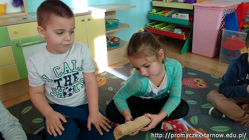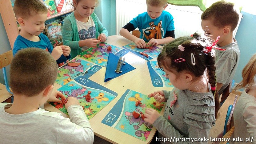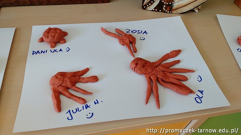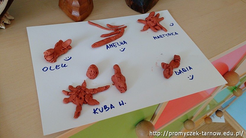 Na początek dzieci oglądały rzeźby przyniesione przez panią Ulę - były to dzieła wykonane z drewna. Następnie przyszedł tworzyły rzeźby z samych siebie i swoich kolegów. Na koniec czas na poznanie właściwości gliny i zabawę w rzeźbiarzy - tworzenie zwierząt udomowionych i dzikich z dostępnej masy. Promyczki uznały, że praca z gliną wcale nie jest prosta i każdy rzeźbiarz musi się natrudzić, aby osiągnąć zadowalający efekt.