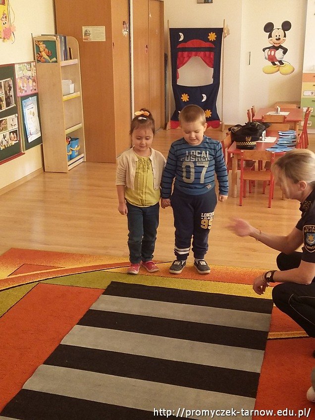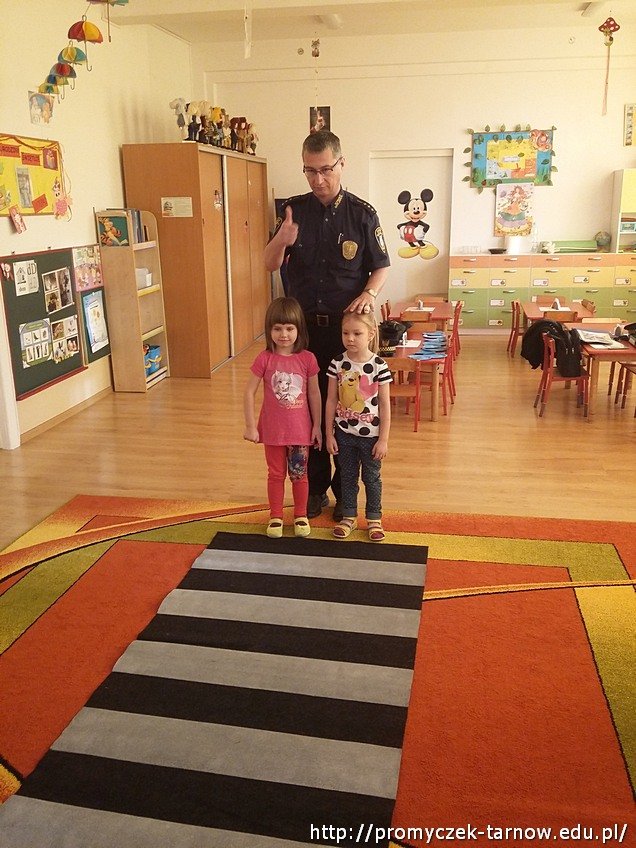 Prawdziwą gratką okazał się przyniesiony przez gości dywan- "zebra", za pomocą którego dzieci uczyły się jak bezpiecznie przechodzić przez jezdnię. Na koniec dzieci otrzymały odblaski aby już zawsze były widoczne i bezpieczne.