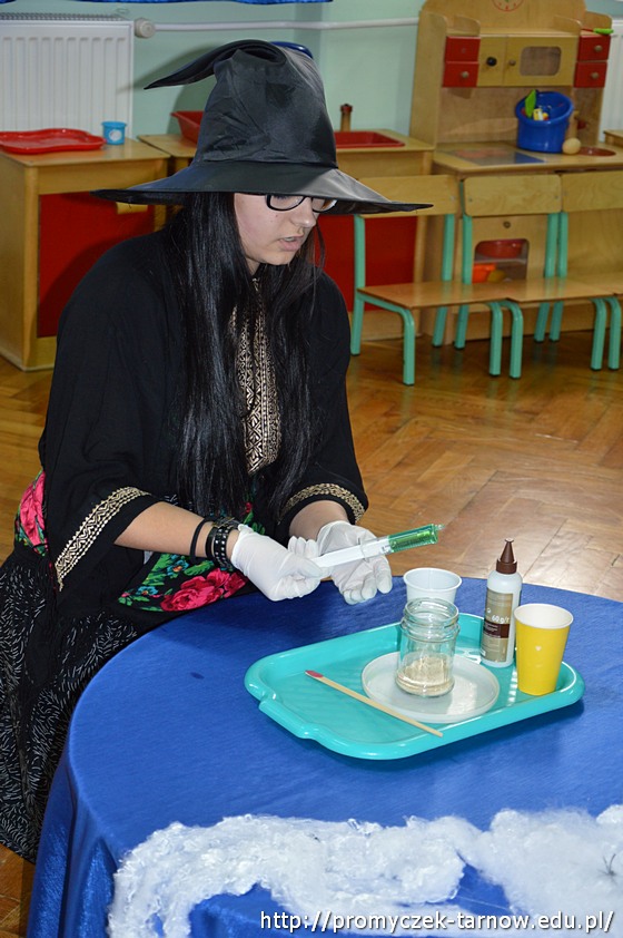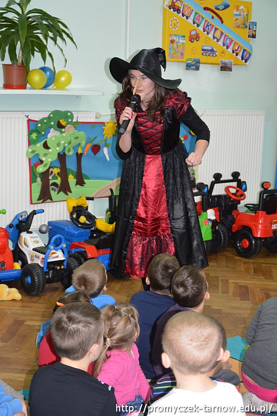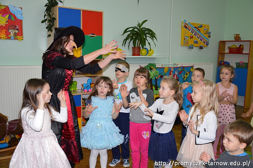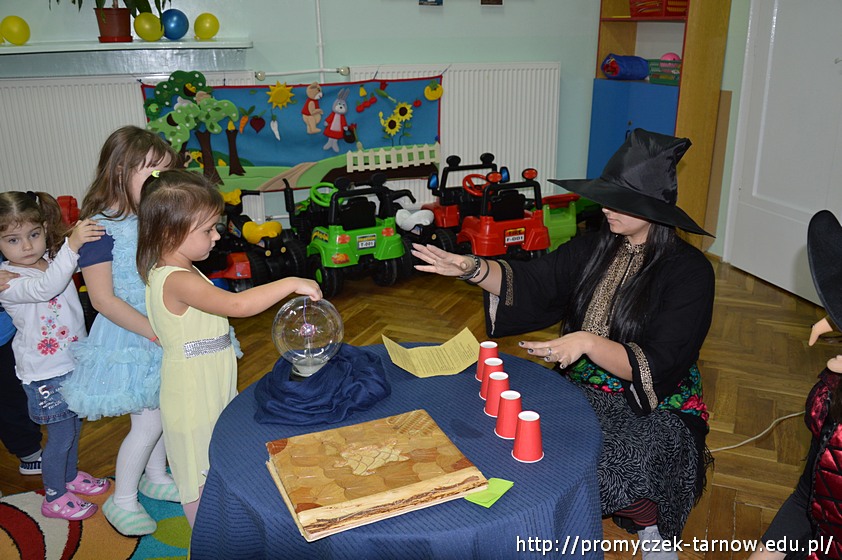 Sala w magiczny sposób zamieniła się w tajemnicze miejsca pełne balonów, czarnych kotów i ... czarownic! Był pokaz magicznej sztuczki, wróżenie z kapelusza i czarodziejskiego koszyczka. Nie zabrakło także czarodziejskich zaklęć, wróżenia za pomocą wirującej butelki oraz słodkich ciasteczek z wróżbą na przyszłość. Wróżby przeplatane były tańcami przy muzyce w towarzystwie czarownic.