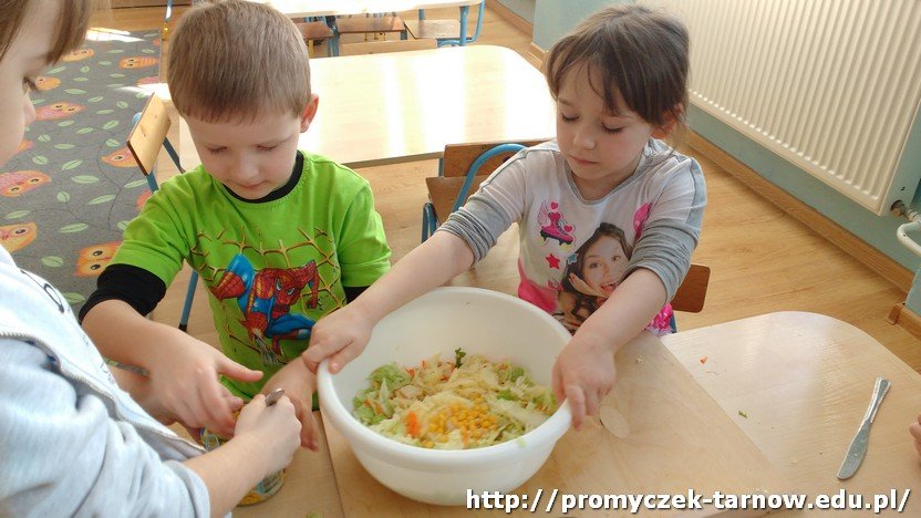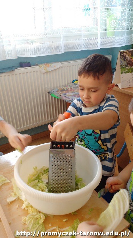 Jedną z piosenek, jaką często można usłyszeć w naszym przedszkolu jest utwór "Witaminki, witaminki" Fasolek. Nasze dzieci wiedzą, że należy jeść warzywa i owoce, ale kiedy przyjdzie czas obiadu niechętnie sięgają po surówki. Pani Ula postanowiła zachęcić dzieci do spożywania tych bomb witaminowych i wspólnie z dziećmi przygotować surówkę.