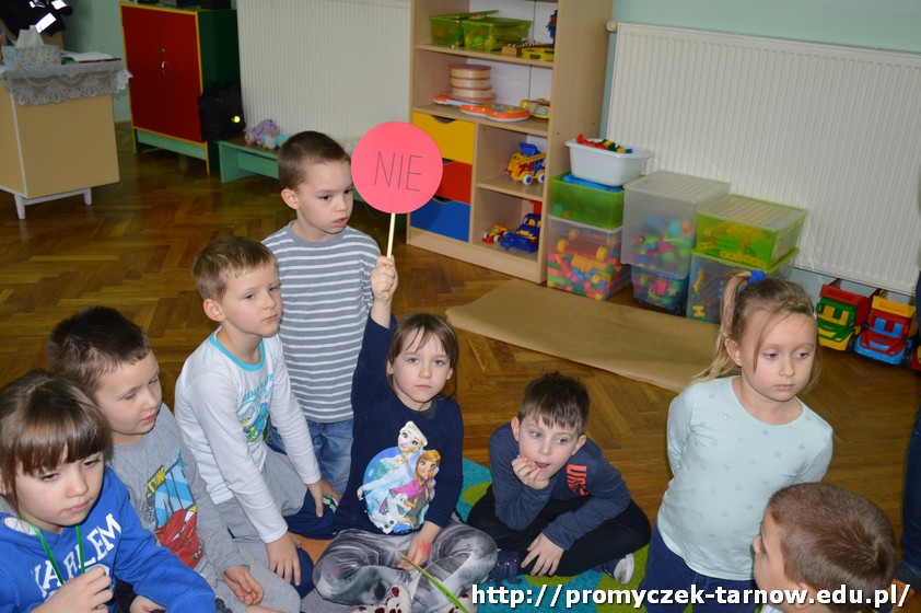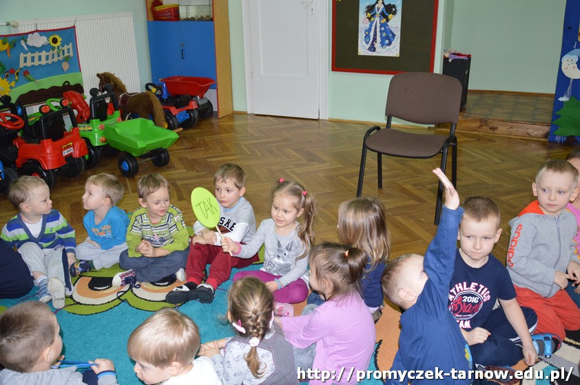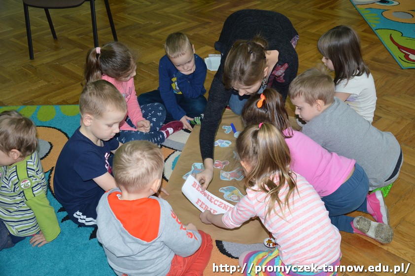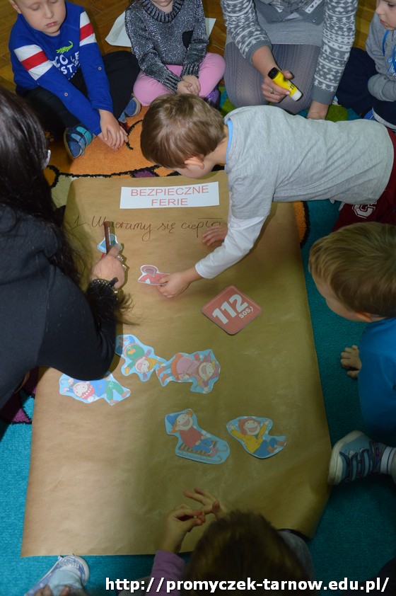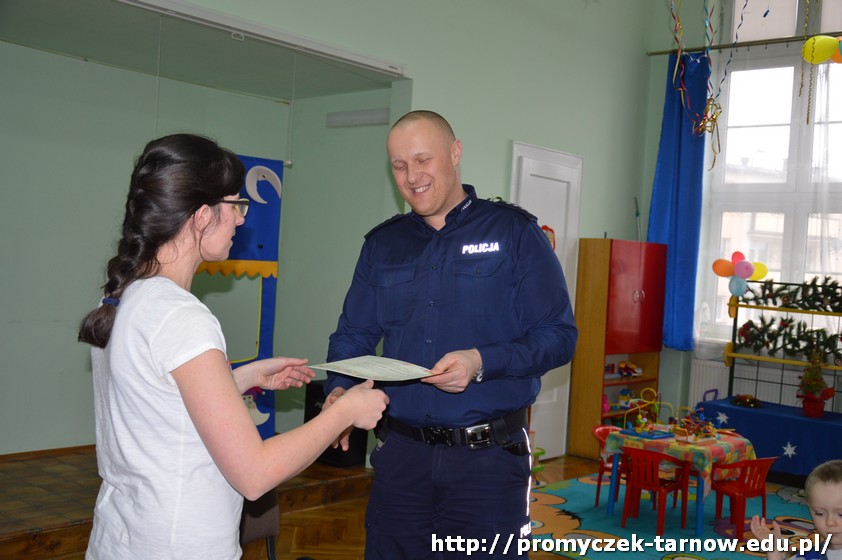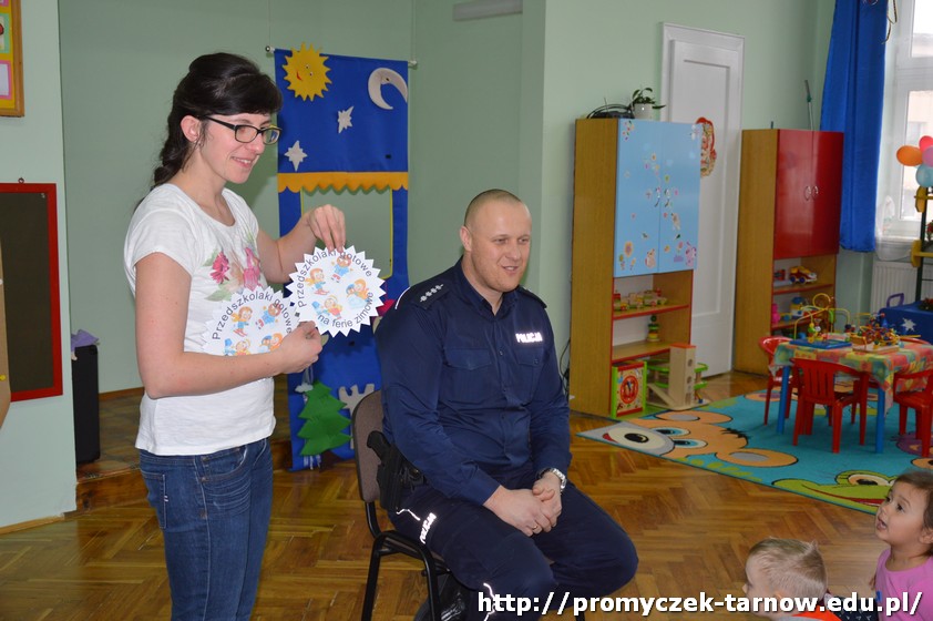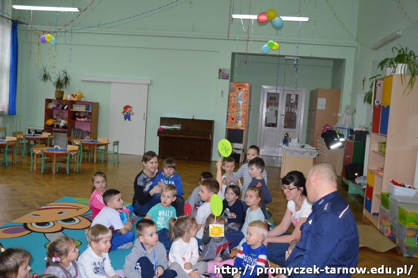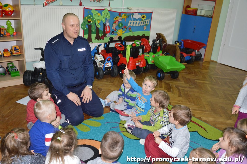 Głównym celem wizyty było zwrócenie uwagi na bezpieczeństwo zabaw podczas ferii zimowych, które właśnie trwają. Poprzez różnorodne zagadki i zabawy dzieci przypominały sobie jak korzystać z zimowych sprzętów, gdzie się bawić, jak się właściwie ubrać itp. Pan dzielnicowy przypomniał także o konieczności noszenia odblasków.