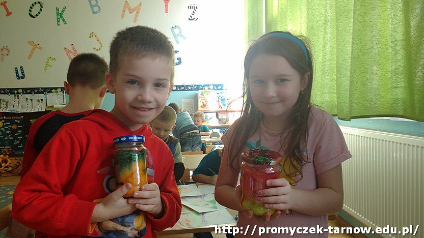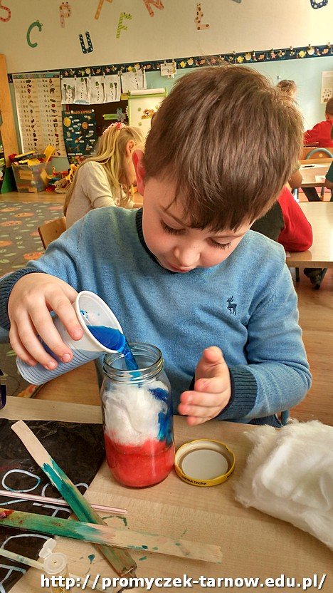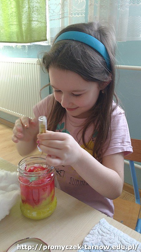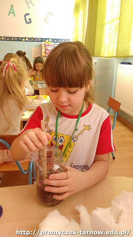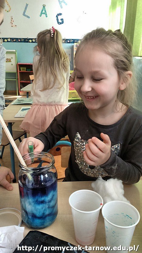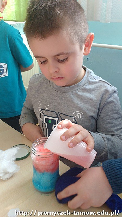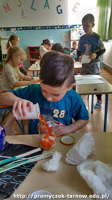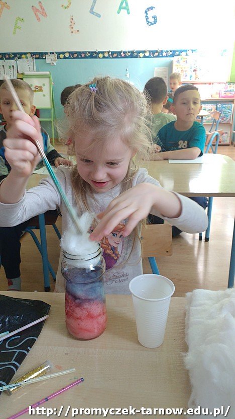 Wszystko działo się podczas środowych zajęć. Wystarczyła wata, woda z barwnikiem i trochę brokatu, aby zwykły słoik zmienił się w fascynujące i mieniące się kolorami dzieło. Zapraszamy do zapoznania się z efektem naszych prac.