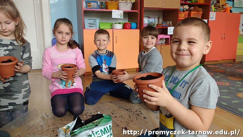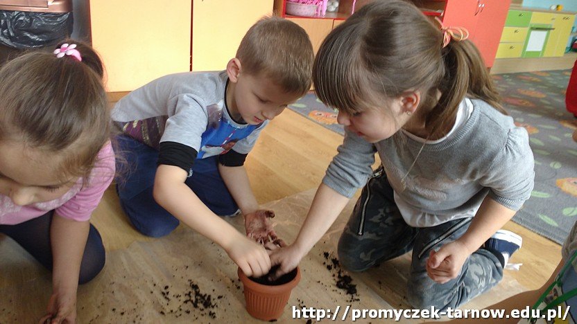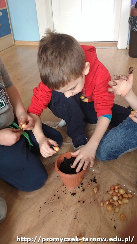 Dzieci najpierw obejrzały dokładnie cebule, zastanawiając się jednocześnie skąd biorą się rośliny. Następnie szczegółowo omówiły z panią Ulą jak wyglądają kolejne etapy w rozwoju roślin i co jest im potrzebne do wzrostu. Na koniec wszyscy przystąpili do najciekawszej części - sadzenia. Zabawy było wiele, uśmiech nie schodził z twarzy, a brud z rąk. Warto dodać, że to jeszcze nie było nasze ostatnie słowo w kwestiach ogrodniczych!