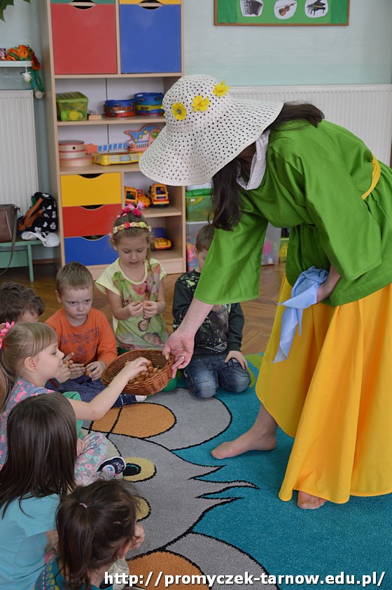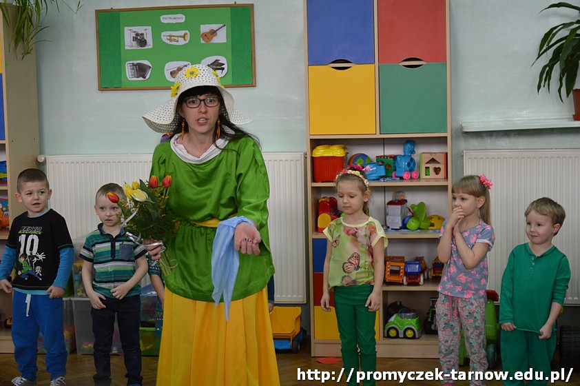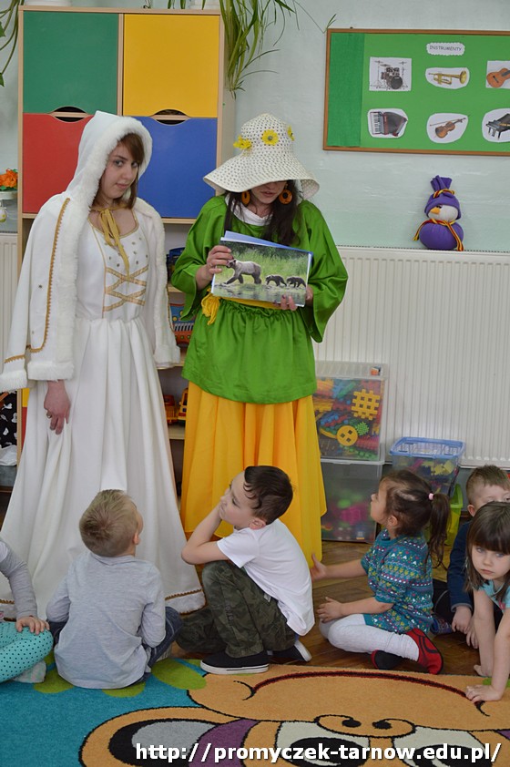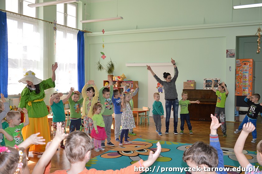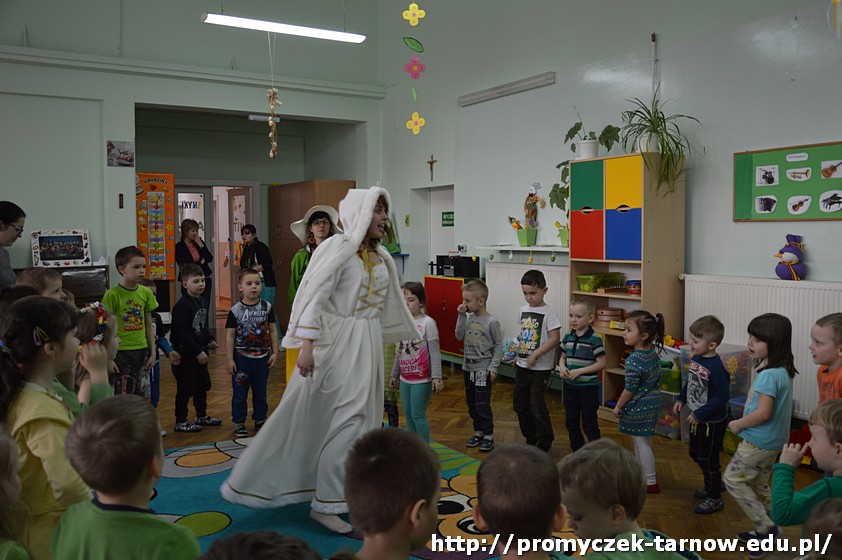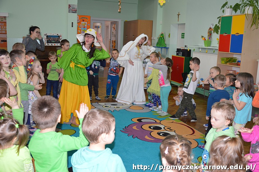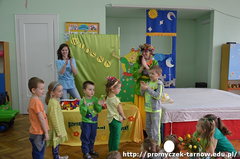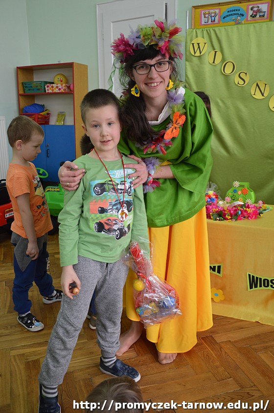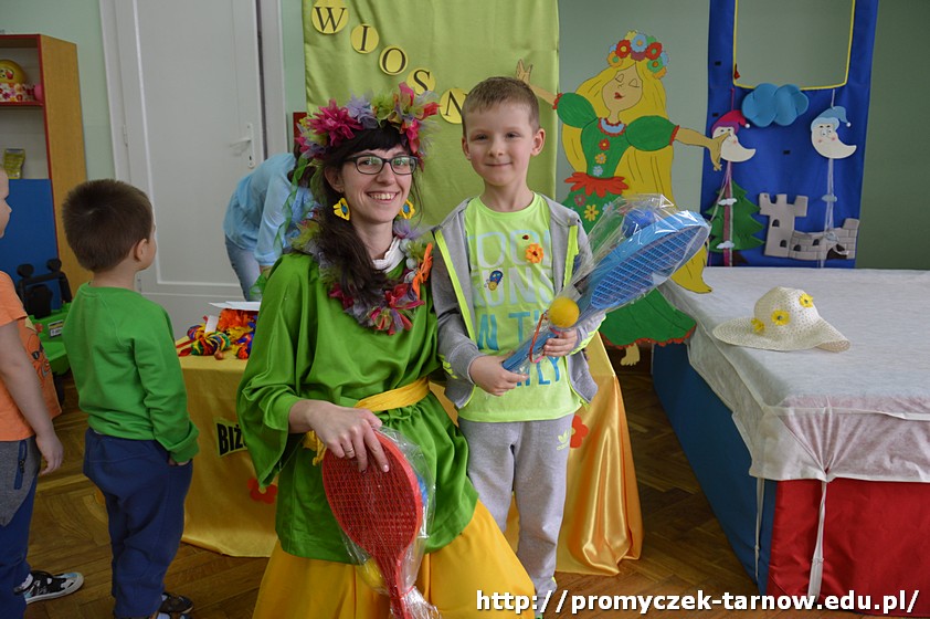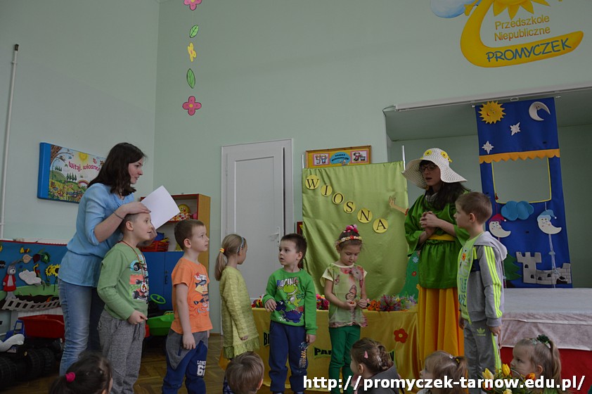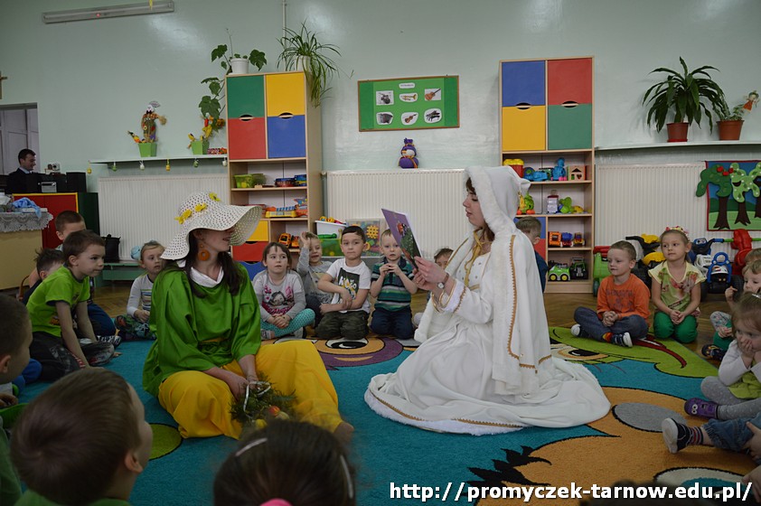 Następnie przedszkolaki uczestniczyły w uroczystości powitania Wiosny, podczas którego dwie siostry - Wiosna i Zima, spierały się o to, która z nich ma objąć panowanie nad przyrodą. W związku z tym dzieci mogły wziąć udział w zabawach i konkursach, które ostatecznie doprowadziły do zwycięstwa Pani Wiosny.